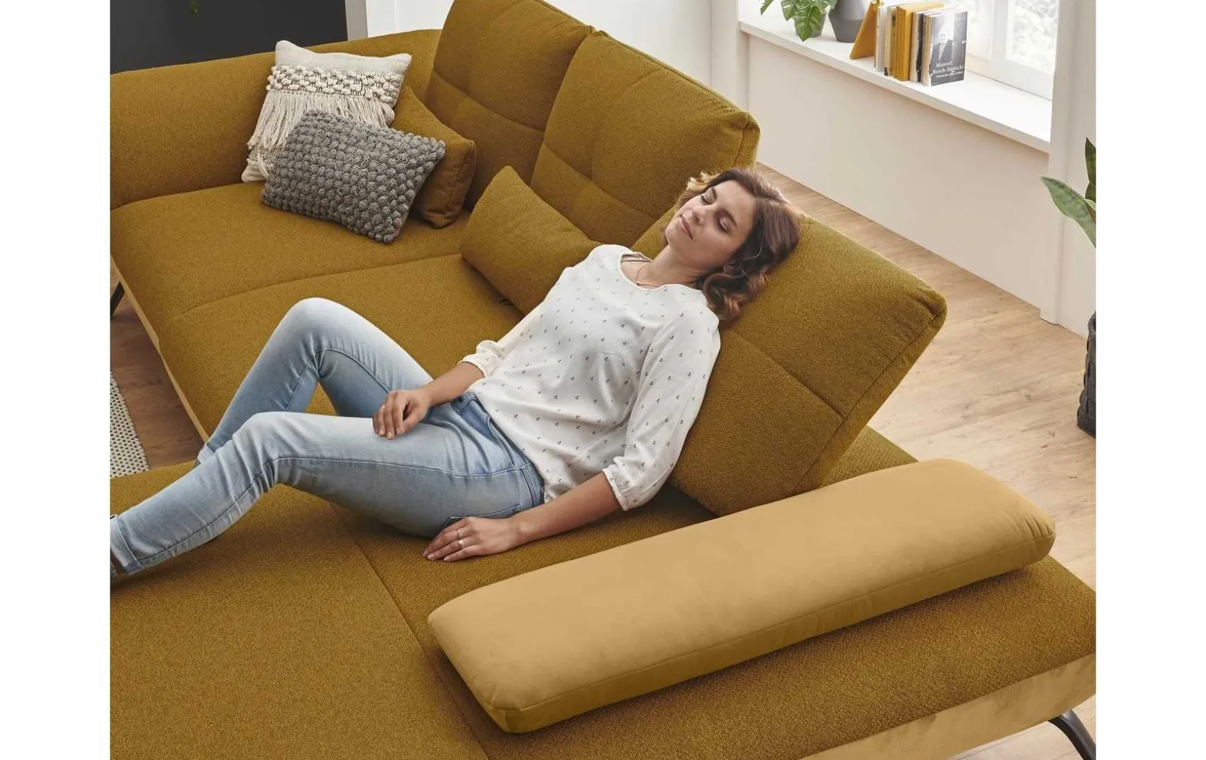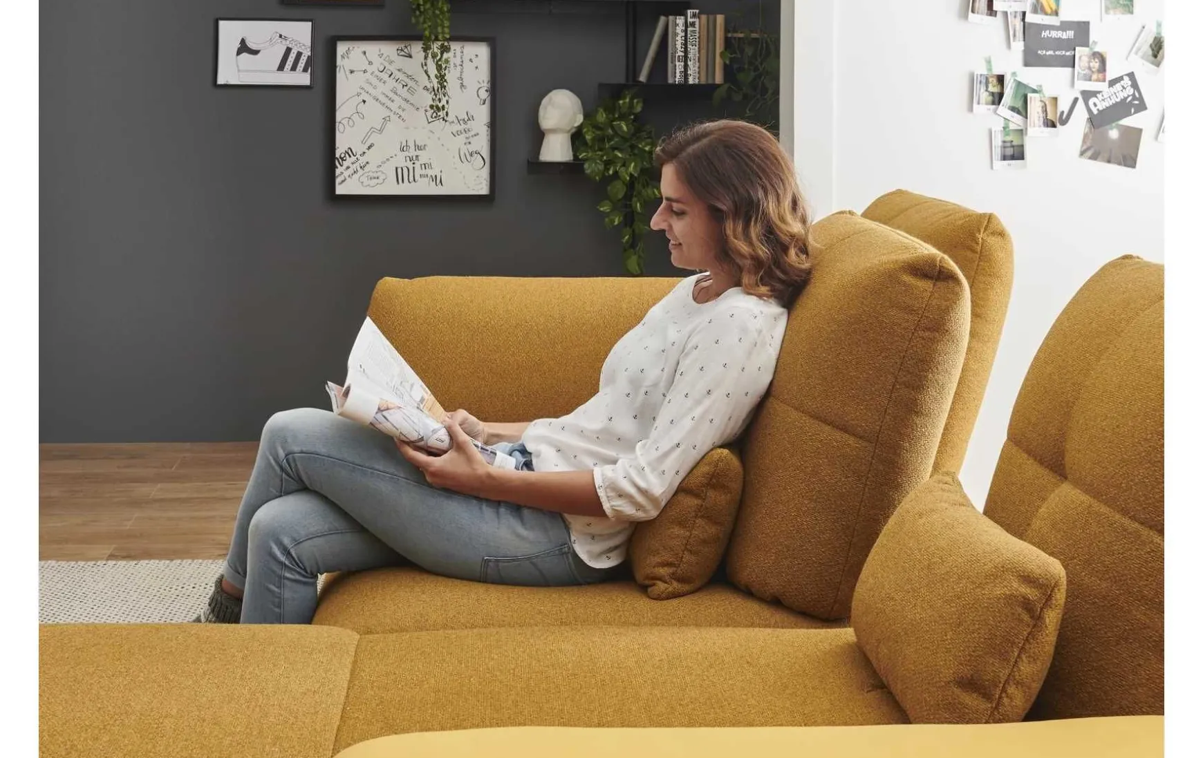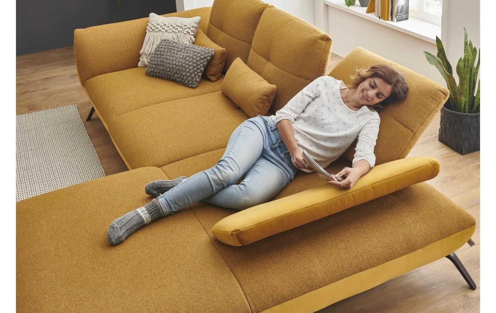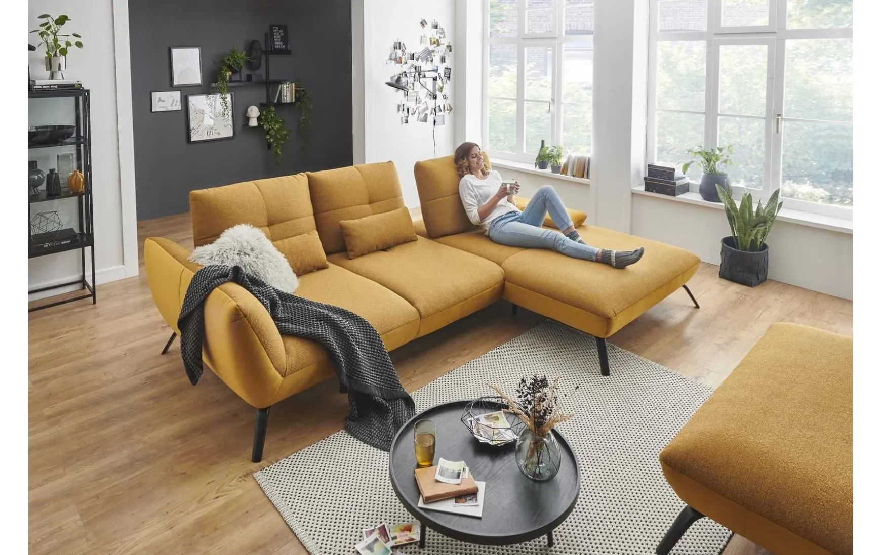 Diese moderne Polsterecke mit 3-Sitzer und Longchair verbindet stilvolles Design mit hohem Sitzkomfort und flexibler Funktionalität. Der edle Stoffbezug in Riviera Gold setzt einen eleganten Akzent und macht die Couch zum echten Blickfang im Wohnraum. Dank L-Form eignet sie sich ideal für großzügige Wohnkonzepte und lädt zum Entspannen ein. Für individuellen Komfort sorgen die drei verstellbaren Schwenkrücken, die sich flexibel an Ihre Sitz- und Liegeposition anpassen lassen. Zusätzlich erhöhen die inkludierten Nierenkissen den ergonomischen Sitzkomfort – perfekt für lange Abende auf dem Sofa. Der Kaltschaumsitz bietet eine angenehme Balance aus Weichheit und Unterstützung, während der echt bezogene Rücken eine freie Platzierung im Raum ermöglicht. Das stabile Metallgestell mit schwarzen, matten Füßen unterstreicht den modernen Look und sorgt für sicheren Stand. Die Polsterecke wird vormontiert geliefert und ist somit schnell einsatzbereit. Optional lässt sie sich gegen Mehrpreis individuell erweitern, z. B. mit Armteilverstellung, Rückenneigung oder einem passenden Hocker.