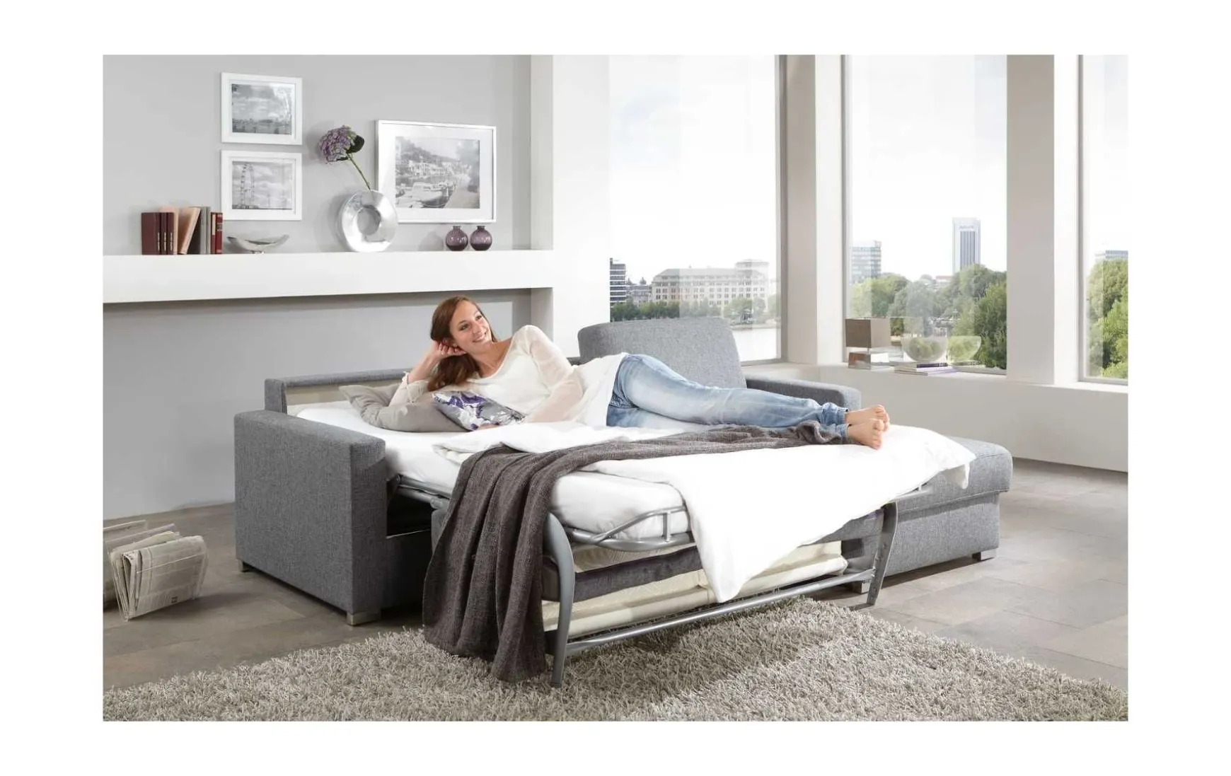 Praktischerweise können Sie die Armlehnen abklappen und die Funktionsecke einfach »auffalten«, wenn Gäste bei Ihnen übernachten möchten.