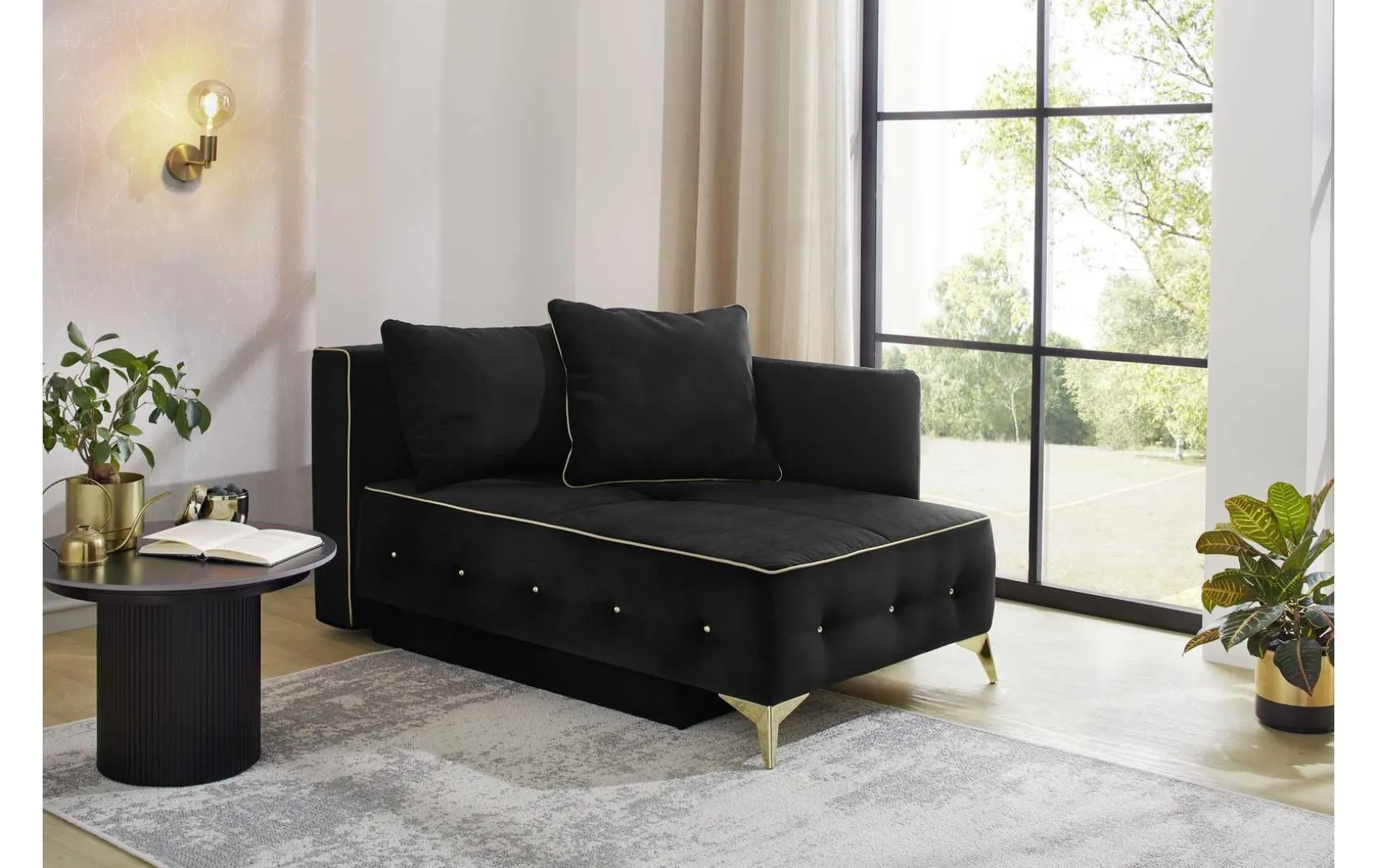 Diese moderne Recamiere in elegantem Schwarz überzeugt durch ihr stilvolles Design und hohen Komfort. Der samtartige Stoffbezug verleiht dem Möbelstück eine besonders edle Optik und sorgt gleichzeitig für ein angenehmes Sitz- und Liegegefühl. Dank der integrierten Schlaffunktion lässt sich die Recamiere im Handumdrehen in eine komfortable Liegefläche von ca. 82 x 203 cm verwandeln – ideal für Gäste oder entspannte Ruhepausen. Die goldfarbenen Metallfüße setzen einen luxuriösen Akzent und runden das moderne Gesamtbild perfekt ab.