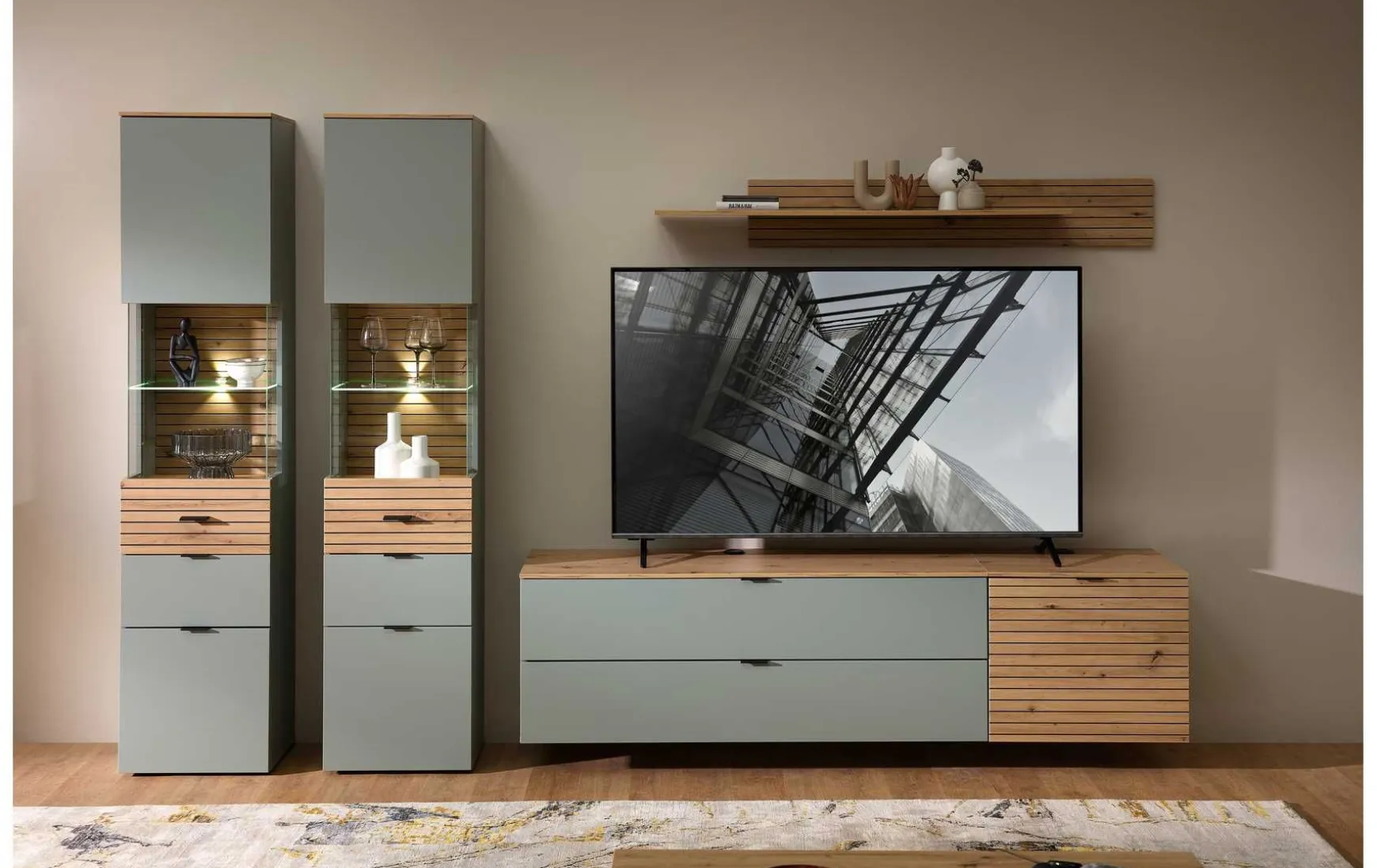 Diese moderne Vitrine verbindet stilvolles Design mit funktionalem Stauraum. Die Kombination aus Schilfgrün und Artisan Eiche verleiht dem Möbelstück eine elegante, zeitgemäße Ausstrahlung. Dank integrierter LED-Beleuchtung werden Ihre Lieblingsstücke wirkungsvoll in Szene gesetzt, während die Soft-Close-Tür für komfortables und leises Schließen sorgt.