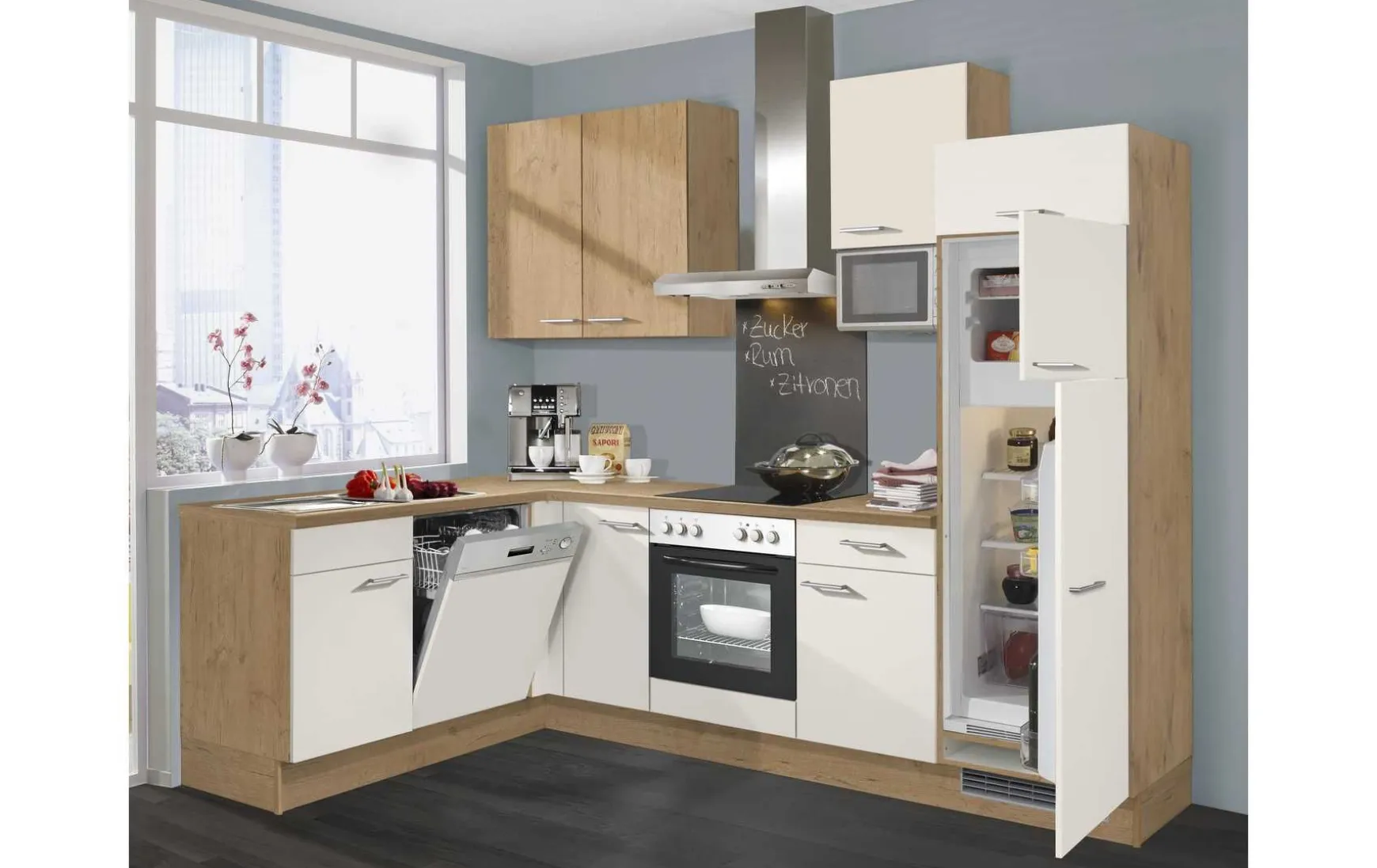 Sie wünschen sich von Ihrer neuen Küche ein zeitgemäßes Design, jede Menge Stauraum und eine hohe Funktionalität? Dann trifft diese Winkelküche sicher Ihren Geschmack. Die platzsparende Winkelküche vereint auch auf kleinem Raum eine komplette E-Geräte-Ausstattung inklusive Mikrowelle und viel Platz zum unterbringen und aufbewahren von Kochutensilien. In sachen Stauraum sind vor allem die Hängeschrank hervorzuheben. Alle Fronten begeistern mit einer matten Magnolia Farbe und lassen sich durch die Bügelgriffe in glänzendem Chrom abheben. Für eine natürliche Note sorgen Korpus und Arbeitsplatte in einer natürlich gemaserten Vintage Eiche Nachbildung. Eine Melaminharzbeschichtung verspricht eine hohe Strapazierfähigkeit der Oberflächen. Dank einer umlaufenden Dickkante können zudem keine störenden Fugen entstehen.
