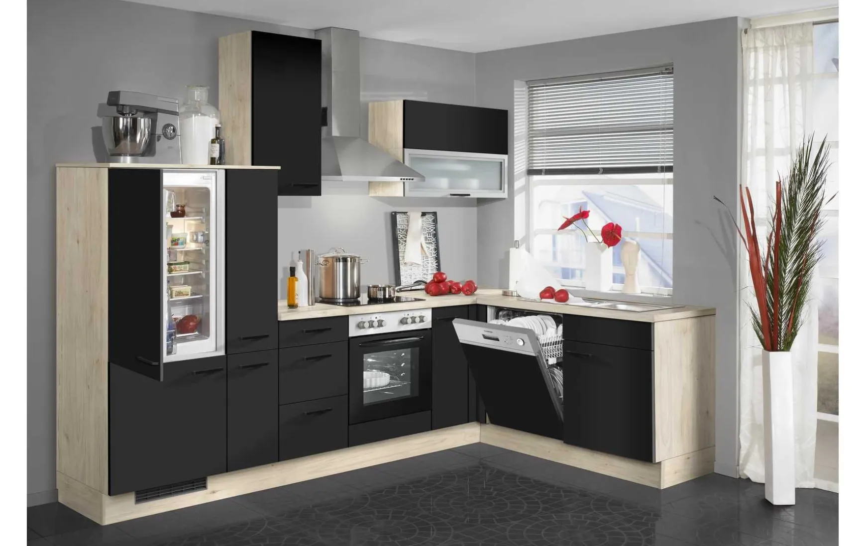 Eine harmonische Farbgestaltung und eine funktionale Ausstattung zeichnen die Winkelküche von Impuls aus. Die Fronten der Unterschränke sowie Hängeschränke präsentieren sich in Schwarz matt. Korpus, Arbeitsplatte sowie Sockel sind in farblich passender Seeahorn Nachbildung gestaltet. Seeahorn Nachbildung zeichnet sich durch eine helle Holz-Optik mit einer dunkleren Maserung aus und sorgt für eine warme Ausstrahlung. Um die Oberflächen vor Verkratzungen zu schützen, wurden diese mit strapazierfähigem Melaminharz beschichtet. Umlaufende Dickkanten sorgen für eine fugenlose Optik. Volle Funktionalität genießen Sie aufgrund der kompletten E-Geräte Ausstattung mit Kühlschrank und Backofen.