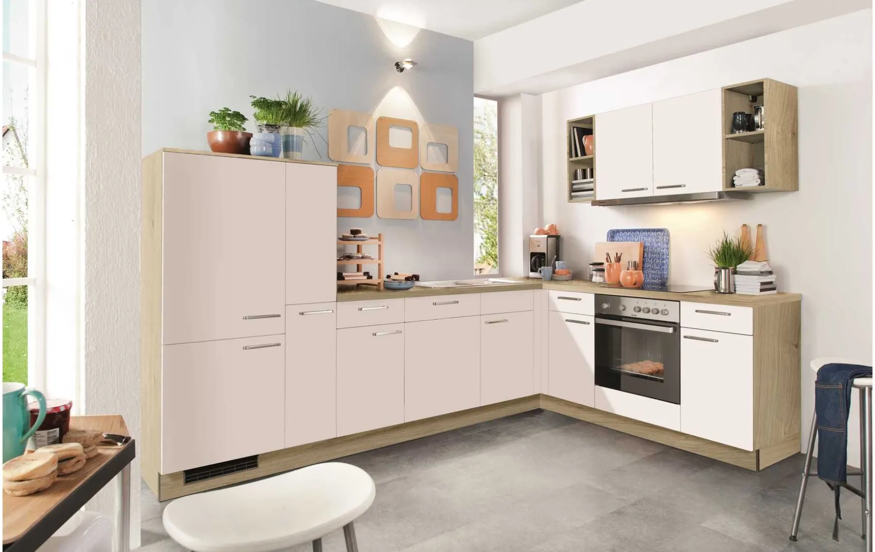 Sie möchten bei Ihrer neuen Küche keine Kompromisse in Bezug auf Design und Funktionalität machen? Dann ist diese Winkelküche sicher ganz nach Ihrem Geschmack. Mit den sehr harmonischen Farben Weiß matt und Wildeiche schaffen Sie eine angenehme Atmosphäre in Ihrer Küche. Melaminharz beschichtete Fronten sorgen für eine lange Haltbarkeit der Fronten. In der Highboardlösung ist der Kühlschrank, sowie ein Vorratsschrank untergebracht. In dieser Küche wird Ihnen das Arbeiten sicherlich viel Spaß machen.