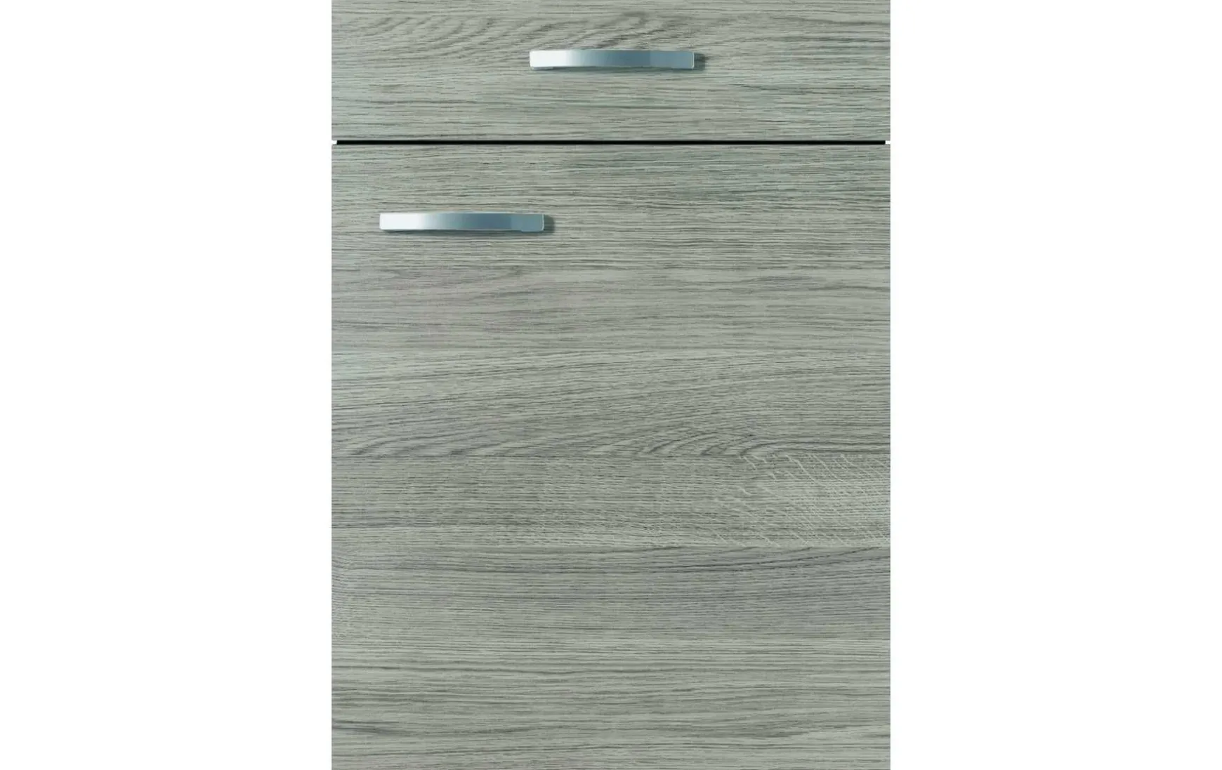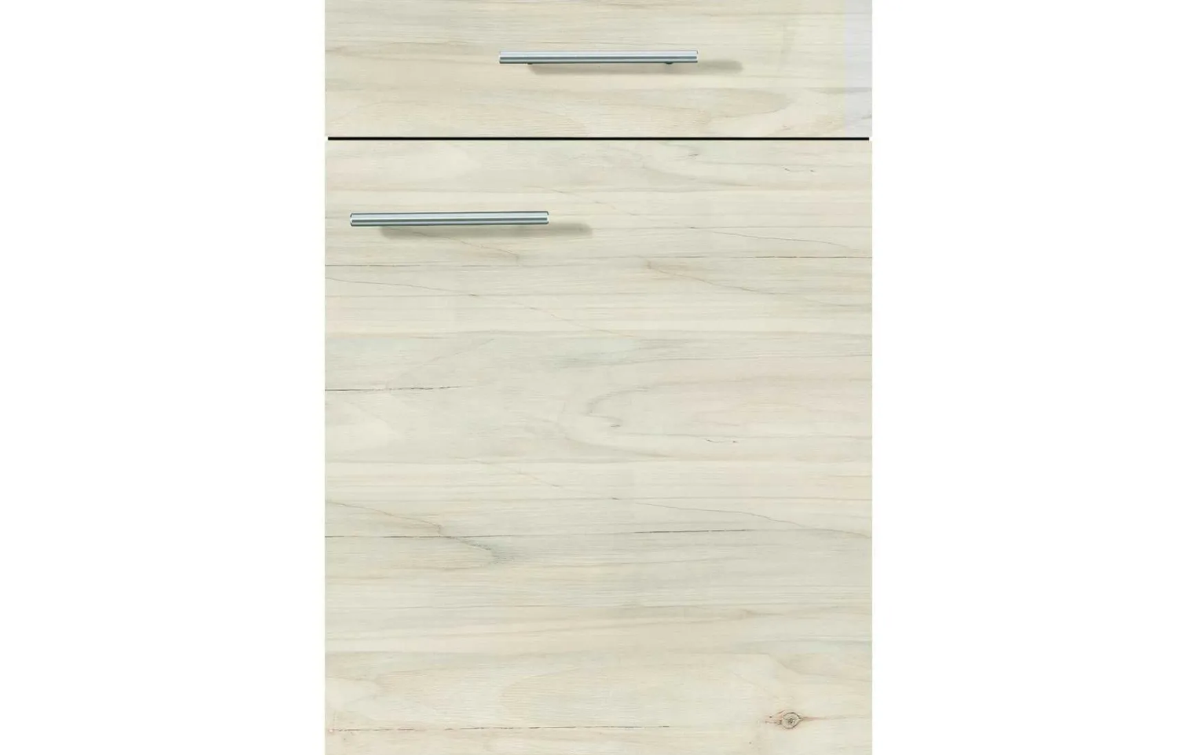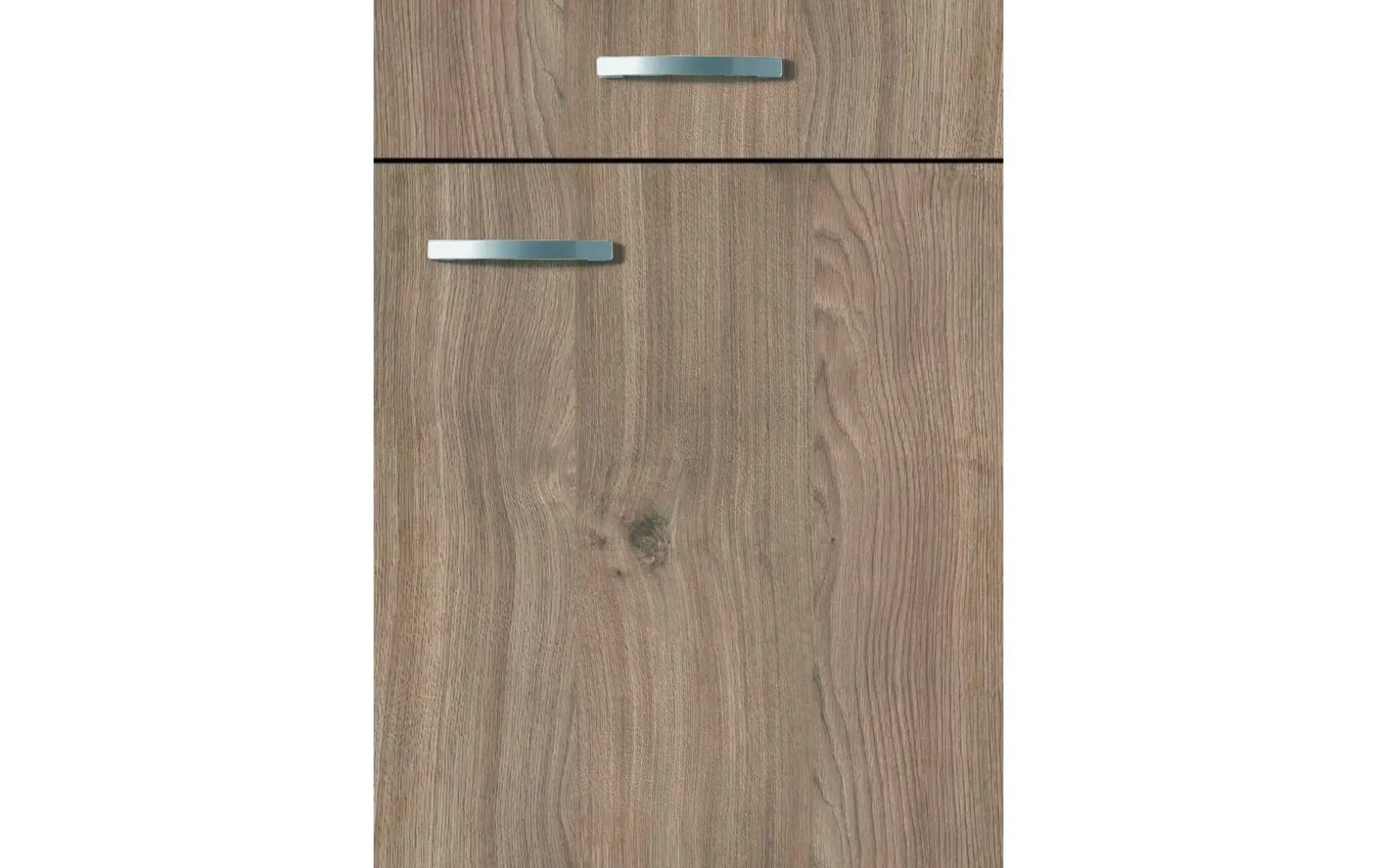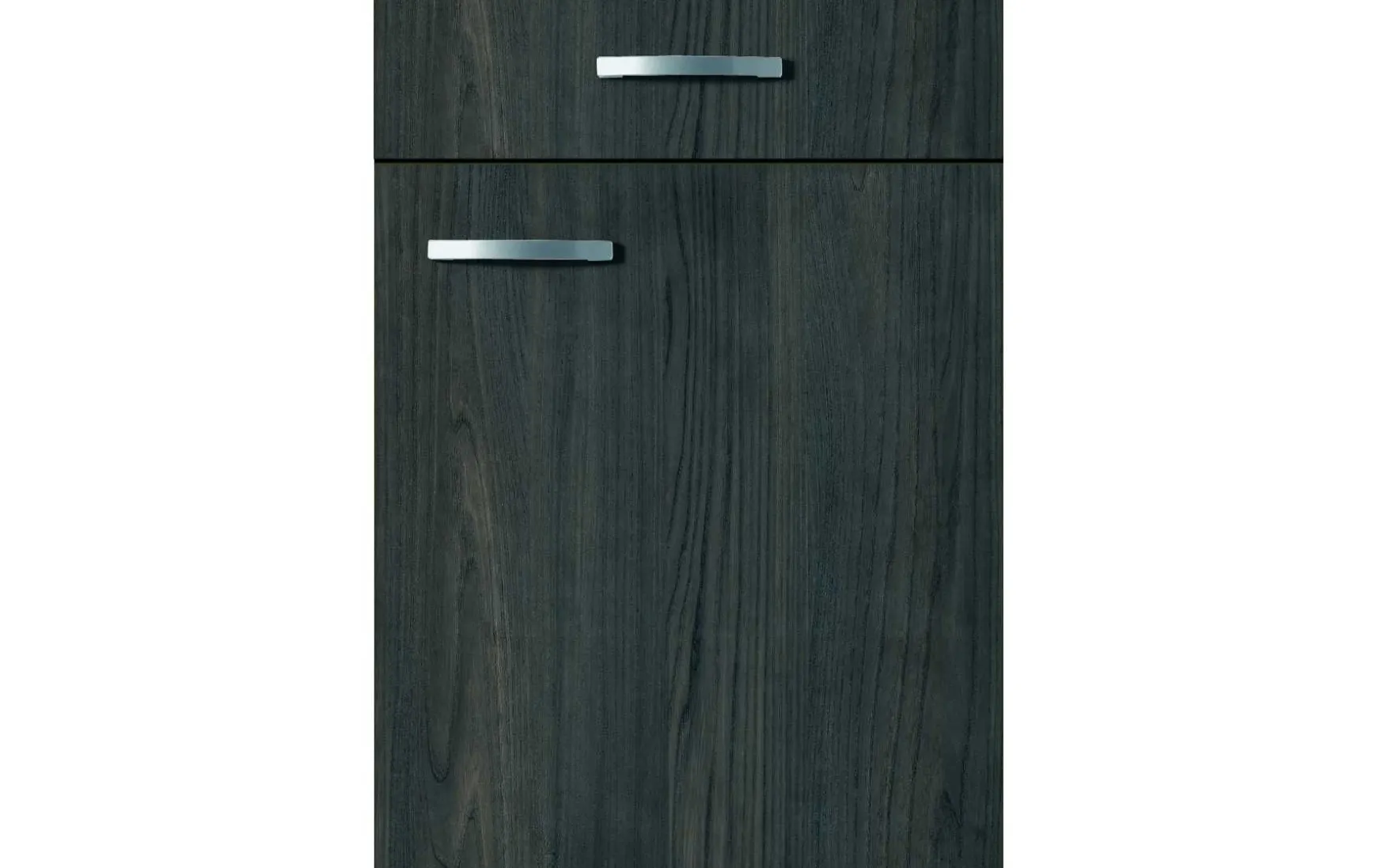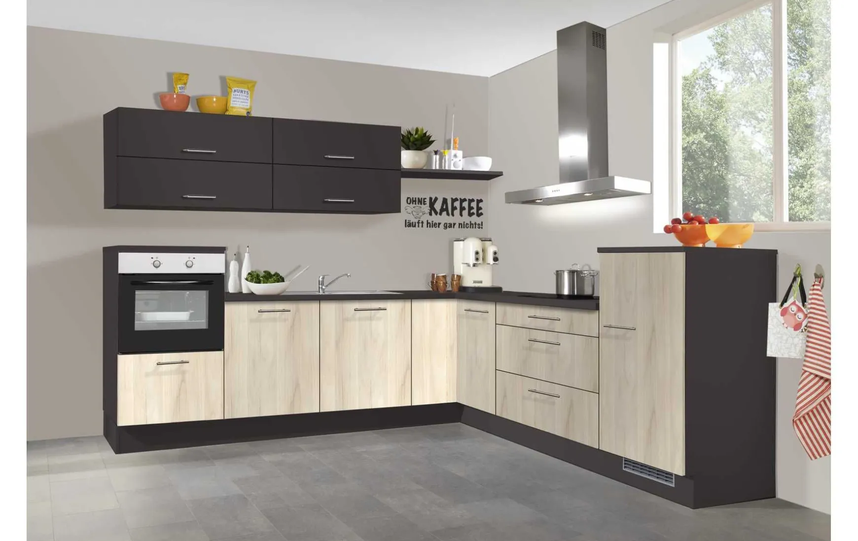 Diese L-Küche beweist, wie zeitgemäß Holzoptik in der Küche wirken kann. Ein geradliniges Design mit vielen modernen Details trifft auf eine natürlich gemaserte Holzoptik, kein Wunder dass Ihre neue Küche die Blicke auf sich ziehen wird. Konzipiert ist die Trendküche mit einem geräumigen und funktional ausgestattetem Seitenschrank und ansprechend gestalteten Hängeschränken. Die Unterschränke sind komplett in Seeahorn Nachbildung gehalten. Authentische Farbunterschiede sowie eine lebendige Maserung prägen ein facettenreiches Bild. Für einen tollen Kontrast sorgen die Fronten der Oberschränke, die sich in mattem Graphit deutlich abheben. Zwischenbauregale in Holzoptik lockern den Look der oberen Küchenelemente gekonnt auf. Ihre neue Küche punktet nicht nur optisch, sondern auch funktional. Eine umfassende Ausstattung mit Elektrogeräten ist selbstverständlich. Besonderen Komfort im Alltag versprechen vor allem Backofen und Kühlschrank in ergonomischer Höhe. Stauraum steht Ihnen in den geräumigen Auszügen und Schränken ausreichend zur Verfügung. Kurzum, die Küche bereitet Ihnen genussvolle Momente, vom Kochen bis zum gemeinsamen Speisen.