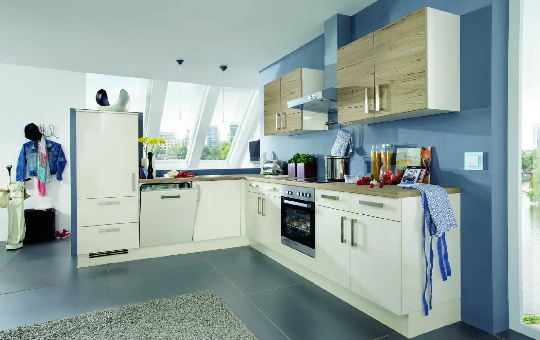 Die klassische L-Form bestehend aus Stauraum in Ober – und Unterschränken sorgt mit der trendigen und zeitlosen Farbe Magnolia für eine Wohlfühlatmosphäre in Ihrem Zuhause. Um dem klassischen Design mehr Glanz zu verleihen kommen die Fronten in einer hochglänzenden Lackierung und sorgen somit für atemberaubende Kontraste zu der großzügigen Arbeitsplatte und den Hängeschränken in San Remo Nachbildung. Die Maserung dieser Holz-Nachbildung wirkt täuschend echt und zaubert Gemütlichkeit in Ihre Küche. Zahlreiche Stauraummöglichkeiten, Schubladen und Auszüge und ein Kühlschrank in ergonomischer Höhe und eine Ausstattung an funktionalen Elektrogeräten sorgen für mehr Komfort im Alltag.