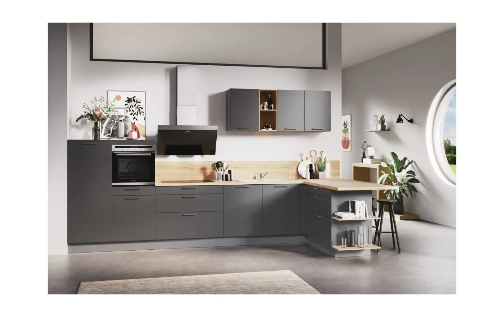 Topmoderne Einbauküche in Mattlack Graphit mit Anti-Fingerprint-Beschichtung, ca.435x190cm, inkl. Elektrogeräte-Set. Geschirrspüler, Hocker und Armatur gegen Mehrpreis erhältlich. Andere Größen und Zusammenstellungen zum individuellen Preis planbar.