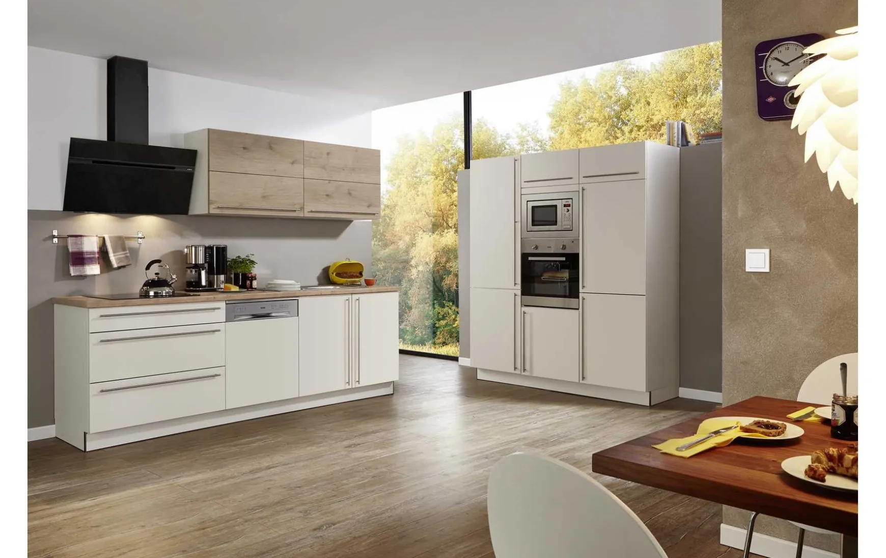 Zeitlose Magnolie trifft auf belebende, warme Holztöne. Ein harmonisches Zusammenspiel wie es nicht schöner hätte gewählt werden können. Die Edelstahlgriffe als kühle Akzente, fügen sich dem Gesamtbild dieser Traumküche ein und unterstreichen die zeitlose und elegante Optik. Die durchdachte Highboardlösung schafft Platz für Ihre eigenen Ideen und Träume, somit verleihen sie dem schlichten Design ihre ganz persönliche Note. Der Backofen ist in ergonomisch angenehmer Rückenhöhe platziert, diese Höhe entlastet Ihre Wirbelsäule und sorgt für mehr Freude beim Kochen. Ausreichend Stauraum für benötigte Küchenutensilien finden Sie in den großzügigen Schränken und Auszügen. Zahlreiche inkludierte Elektrogeräte vervollständigen die Ausstattung dieser eleganten Inselküche.