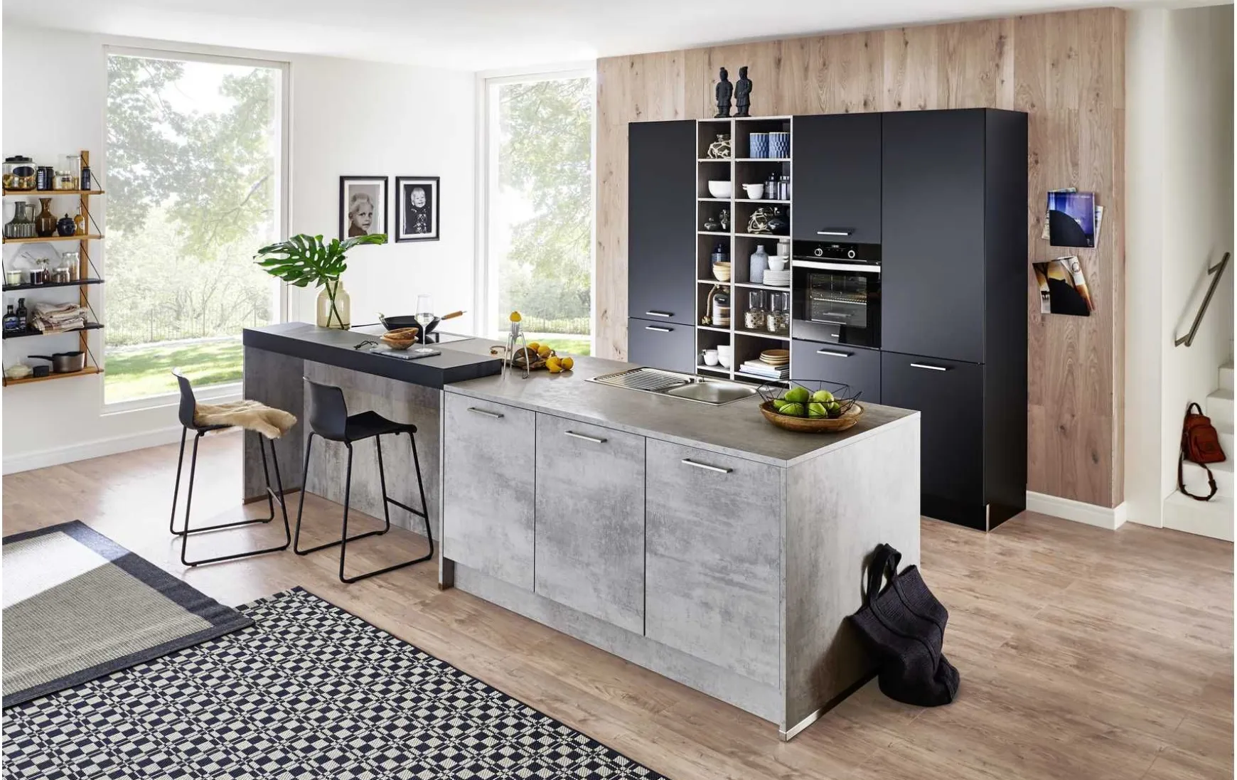 Verschiedene Farben wurden in dieser Küche kombiniert. Stone Betonoptik trifft auf Schwarz softmatt. Eingerahmt wird die Insel durch Abschlusswangen in Beton, nur unterbrochen durch die praktische aufgesetzte Thekenplatte, die als Essplatz dient. Um die moderne Optik der Küche noch zusätzlich zu unterstützen, wurde die Arbeitsplatte in der Dicke von 25 mm angelegt.