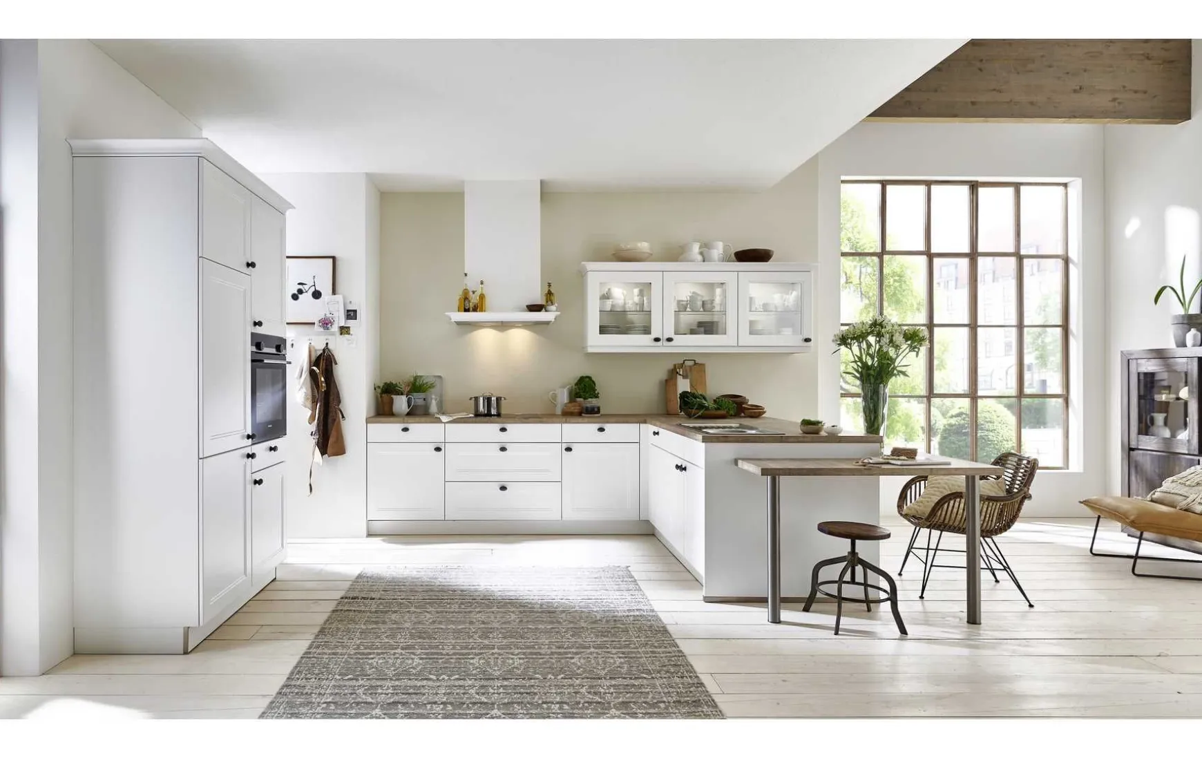 Nostalgischer Stil und moderner Komfort. Die Landhausküche fasziniert mit ihren traditionellen Merkmalen und lädt zum Träumen ein. Die Weiße Front wird mit typischen Landhausaccessoires kombiniert. Drei Oberschränke mit Sprossenglasrahmentüren strahlen eine romantische Atmosphäre aus. Dies macht die Küche zu einem Wohlfühlort mit besonderem Charme.