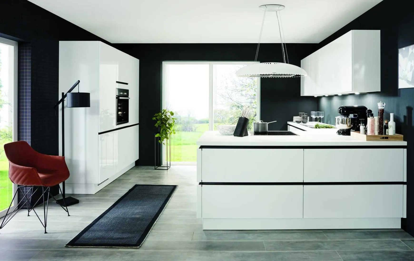 Mit der modernen aber auch funktionalen Inselküche holen Sie sich einen richtigen Hingucker direkt zu Ihnen nach Hause. Das Highlight dieser trendbewussten Küche, fällt auf die moderne Dunstabzugshaube über der Kochinsel. Die funktionale Inselküche wird dank ihrer zeitlosen, hochglänzend Weißen Fronten mit Griffleisten in abgesetztem Schwarz zu einem strahlenden Blickfang. Dank ihrer hohen Funktionalität ist die Inselküche nicht nur schön anzusehen, man kann auch sehr komfortabel darin arbeiten. Maßgeblich trägt hierzu der funktionale Seitenschrank mit Backofen in ergonomischer Höhe und einem geräumigen Kühlschrank bei. Besonders viel Stauraum bieten Ihnen sowohl die Hängeschränke, als auch die Unterschränke des Insel-Winkelelementes mit innenliegenden Schubladen. Zahlreiche weitere Elektrogeräte vervollständigen die Ausstattung der eleganten Inselküche.