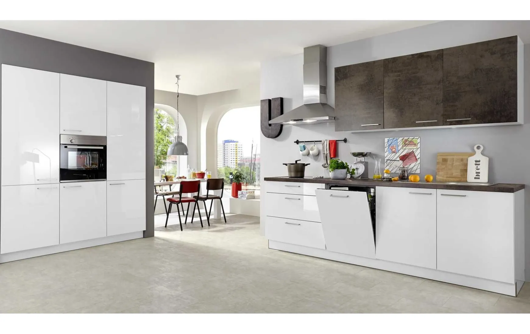In dieser Wohnküche bestehen die Unter- und Hochschränke aus Arcticweiß glänzend und die Oberschränke und die Arbeitsplatte in Kupferoxid. Abgerundet wird das Erscheinungsbild durch einen Metallgriff in Edelstahloptik. Die Küche bietet ausreichend Stauraum für Ihre Küchenutensilien und hilft Ihnen, immer alles an seinem Ort zu halten. Stauraum ist nicht nur in den Oberschränken vorhanden, sondern auch die geräumige Auszügen bieten viel Platz für Ihr Zubehör und Ihre Vorräte.