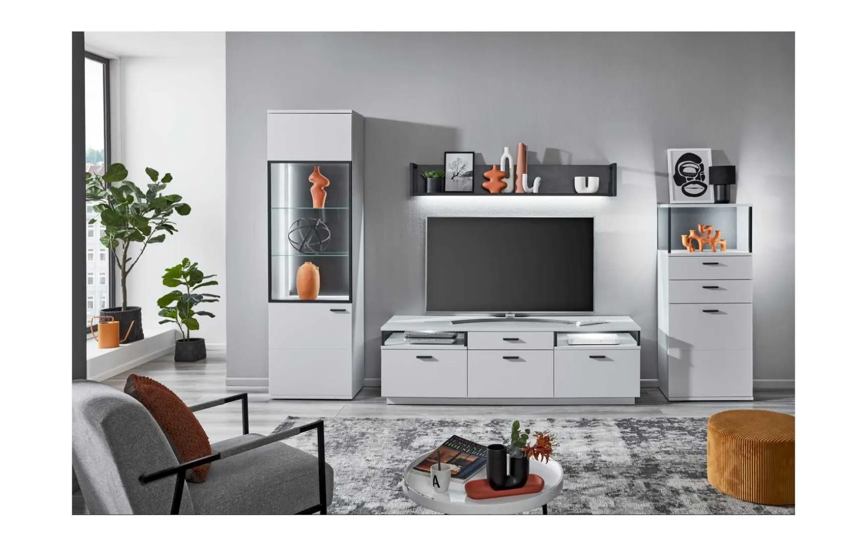 Modern und funktional zugleich? Das ist für die Wohnwand kein Problem! Ihr zeitloses Design in weiß wird durch die modernen, schwarzen Metallakzente ergänzt. Das moderne, 4-teilige Modell von Ideal besteht aus zwei Vitrinen sowie einem Lowboard mit Stauraum und wird durch das Wandboard mit Metallakzenten komplettiert.
