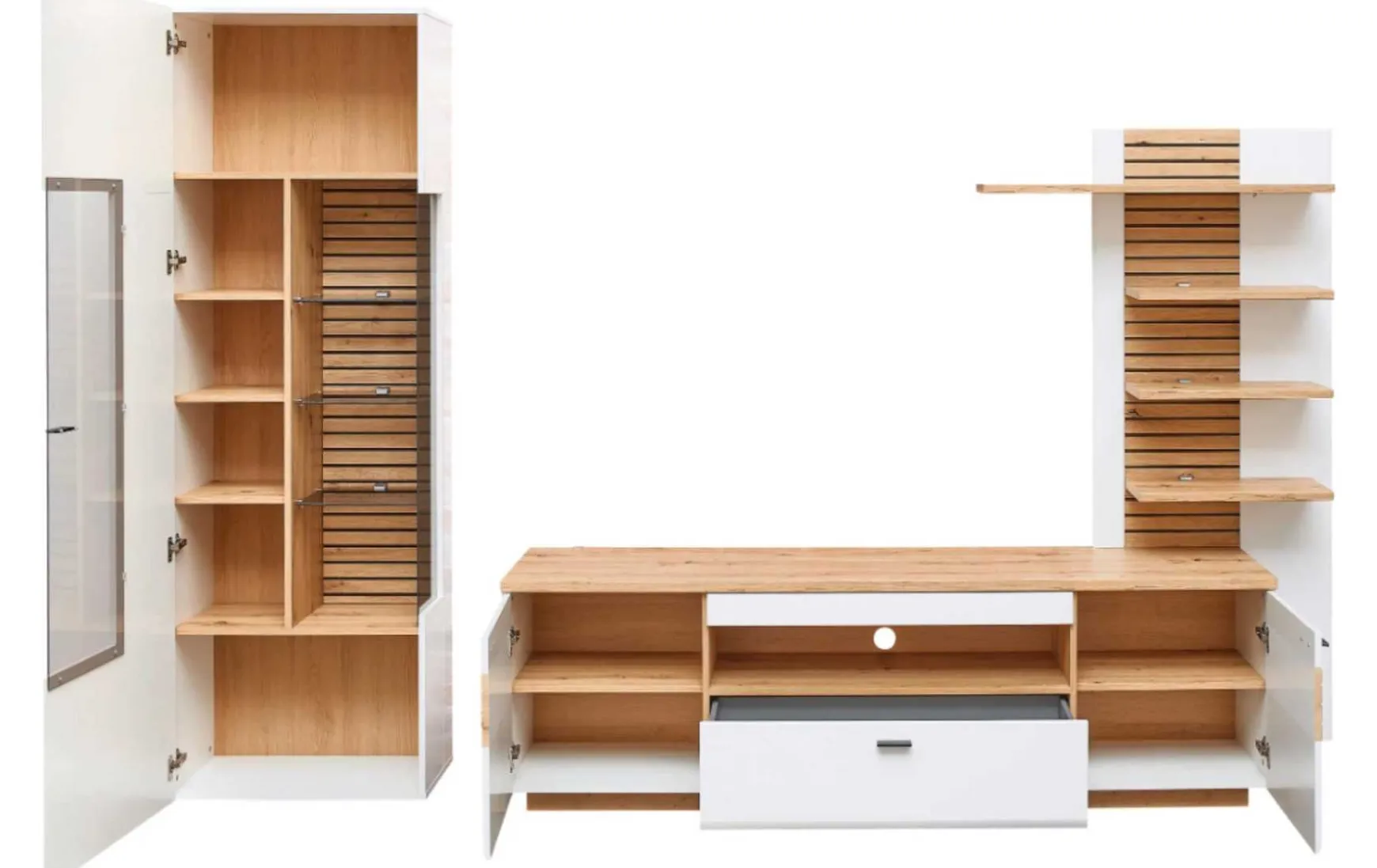 Diese Wohnwand im modernen Stil ist ein wahrer Blickfang in ihrem Wohnraum! Sie besticht durch hochwertige Verarbeitung und dem großzügigen Stauraum! Erfreuen Sie sich an einer TV-Bank, einer Vitrine und dem passenden Wandregal. Zusammen ergibt das eine wunderschöne Einheit die durch ihre Eleganz punktet. Der Korpus in weiß, die Front weiß matt MDF und die Absetzungen aus Artisan Eiche MDF in Leistenoptik bilden ein harmonisches Zusammenspiel. Das Frontglas und die Glaseinlegeböden aus Glas in grau machen die Erscheinung komplett. Die Griffe aus Metall Aluminium anthrazit fügen sich unaufdringlich in das gelunge Gesamtbild ein.