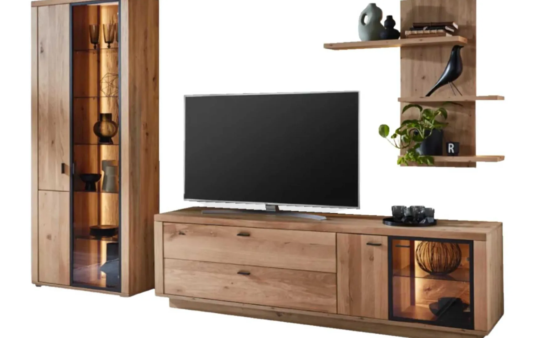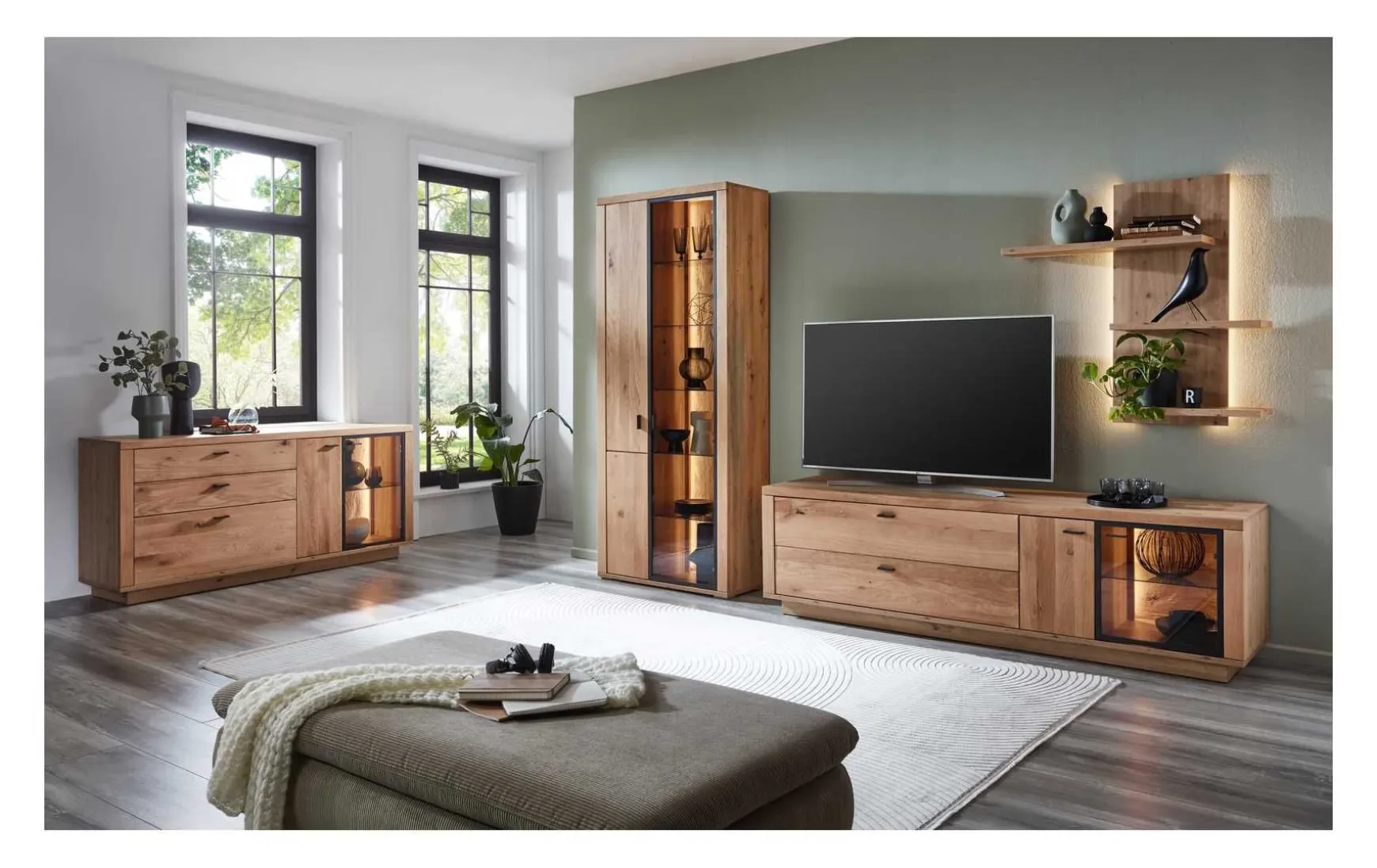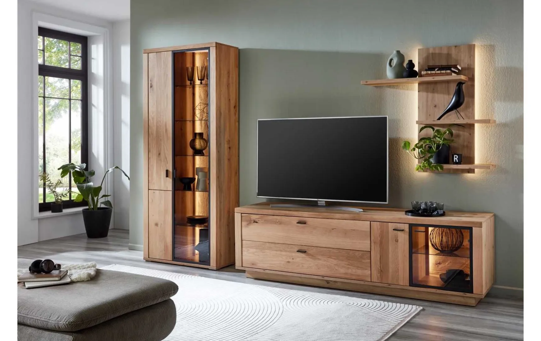 Mit dieser Holz Wohnwand wird Ihr Wohnzimmer zum absoluten Hingucker. In dieser Kombi vereinen sich teilmassive Eiche mit schwarzgrauen Alurahmen und Parsolglas zu einem einzigartigen Highlight. Mit der optionalen Beleuchtung bringen Sie zudem die sandgestrahlte Rückwand vorteilhaft zur Geltung. Die Holz Wohnwand besteht aus einer Vitrine, einem Lowboard und einem Wandpaneel mit mehreren Böden.