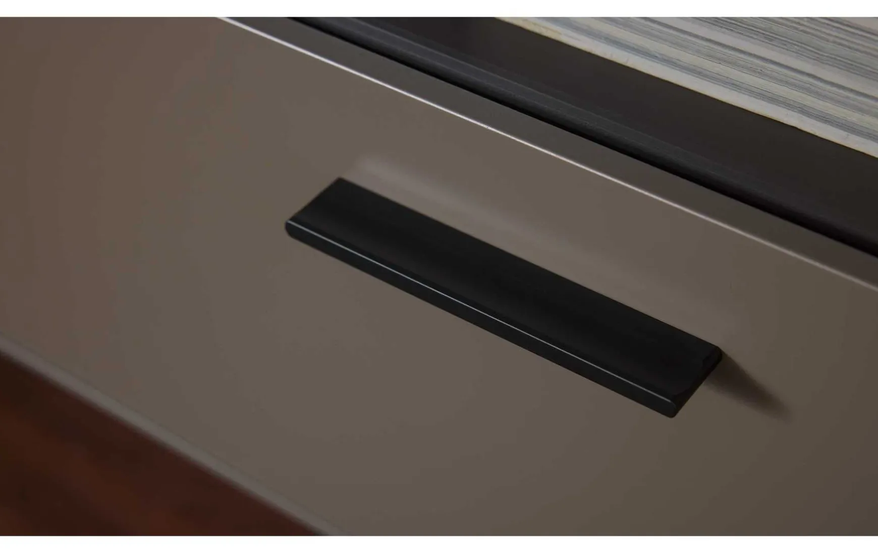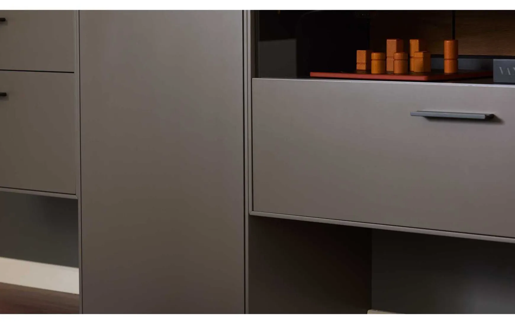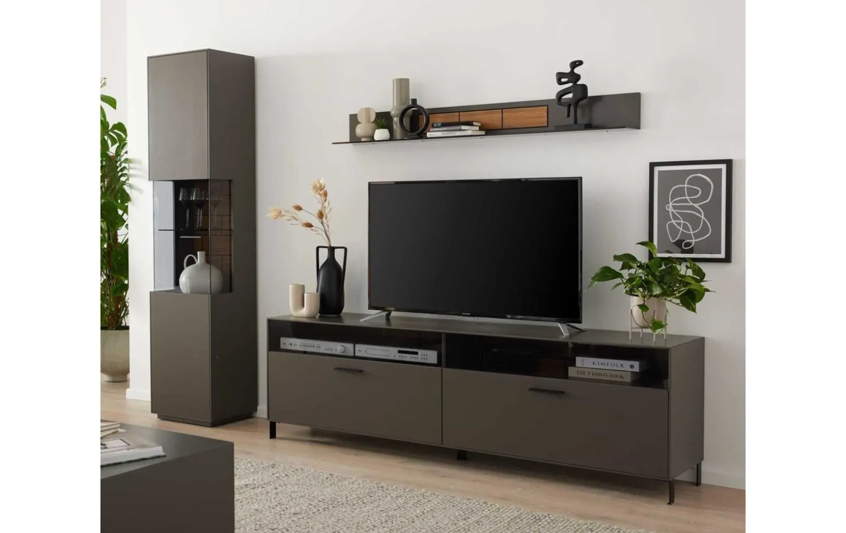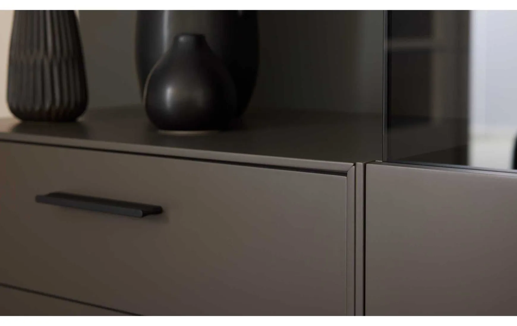Die Wohnwand überzeugt mit ihrem stilvollen Design und der hohen Qualität. Ihre wolframgrauen Lackoberflächen strahlen moderne Eleganz aus. Für das gewisse Etwas sorgen die Einsätze aus grauem Parsolglas, die sichtbaren Rückwände mit Spaltholz auf schwarzer MDF und die Details aus schwarz lackiertem Metall mit Feinstruktur.