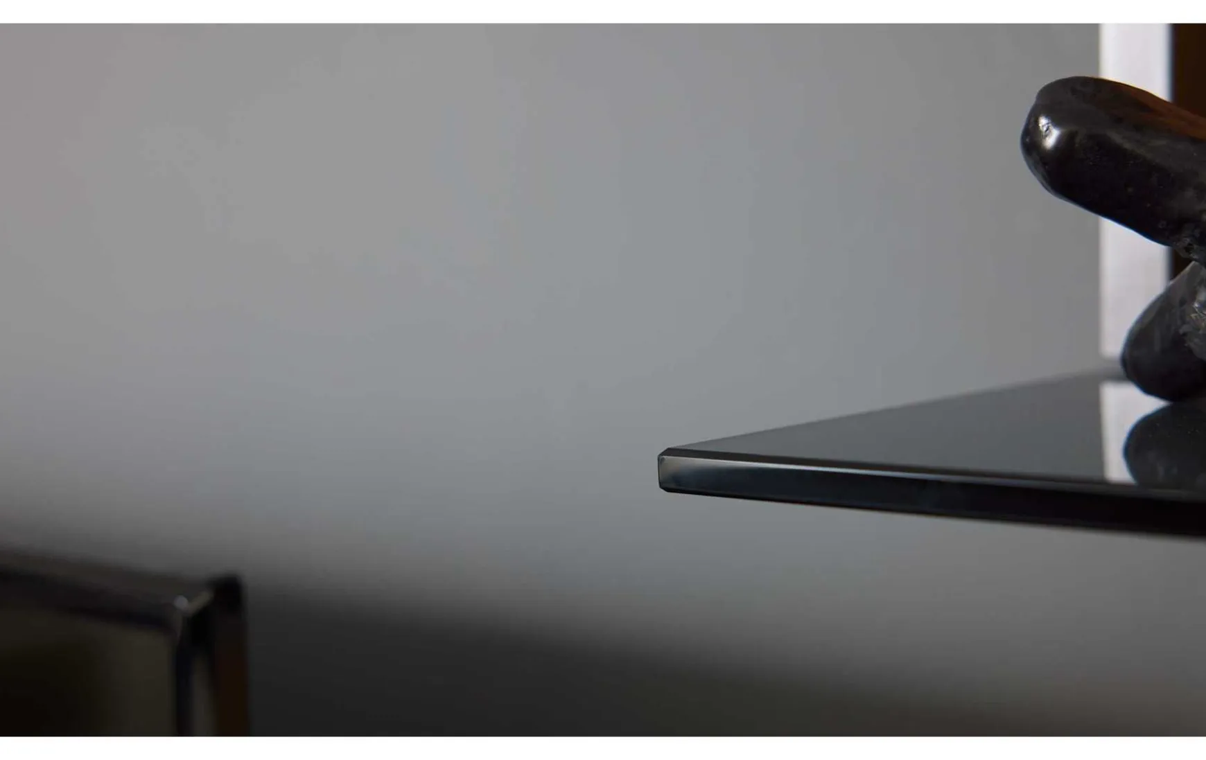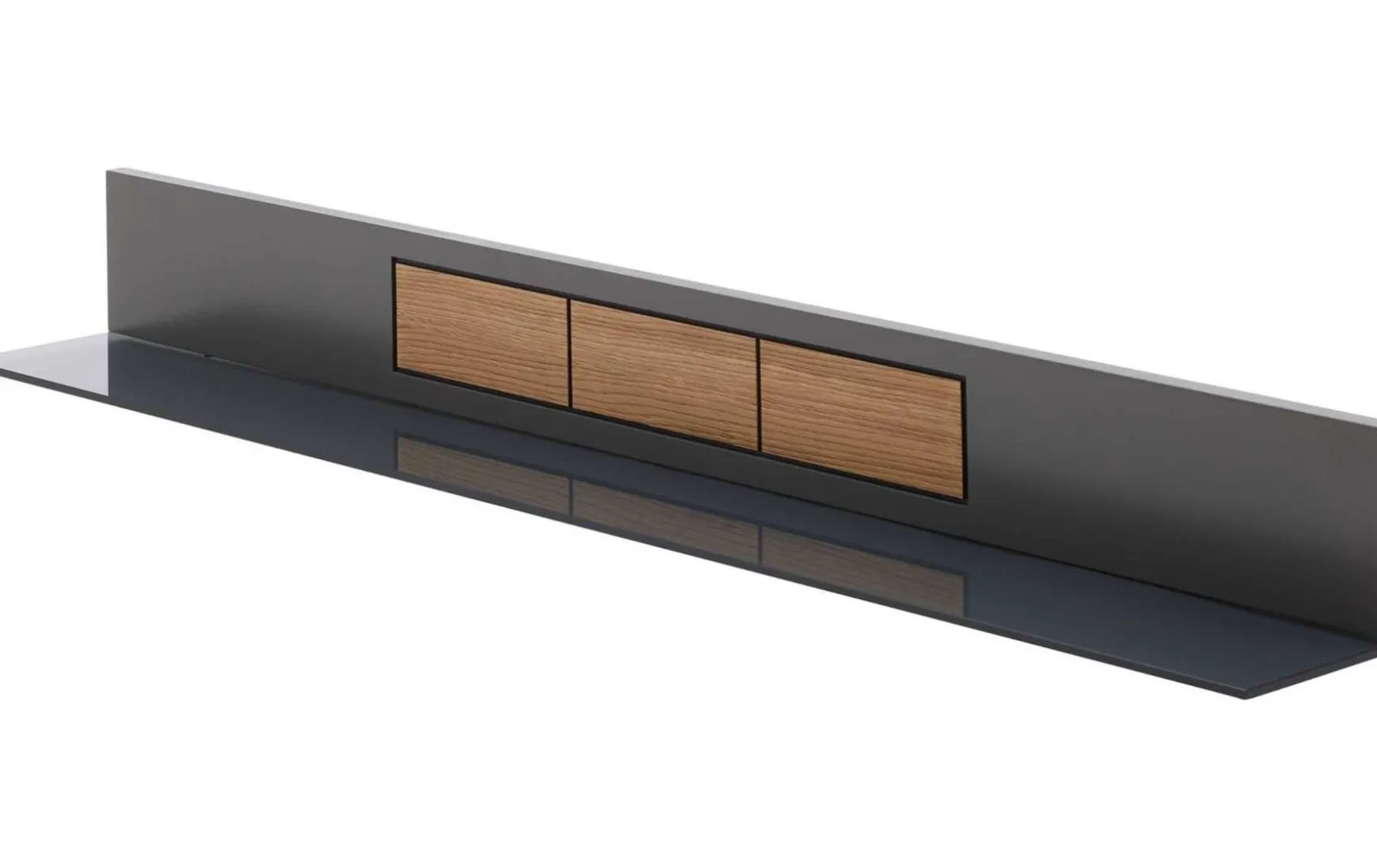 Ein Wandboard mit Spaltholz-Akzent, Glasboden und Maßen von ca. 150 x 17 x 22 cm (BxHxT).