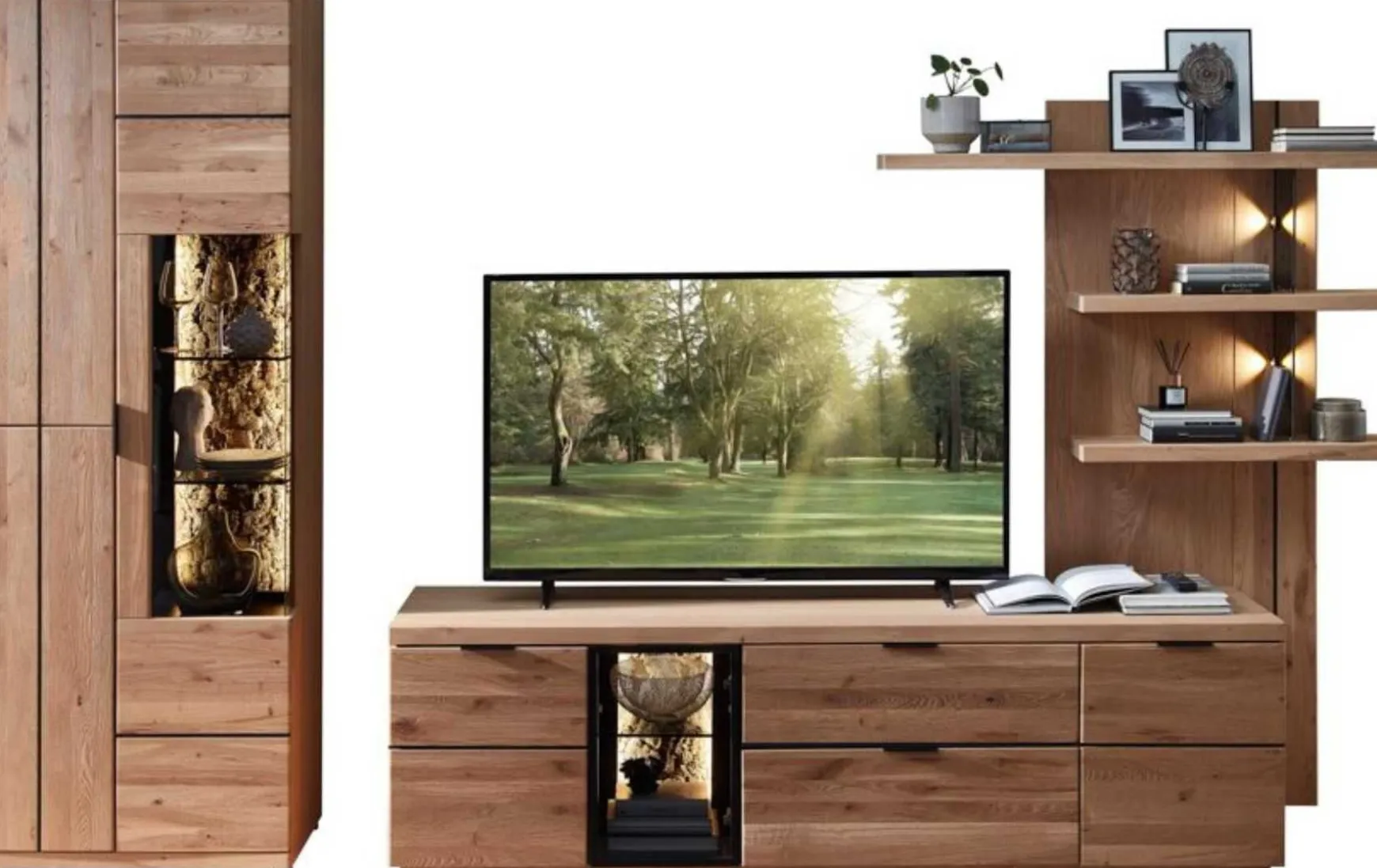 Diese TV-/Wohnlösung vereint stilvolles Design mit hochwertiger Handwerkskunst. Gefertigt aus massiver Wildeiche und ergänzt durch edle Fronten in Echtkork Bianco-Furnier, bringt diese Wohnwand eine besondere Natürlichkeit und Wärme in Ihr Zuhause. Die einzigartige Kombination aus Holz und Kork sorgt nicht nur für eine moderne Optik, sondern auch für eine angenehme Haptik – perfekt für ein gemütliches und stilvolles Wohnambiente. Das massive Wildeichenholz steht für Stabilität, Langlebigkeit und eine authentische Maserung, die jede Wohnlösung zu einem Unikat macht. Der Bianco-furnierte Echtkork ergänzt das massive Holz durch eine dezente, natürliche Struktur, die das Licht sanft reflektiert. Alle Oberflächen sind sorgfältig verarbeitet und verleihen Ihrem Wohnraum einen modernen, aber dennoch zeitlosen Charakter. Die Kombination aus Naturmaterialien sorgt zudem für ein gesundes Raumklima.