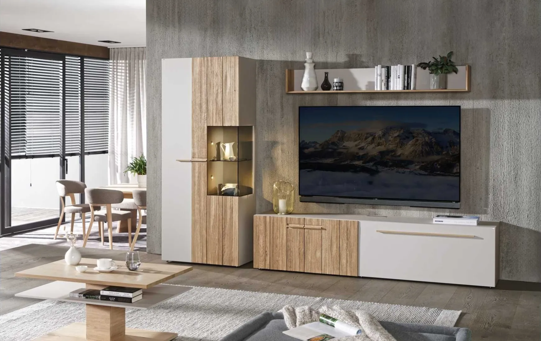 Die elegante Wohnwand vereint modernes Design mit natürlicher Ausstrahlung und durchdachter Funktionalität. In edlem Kaschmirgrau gehalten und mit charakterstarken Massivholzakzenten im ausdrucksstarken Spaltholzdesign versehen, wird diese Wohnwand zum stilvollen Mittelpunkt Ihres Wohnzimmers. Die Kombination aus klarer Linienführung und rustikaler Holzstruktur verleiht der Voglauer Wohnwand eine harmonische Balance aus Urbanität und Naturverbundenheit. Die Wohnwand überzeugt nicht nur optisch, sondern auch funktional: Sie ist eine Wohnwand mit viel Stauraum, die Platz für Bücher, Mediengeräte, Dekoration und Alltagsgegenstände bietet. Geschlossene Elemente und die optionale Beleuchtung sorgen für Struktur und Atmosphäre zugleich. Dank der hochwertigen Verarbeitung und der Liebe zum Detail steht die Wohnwand für langlebige Qualität und nachhaltige Materialien – ganz im Sinne der traditionsreichen Möbelmanufaktur. Ob für ein modernes Loft oder ein gemütliches Zuhause – die Wohnwand passt sich flexibel an verschiedenste Wohnstile an und schafft ein wohnliches Ambiente mit Charakter. Die durchdachte Aufteilung macht sie zur idealen Wohnwand mit viel Stauraum, ohne dabei wuchtig zu wirken.