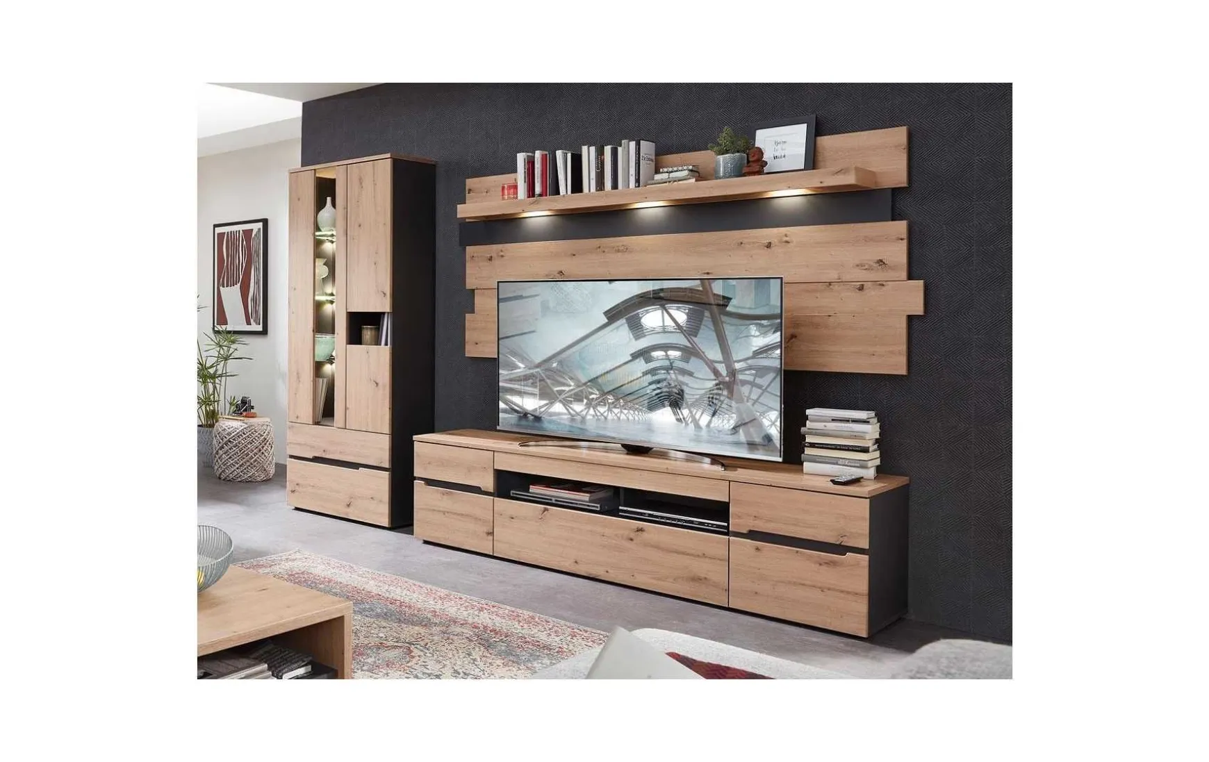 Mit seinem bezaubernden Design und der trendigen Ausführung zieht diese Wohnwand alle Blicke auf sich. Die Farben Artisan Eiche und graphit sorgen für ein modernes Ambiente, was die Wohnwand zu einem Highlight in Ihrem Wohnzimmer macht. Die stimmungsvolle LED-Beleuchtung rundet die Optik gekonnt ab. Viele Aufbewahrungsmöglichkeiten für Geräte und andere Utensilien gibt es ebenfalls.