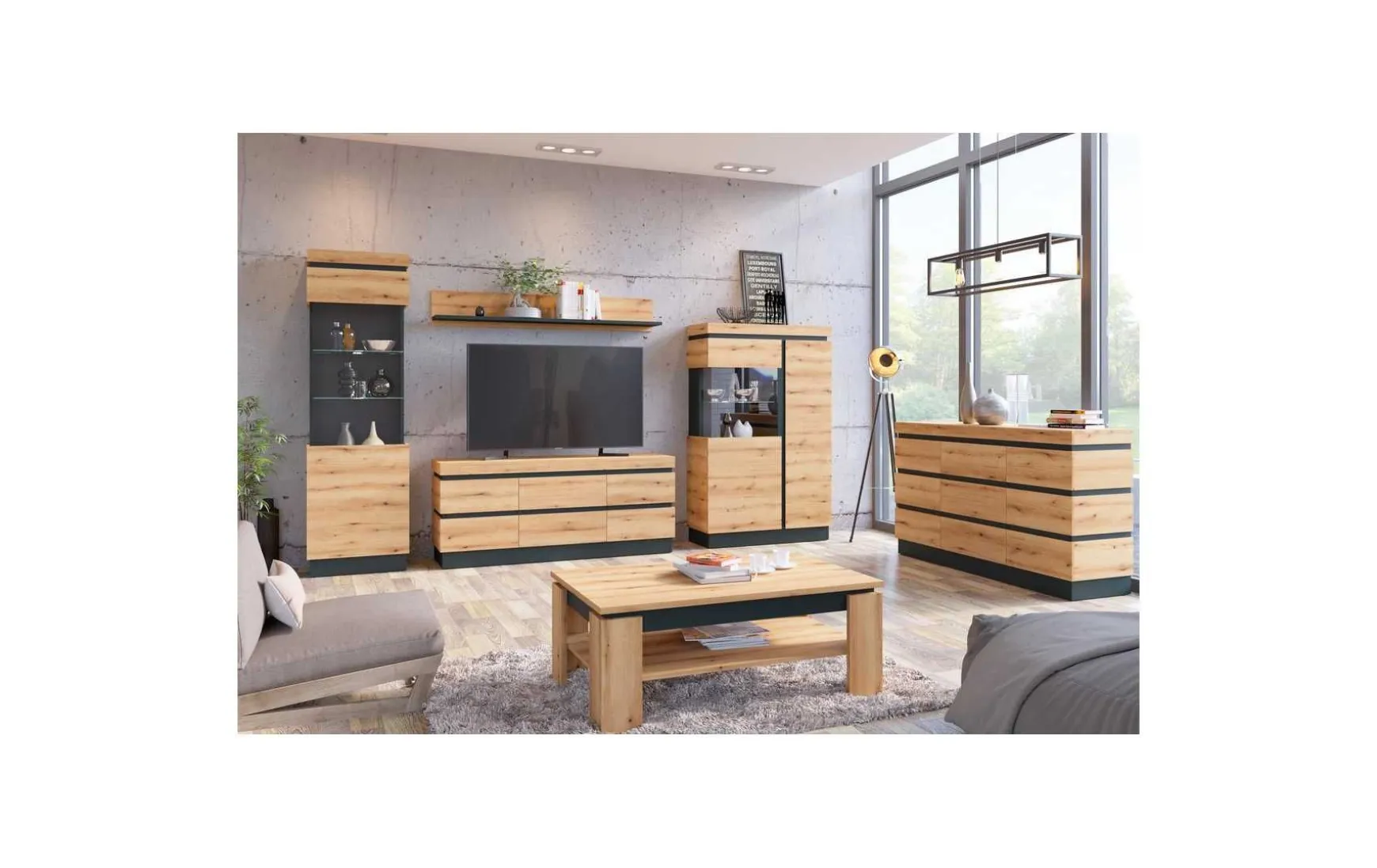 Diese moderne Wohnwand überzeugt durch ihr elegantes, griffloses Design und hochwertige Details. Die Glasfronten und Glasböden verleihen dem Möbel eine edle, leichte Optik, während das Coast-Evoke-Eiche-Dekor in Holzfarben für Wärme sorgt. Soft-Close-Schubkästen bieten hohen Bedienkomfort, schwarze Füße setzen moderne Akzente. Mit großzügigen Maßen von ca. 344 × 201 × 45 cm (B/H/T) bietet die Wohnwand viel Stauraum. Passende Beimöbel wie Couchtisch, Sideboard oder eine LED-Beleuchtung sind optional gegen Mehrpreis erhältlich.