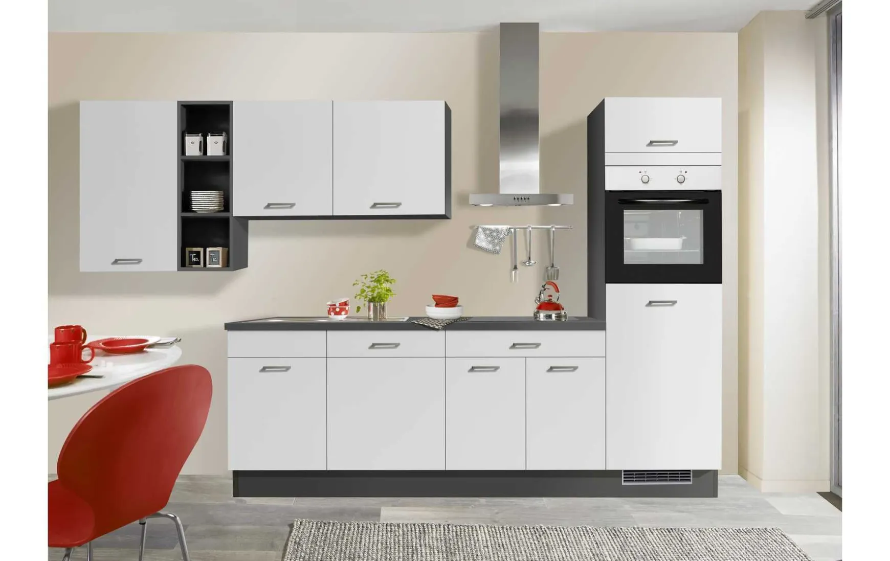 Ein kompaktes Format, ein freundliches Design und eine funktionale Ausstattung, kann man mehr von einer modernen Küche erwarten? Diese Zeilenküche erfüllt all diese Ansprüche und passt so in viele Haushalte. Gestaltet ist sie mit durchgehend matten Weißen Fronten. Diese werden von Korpus, Sockel und Arbeitsplatte in Graphit eingerahmt. Bügelgriffe in Edelstahloptik verleihen der Küchenzeile einen Hauch Eleganz. Dank einer Melaminharzbeschichtung sind alle Oberflächen strapazierfähig und kratzbeständig, beste Voraussetzungen, damit Ihre neue Küche auch langfristig schön aussieht. Komplettiert wird die Zeilenküche von einer funktionalen Ausstattung mit E-Geräten. Hervorzuheben ist hier vor allem der Backofen in ergonomischer Höhe.