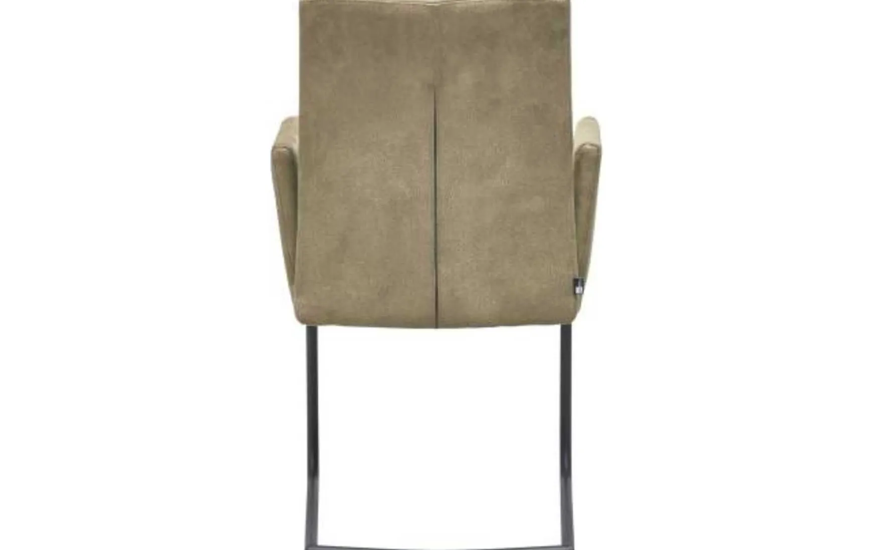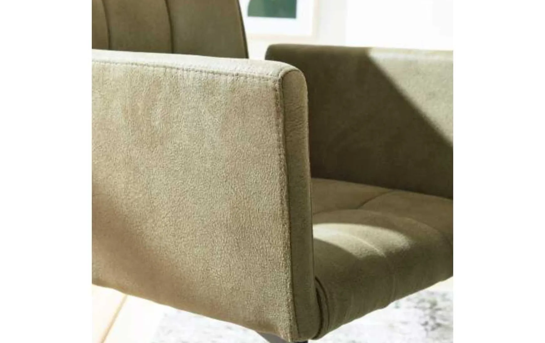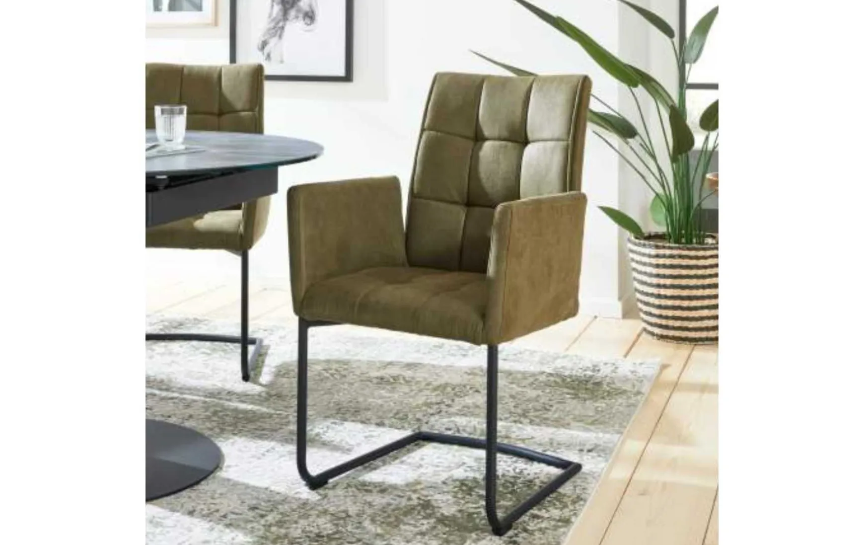 Dieser Armlehn-Schwingstuhl kombiniert eine mit farngrüner Mikrofaser im Wildlederlook bezogene Sitzschale mit einem robusten, mattschwarz pulverbeschichteten Metall-Rundrohrgestell. Durch die hochwertigen Materialien ist er stabil und langlebig. Optisch präsentiert sich der Esszimmerstuhl modern und elegant. Seine Maße belaufen sich auf ca. 58 x 96 x 55 cm (BxHxT). Dank der angenehmen Haptik der Mikrofaser, der viskoelastischen Komfortpolsterung auf einer Nosagunterfederung und der komfortabel wattierten Rückenlehne mit Knopfheftung sitzen Sie auf dem Armlehn-Freischwinger außerordentlich bequem.