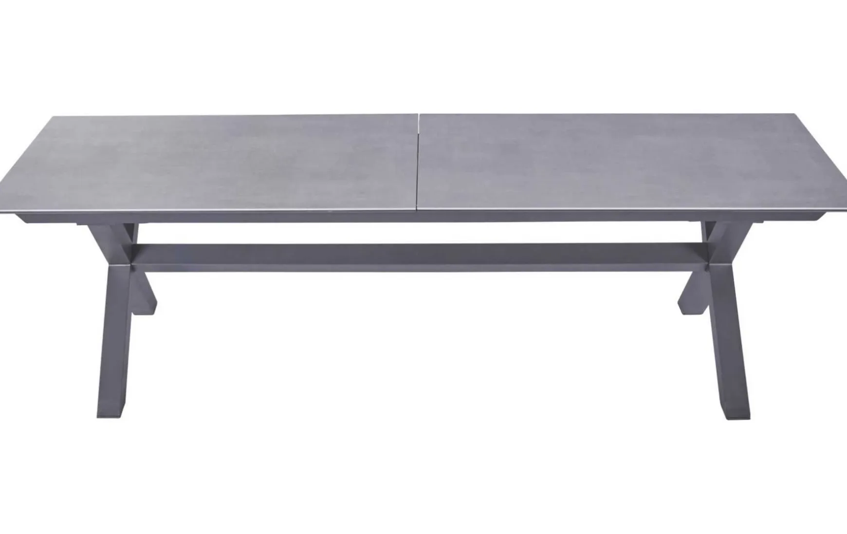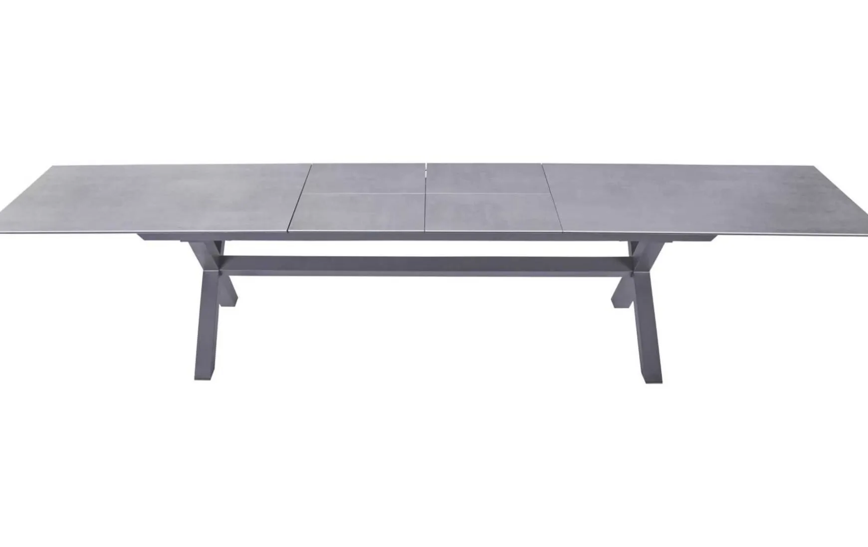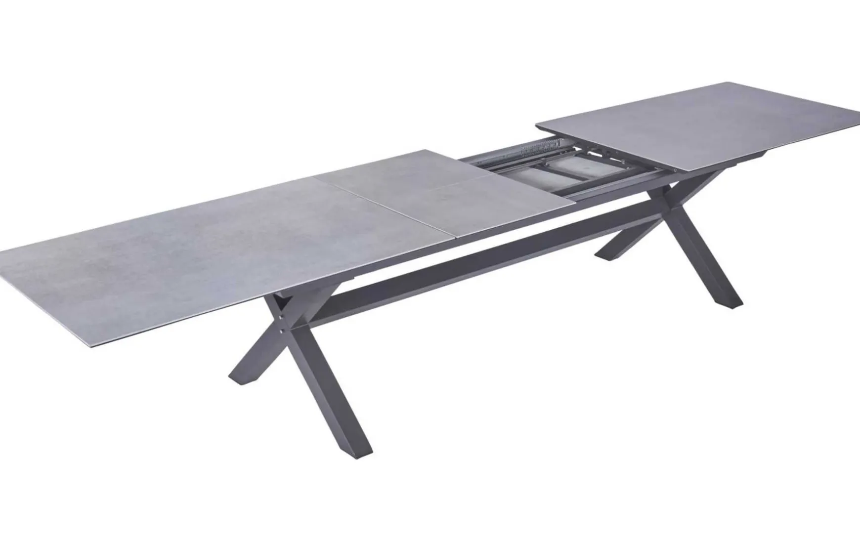 Der ausziehbare Esstisch mit einer Platte aus Glas-Keramik in Beton-Optik, einem modernen X-Fuß-Gestell aus Aluminium in Anthrazit und einer einfachen Butterfly-Ausziehfunktion bietet mit seinen Maßen von ca. 280(340/400)x100 cm und einer Höhe von ca. 76 cm Flexibilität und elegantes Design für jede Essgelegenheit.