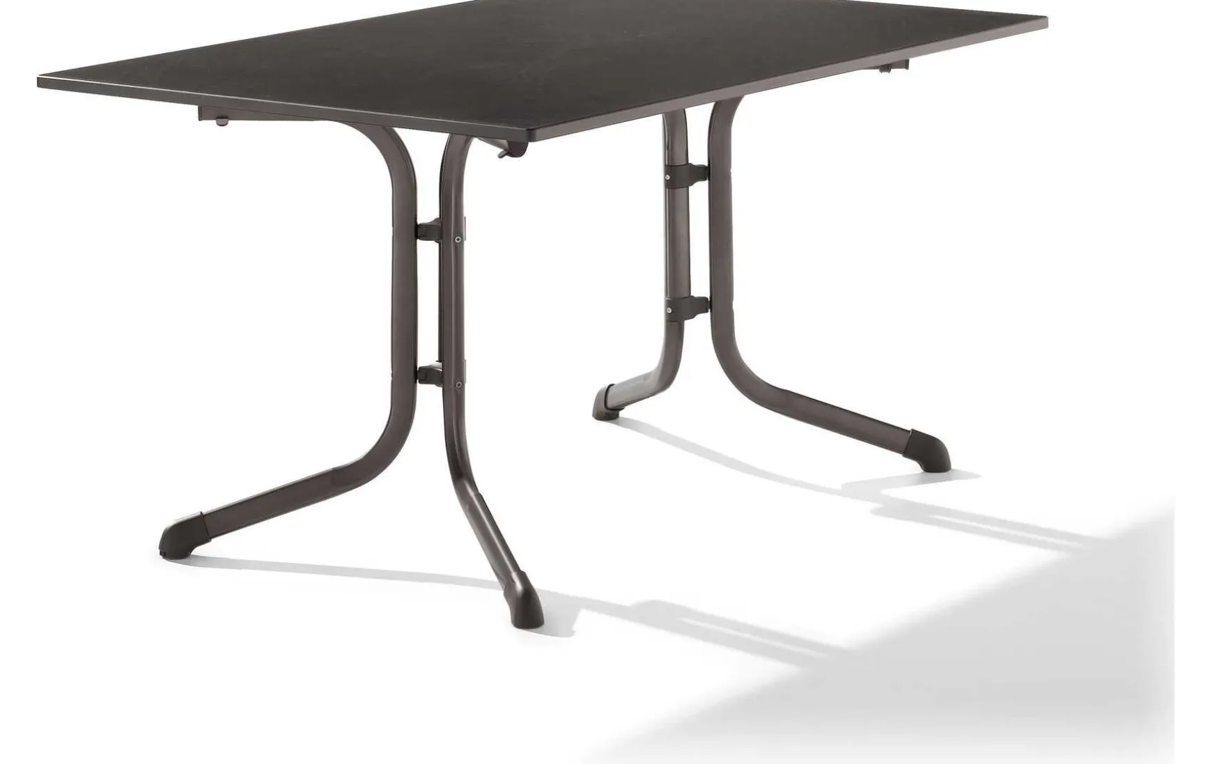 Dieser Boulevard-Klapptisch hat ein graphitfarbenes Gestell aus polyesterbeschichtetem Profil-Stahlrohr mit einer Rohrstärke von 40 x 32 mm und eine formschöne vivodur®-Schieferdekorplatte in anthrazit. Der Tisch hat eine Größe von 140x90cm. Durch die Polyesterbeschichtung wird das Gestell unempfindlich gegen Witterungseinflüsse. Die Höhe des Tisches beträgt ca. 73 cm. Damit der Tisch auch auf unebenen Flächen einen festen Stand hat, wurde er mit einem Höhenausgleich ausgestattet. Durch seine Klappfunktion ist der Tisch sehr einfach in der Handhabung.