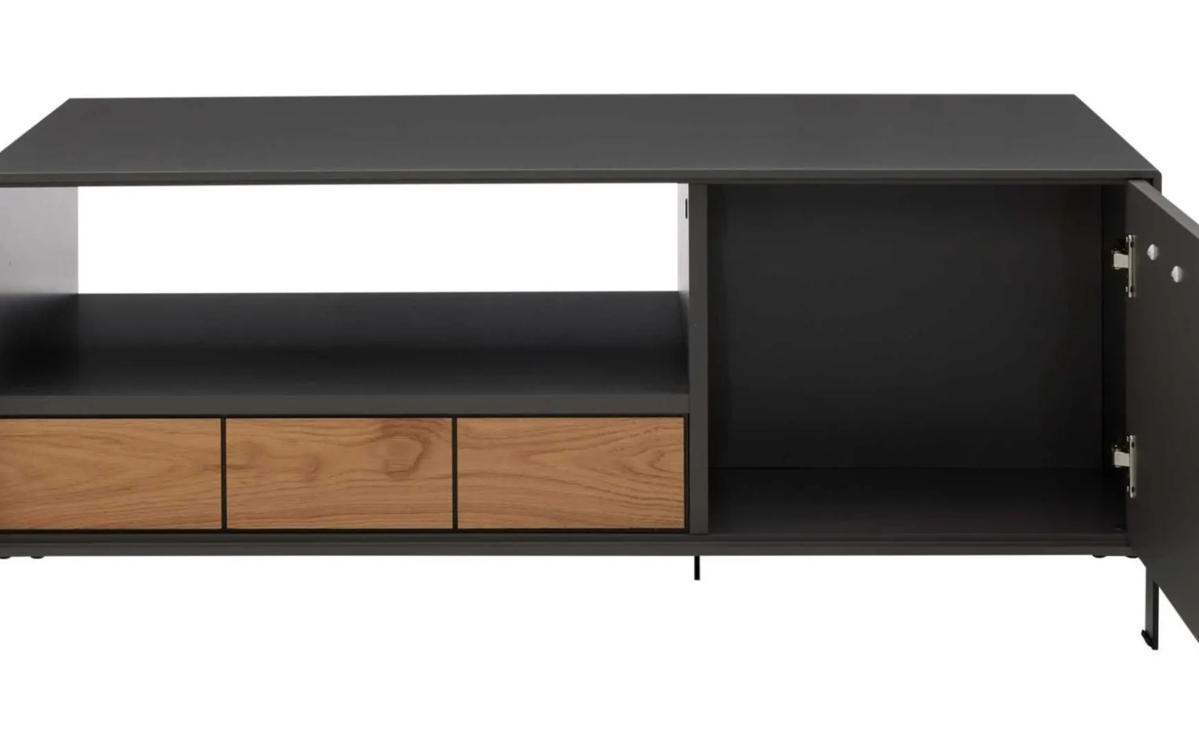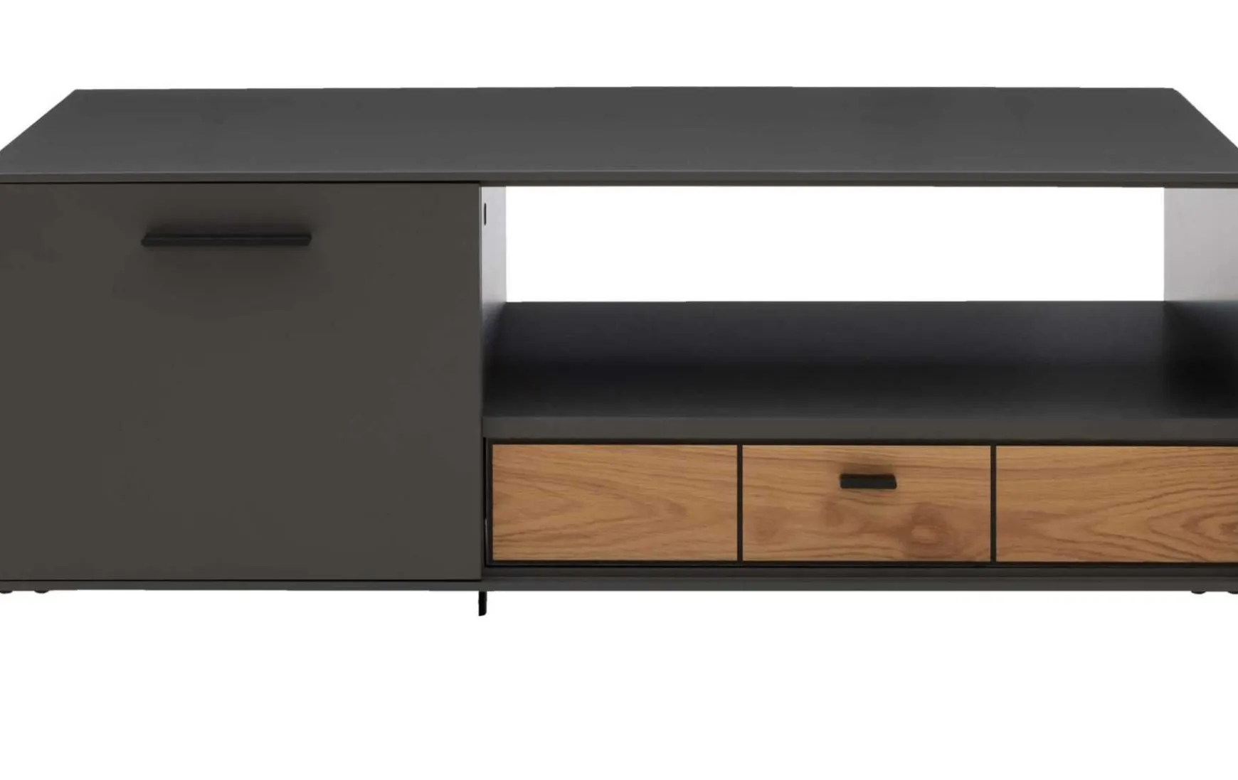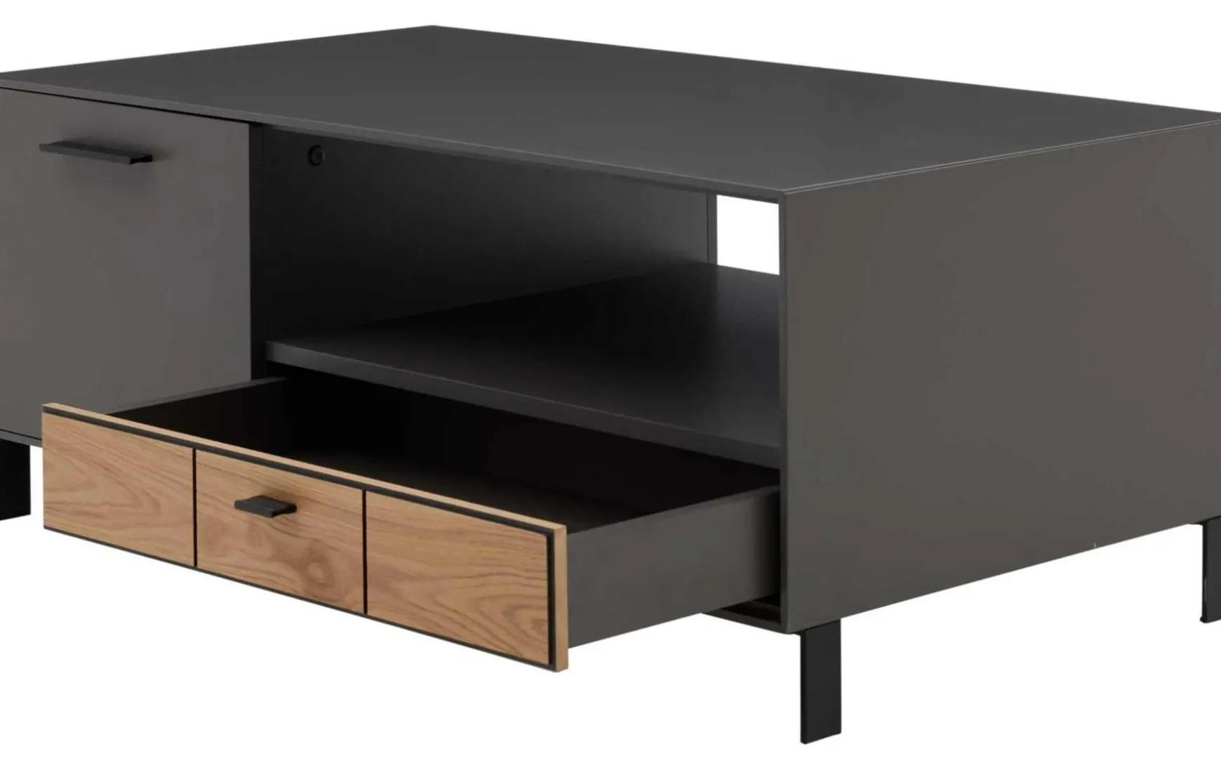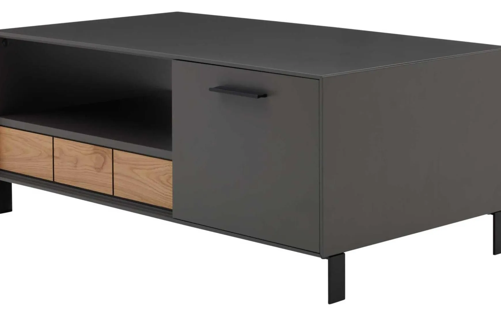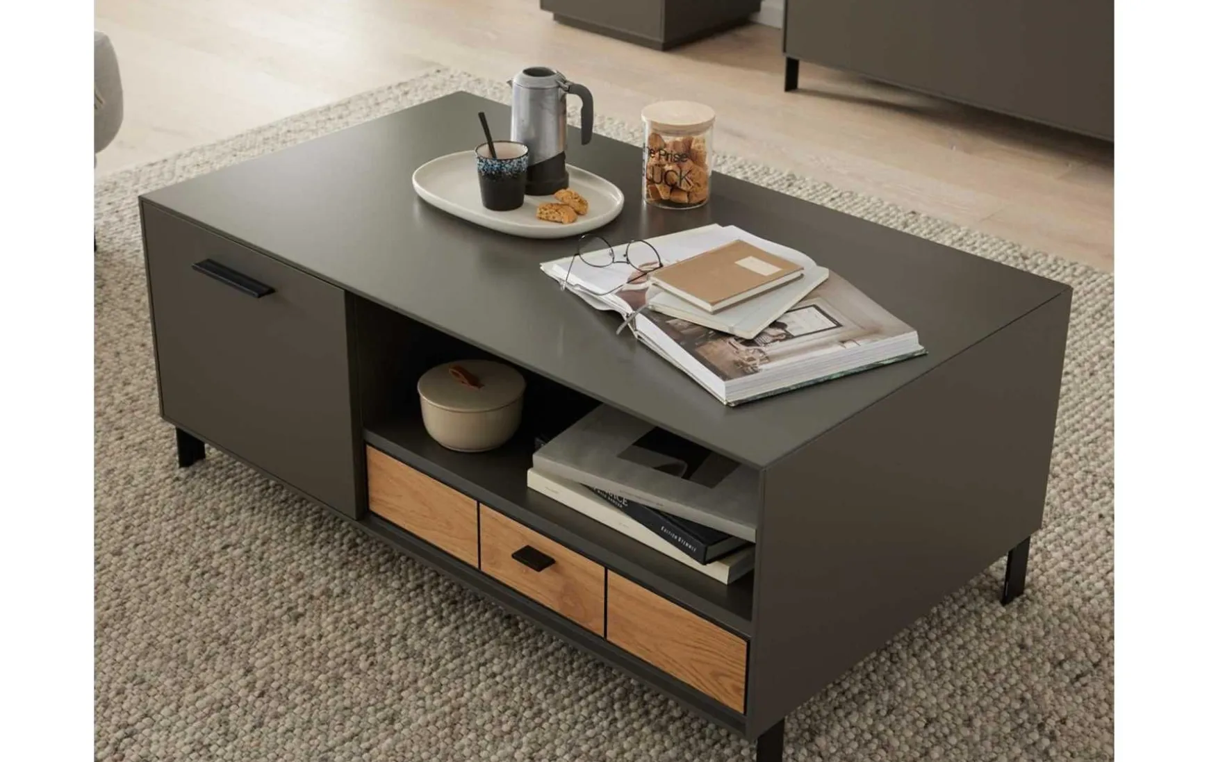 Der Couchtisch überzeugt mit seinem stilvollen Design und der hohen Qualität. Seine wolframgrauen Lackoberflächen strahlen moderne Eleganz aus. Für das gewisse Etwas sorgen die Akzente aus Spaltholz auf schwarzer MDF und die Details aus schwarz lackiertem Metall mit Feinstruktur. Jede lange Seite ist mit zwei Holztüren ausgestattet. Zusätzlich verfügt der Wohnzimmertisch über eine beidseitig zu öffnende Schublade mit Spaltholzfront und ein offenes Fach. Sie erhalten den Couchtisch mit Maßen von ca. 110 x 45 x 60 cm (B/LxHxT)