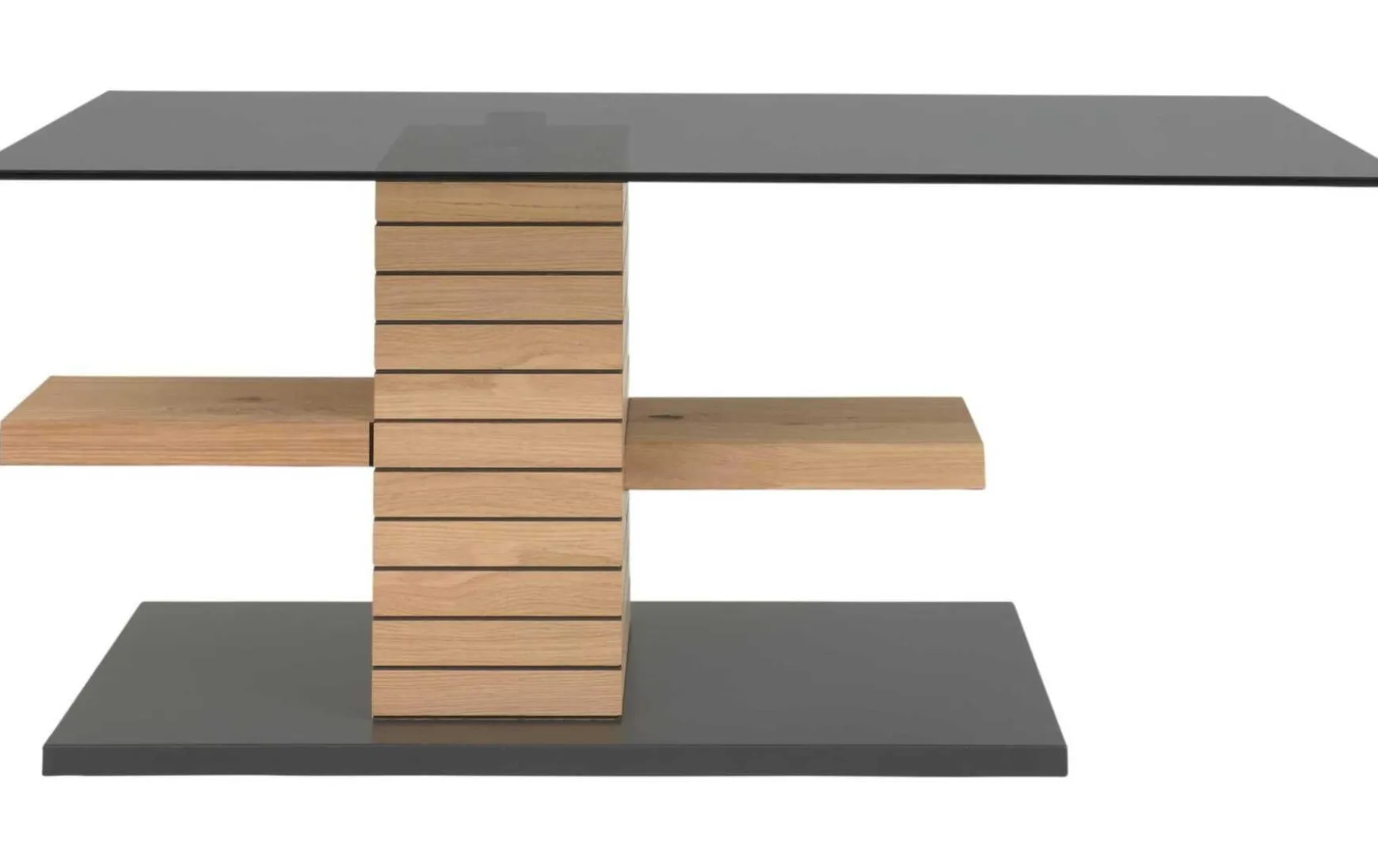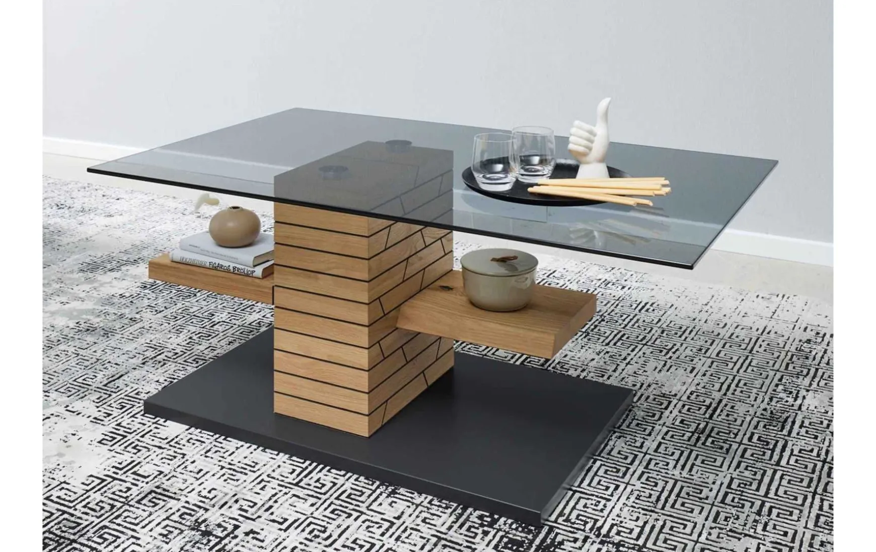 Der edle Couchtisch verbindet pure Eleganz mit einladender Natürlichkeit. Seine Platte aus grauem Parsolglas sowie der Korpus in massiven Hirnholzblockstreifen sorgen für einen zeitlosen Stil. Dazu bildet schiefer-schwarzer Mattlack eine harmonische Ergänzung. Damit passt das Design zu facettenreichen Einrichtungsstilen und Farben Ihres Interieurs: ob als Sofatisch oder als praktisches Beistellmöbel mit extra Ablagefläche. Der Glasplattentisch bringt Maße von ca. 110 x 46 x 70 cm (LxHxT) mit, während die Plattenstärke ca. 8 mm beträgt.