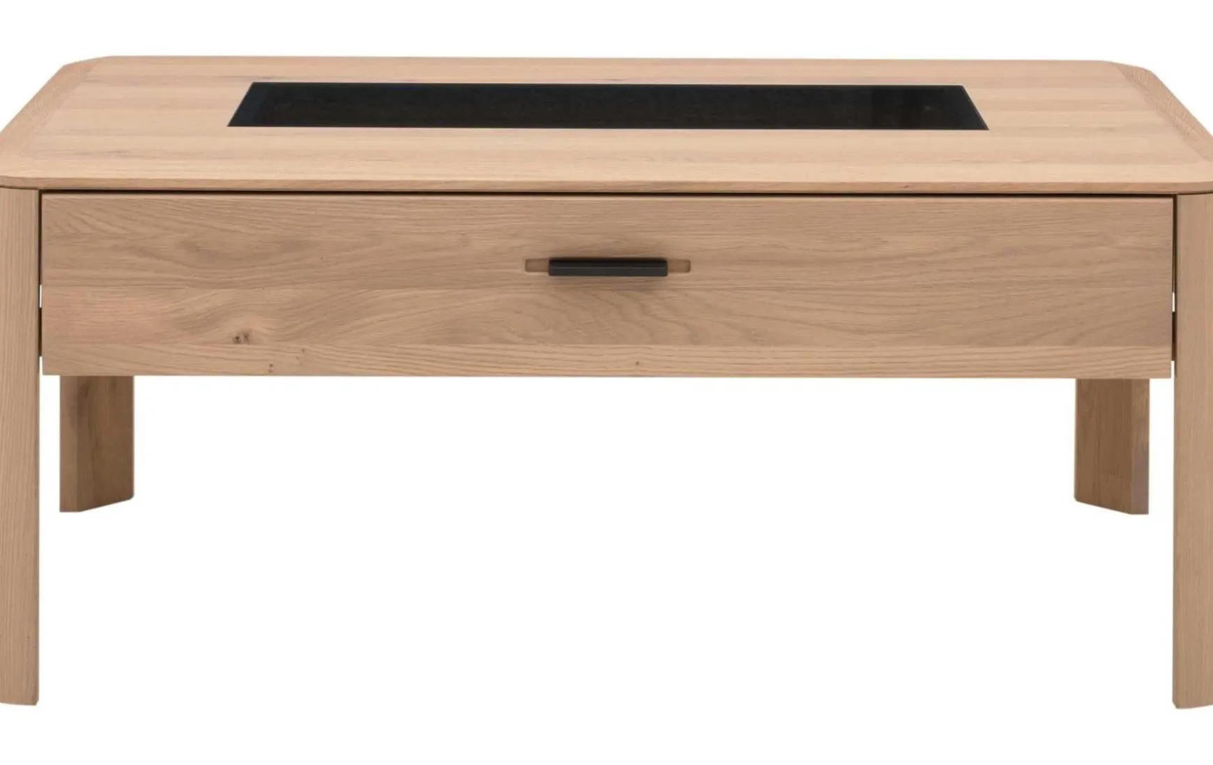Hergestellt aus massiver Wildeiche, verkörpert der Couchtisch erstklassige Qualität. Einen gelungenen Akzent setzt die Einlage aus Parsolglas in der Mitte der Massivholz-Tischplatte. Durch die Schublade mit einem Boden in Granit-Steinoptik und einem mattschwarz lackierten Aluminiumgriff steht Ihnen Stauraum für Fernbedienungen, TV-Magazine und vieles mehr zur Verfügung. Sie erhalten den Couchtisch mit Maßen von ca. 110 x 46 x 65 cm (B/LxHxT)