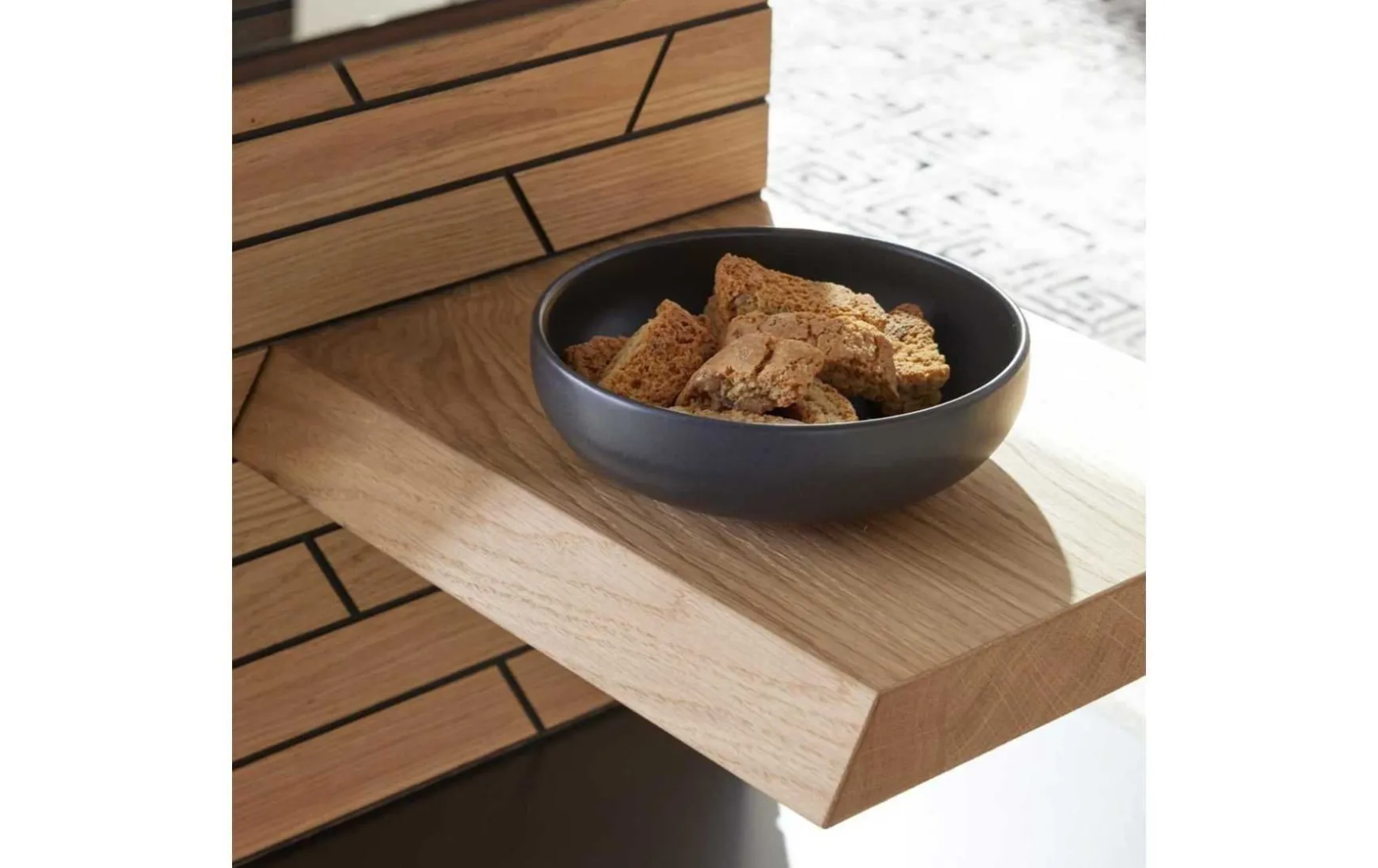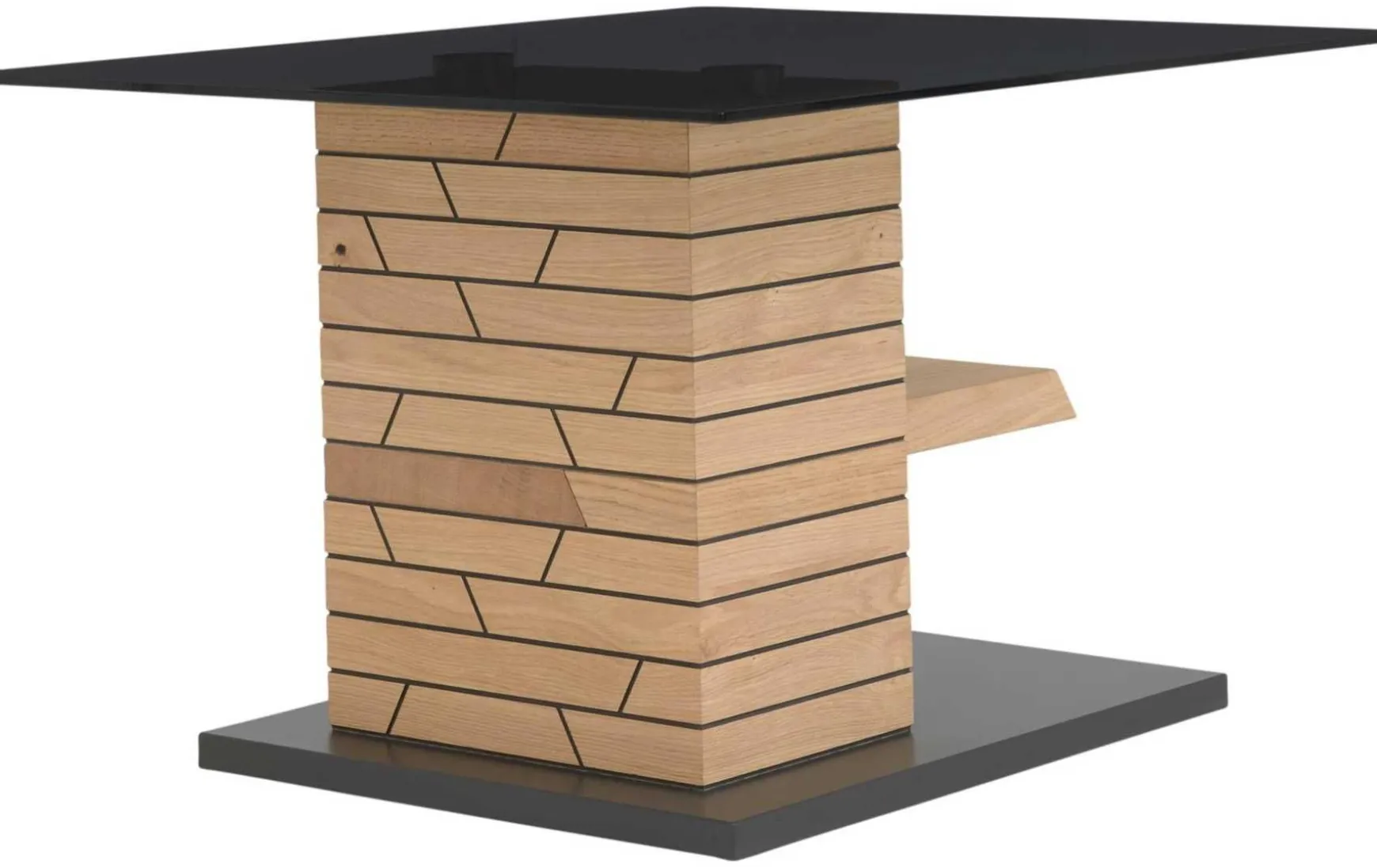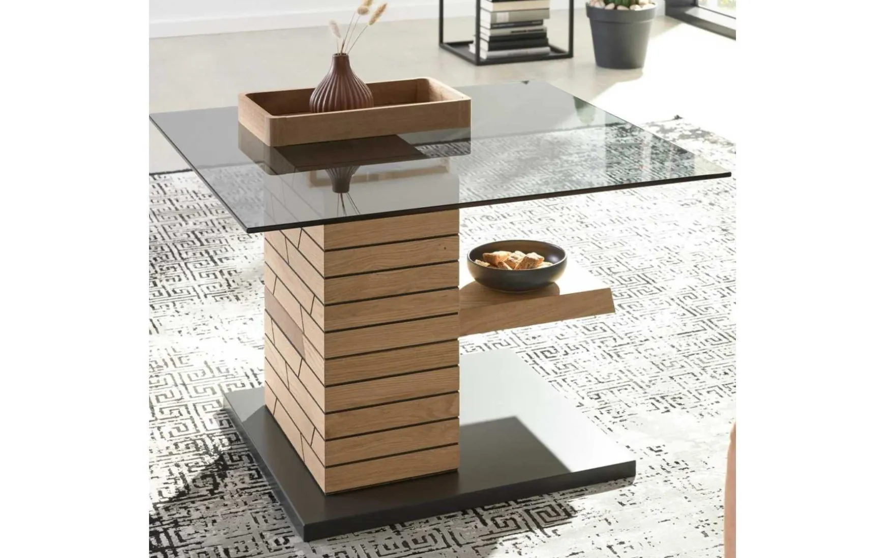 Der edle Couchtisch verbindet pure Eleganz mit einladender Natürlichkeit. Seine Platte aus grauem Parsolglas sowie der Korpus in massiven Hirnholzblockstreifen sorgen für einen zeitlosen Stil. Dazu bildet schiefer-schwarzer Mattlack eine harmonische Ergänzung. Damit passt das Design zu facettenreichen Einrichtungsstilen und Farben Ihres Interieurs: ob als Sofatisch oder als praktisches Beistellmöbel mit extra Ablagefläche. Der Glasplattentisch bringt Maße von ca. 70 x 46 x 70 cm (LxHxT) mit, während die Plattenstärke ca. 8 mm beträgt.