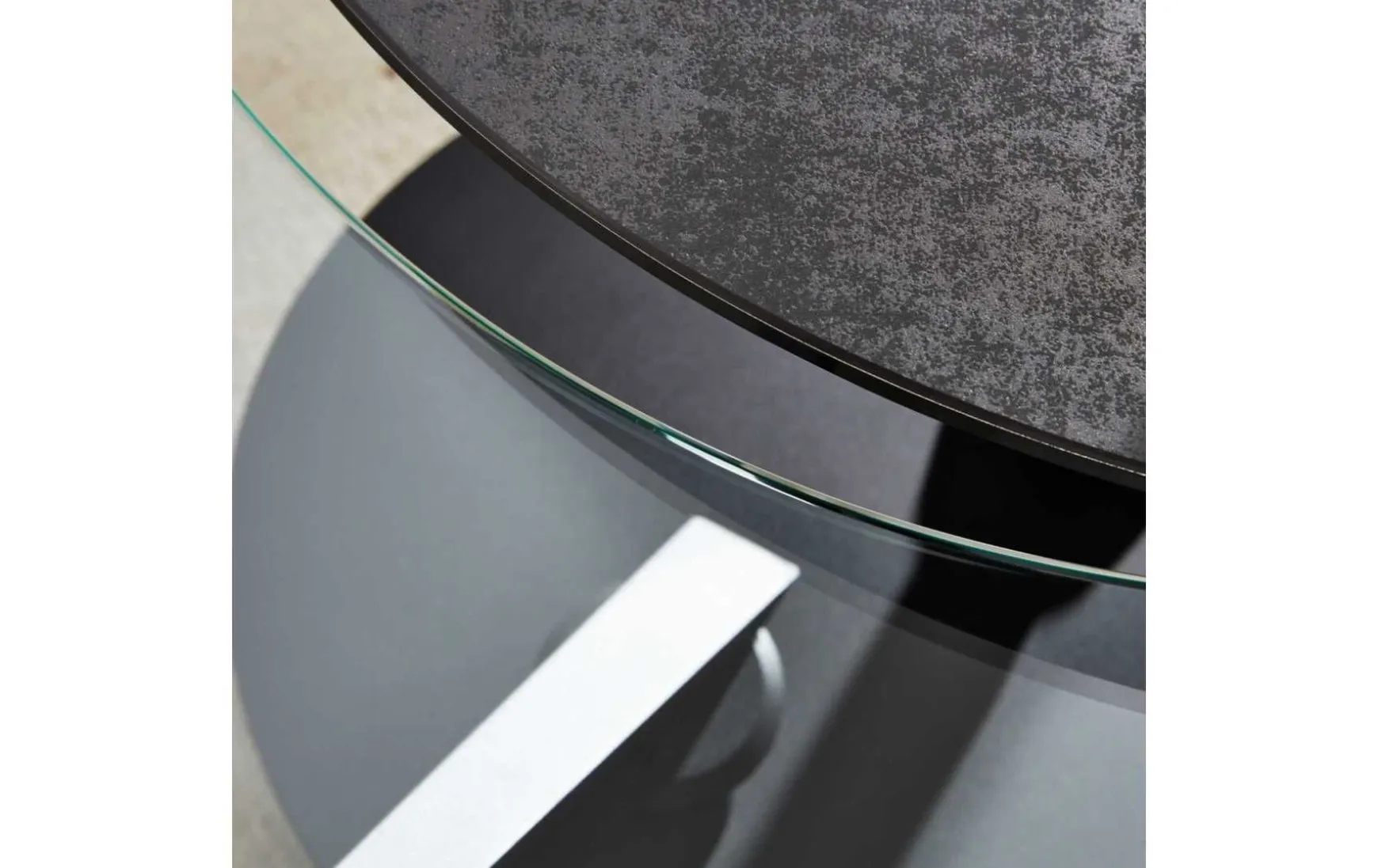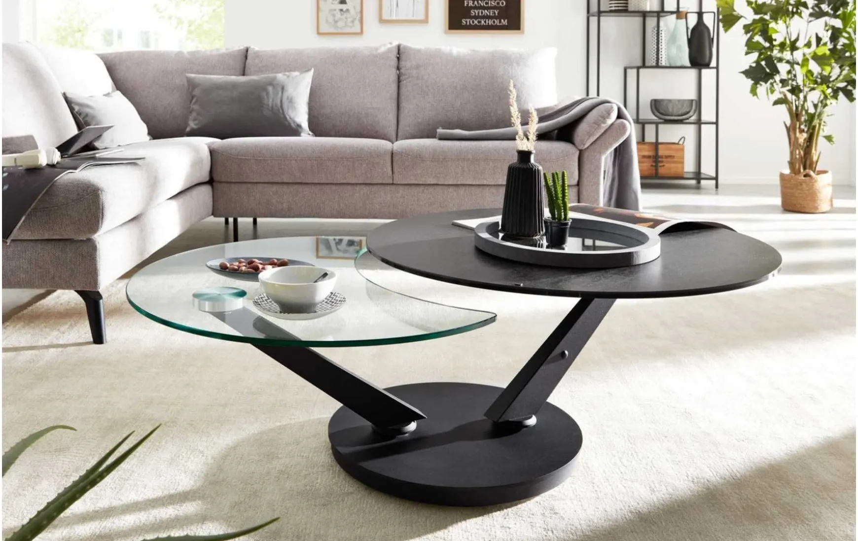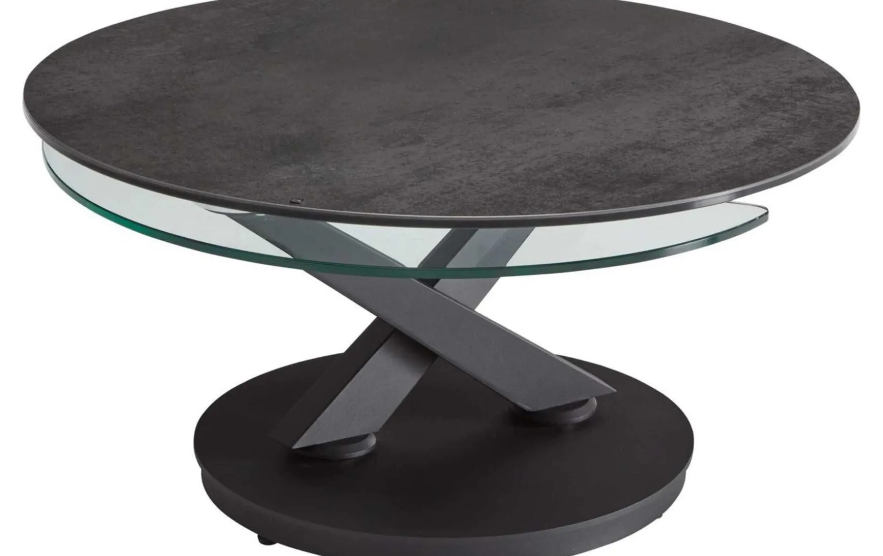 Mit der trendig titanfarbenen Keramiktischplatte, der Erweiterung in Klarglas und dem schwarz lackierten Stahlgestell verkörpert der Funktionscouchtisch moderne Eleganz. Dabei setzt die edel marmorierte Optik der Tischplatte ebenso einen attraktiven Akzent wie die spezielle Gestaltung des Gestells. Der Durchmesser der Keramiktischplatte beläuft sich auf ca. 80 cm, bei einer Höhe von ca. 40 cm. Wenn die Keramik- und die Glastischplatte synchron ausgefahren werden, beträgt der Gesamtdurchmesser bis zu ca. 125 cm. Als Highlight des Tisches fungiert der Drehmechanismus: Bei Bedarf können Sie beide Tischplatten nach außen drehen und in eine beliebige Position bringen, um mehr Abstellfläche verfügbar zu machen. Dies ist etwa praktisch, wenn Sie Gäste empfangen und gemütlich im Wohnzimmer Kaffee oder Tee servieren möchten. Funktionell begeistert die ausgeprägte Robustheit der Materialien. Dank der enormen Widerstandsfähigkeit des Stahls sowie der kratz- und schlagfesten Eigenschaften der 3 mm starken Keramik, die für besonders hohe Stabilität auf 6 mm Glas verklebt ist, bringt der Sofatisch beste Voraussetzungen mit, um Ihr Wohnzimmer jahrelang in exzellentem Zustand zu bereichern. Selbst hohe Temperaturschwankungen verträgt er. Mit einer Stärke von 10 mm präsentiert sich auch die Klarglasplatte äußerst stabil.
