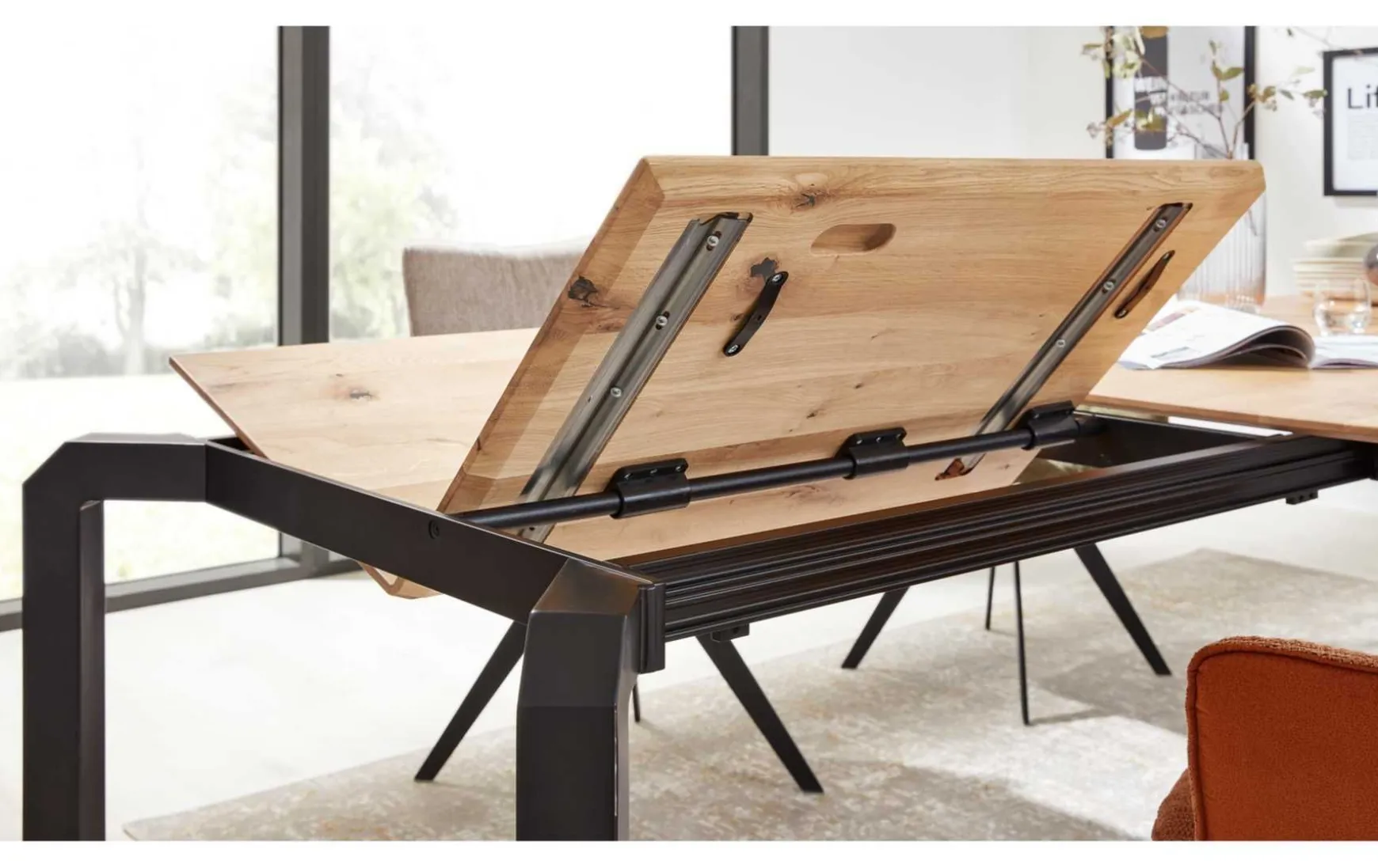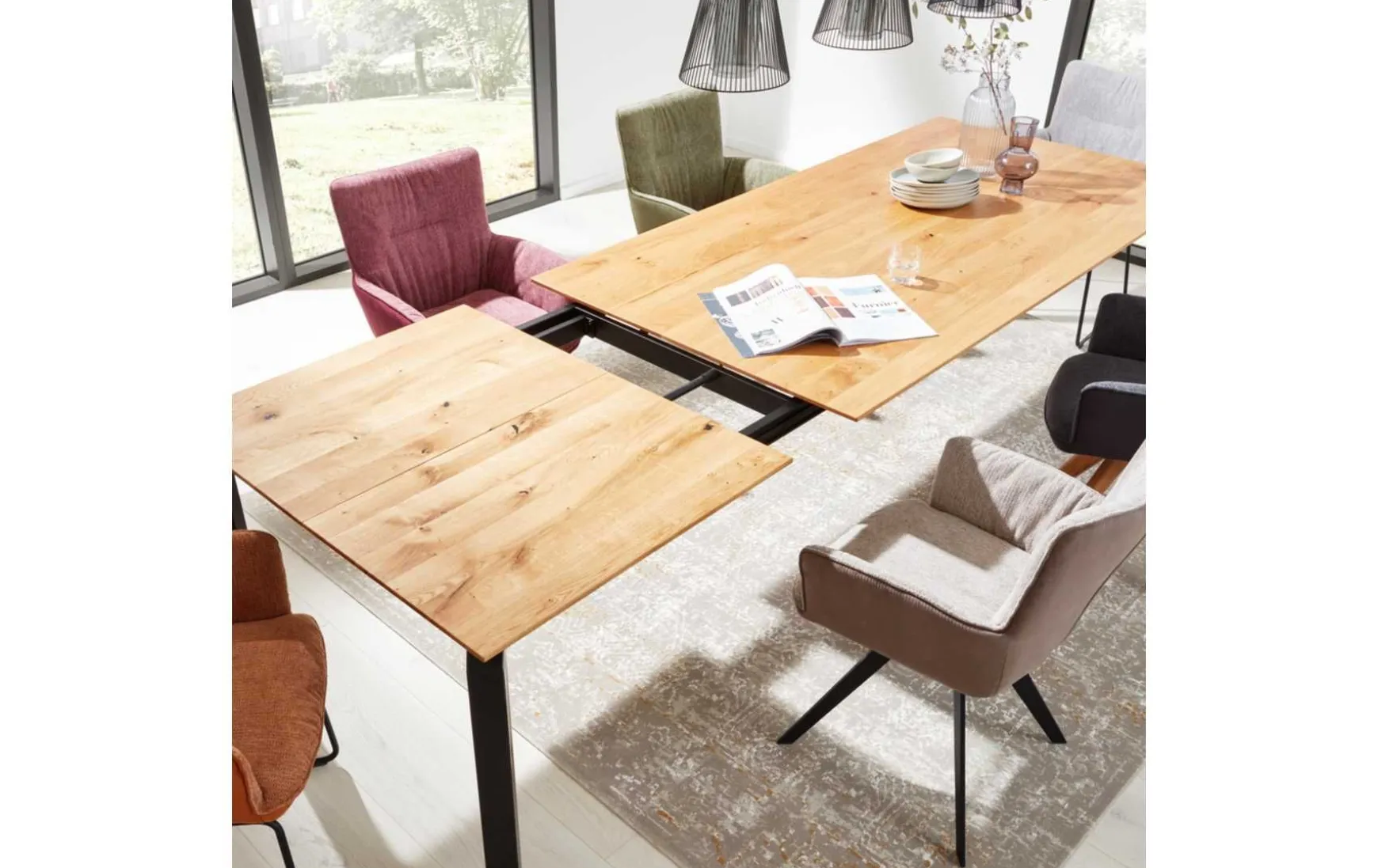 Dieser Esstisch ist ein Schmuckstück für dein Esszimmer. Mit seinem schwarzen Eisengestell und der filigranen Tischplatte aus massiver Charakter-Eiche verleiht er deinem Raum einen zeitlosen und natürlichen Charme. Die Kombination aus Holzfarben und Schwarz verleiht dem Tisch eine edle und moderne Optik, die in nahezu jedes Einrichtungskonzept passt. Das robuste und langlebige Material macht den Tisch zu einem zuverlässigen Begleiter für viele Jahre. Besonders praktisch ist die Ausziehfunktion des Tisches. Mit Hilfe von Frontslide und Falteinlage kann der Tisch um ca. 80 cm verlängert werden, perfekt, um Gäste zu empfangen und zusätzlichen Platz zu schaffen. Die integrierten Rollen machen das Ausziehen des Tisches besonders einfach und komfortabel. Mit einer Läange von 200 cm und einer Tiefe von 100 cm bietet der Esstisch ausreichend Platz für deine Familie und Freunde, um gemeinsam schöne Stunden zu verbringen. Erlebe zeitlose Eleganz und praktische Funktionalität vereint in einem Tisch