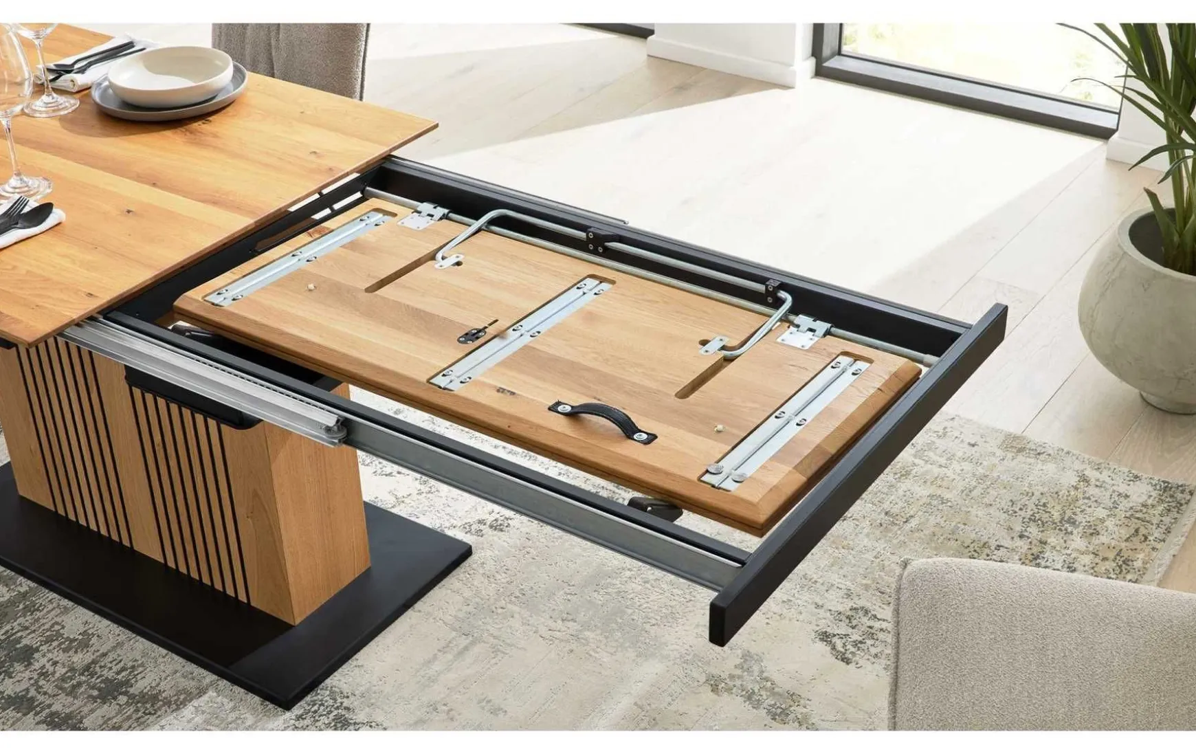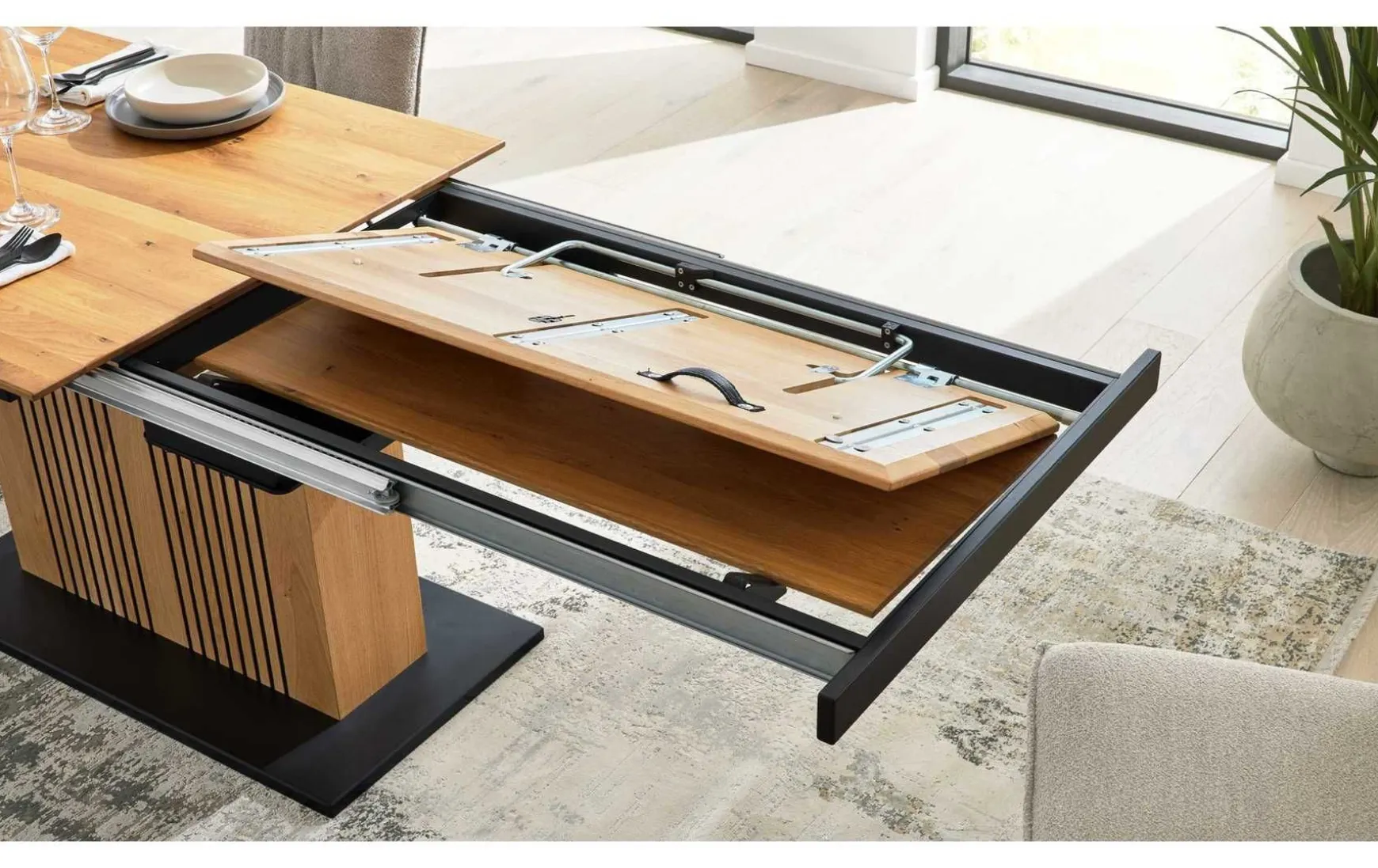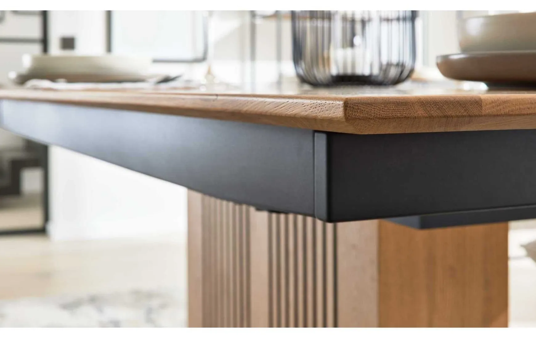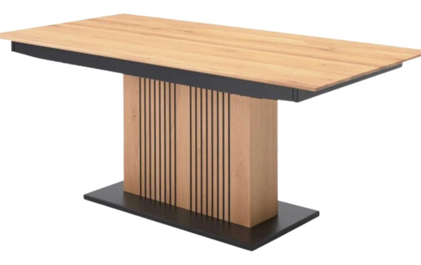 Der beeindruckende Esstisch ist aus hochwertigen Materialien hergestellt, erstklassig verarbeitet und stilvoll designt. Als Basis dient ein robustes Säulengestell in Lamellenoptik und schwarzer Bodenplatte. Es verleiht dem Tisch die nötige Stabilität und harmoniert optisch hervorragend mit der Tischplatte, die mit einem Hydro-UV-Hartwachs Öl finish versehehen ist. Durch das edle Holz und die markante Maserung strahlt der gesamte Esszimmertisch natürlichen und warmen Charme mit uriger Rustikalität aus. Er bringt ein Stück Natur in Ihre Küche beziehungsweise Ihr Speisezimmer. Die Maße des Esstisches aus der Interliving Esszimmer Serie 5106 belaufen sich auf ca. 180 – 280 x 76 x 100 cm (LxHxB).