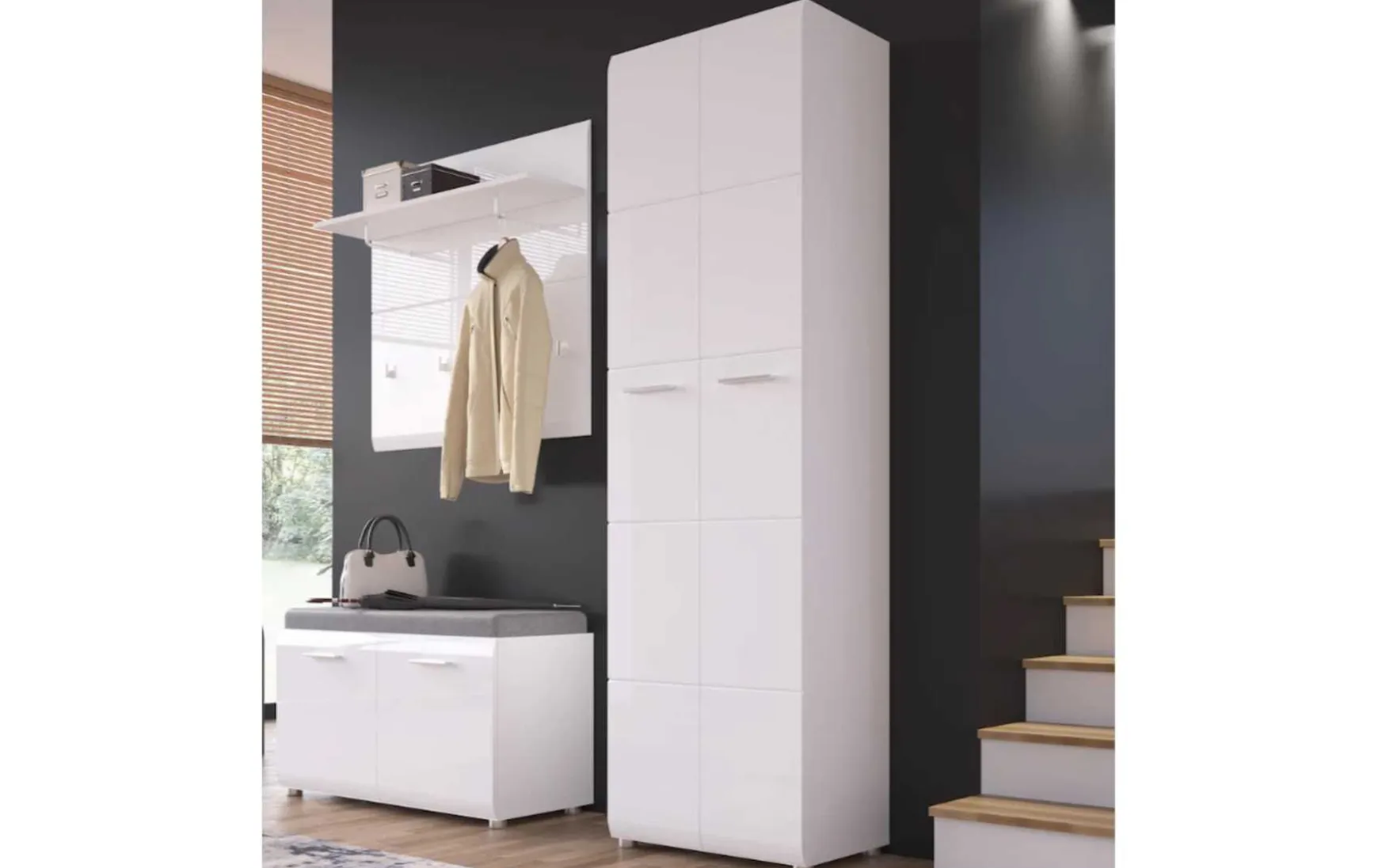 Dieser stilvolle Garderobenschrank bietet eine perfekte Kombination aus Funktionalität und modernem Design. Mit seinen hochglanzlackierten Fronten und der hochwertigen Verarbeitung setzt er optische Akzente in Ihrem Eingangsbereich.