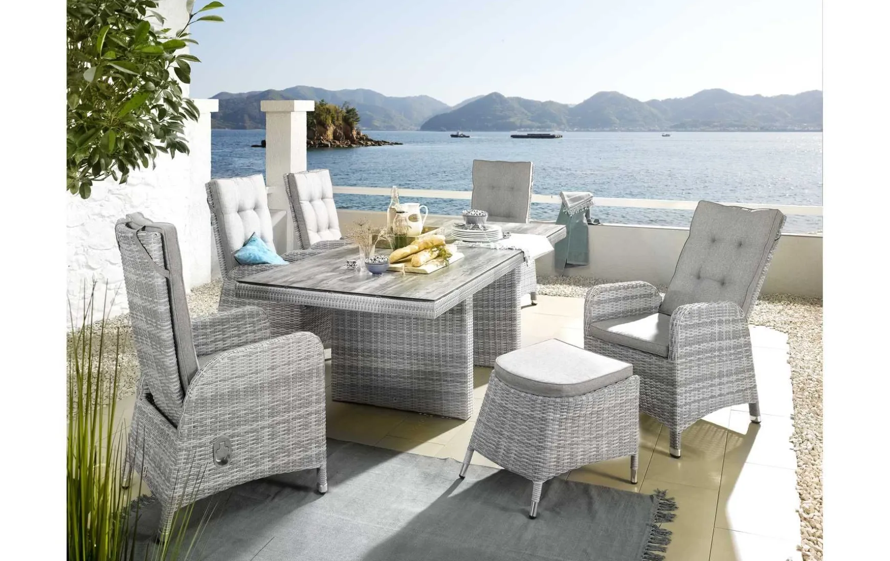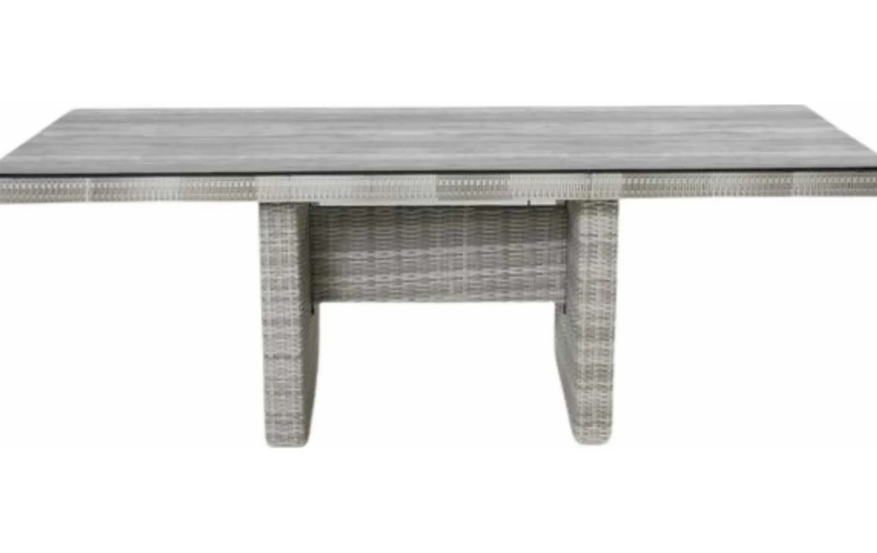 Gartentisch mit 220 x 100 cm Spraystone-Tischplatte, Rahmen aus strapazierfähigen grau-mix Kunststofffasern in Rattanoptik mit verstellbaren Fußstützen zum Einsatz auf unebenen Untergründen