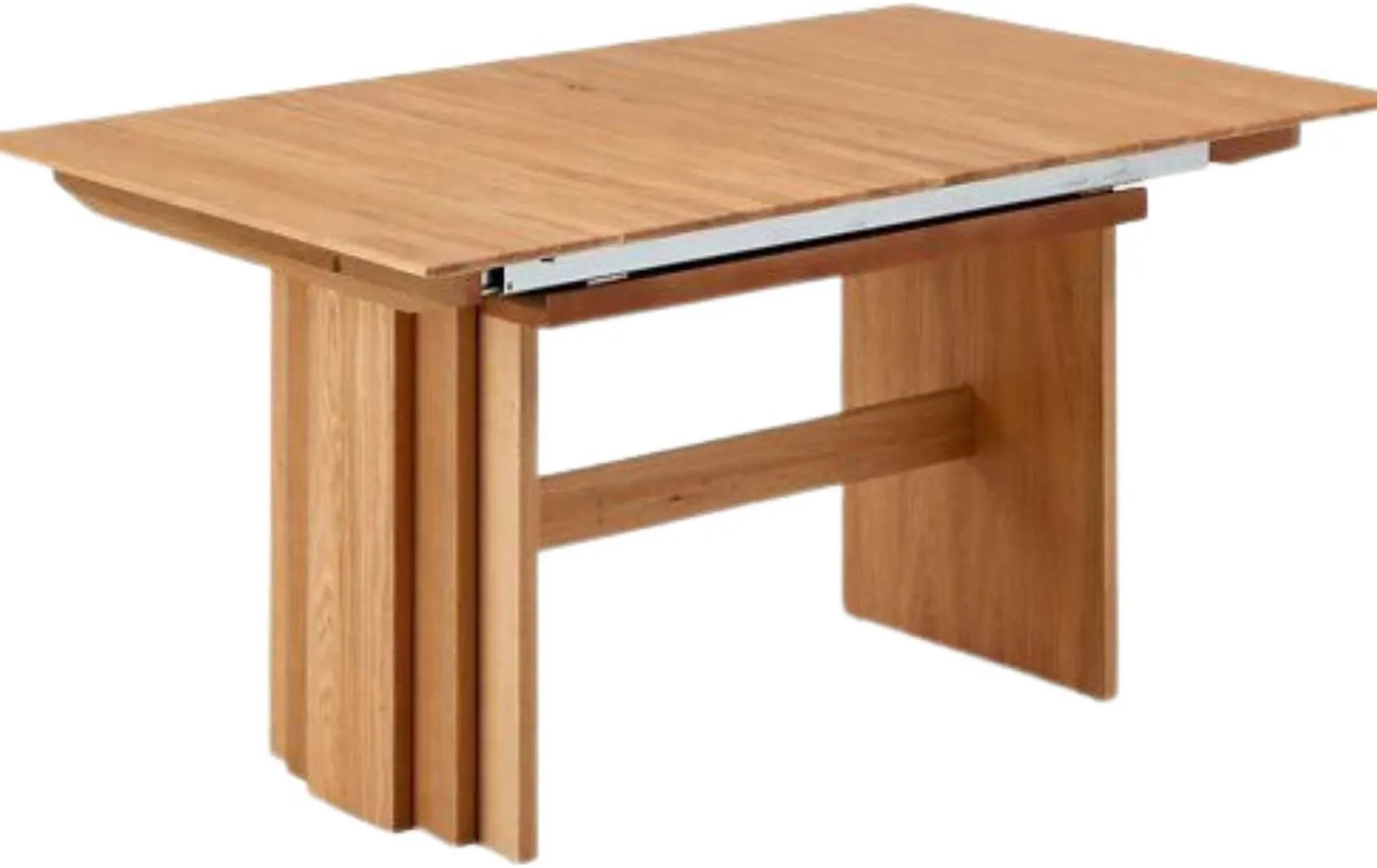 Dieser moderne Kulissentisch überzeugt durch modernster Optik und schafft eine wohnliche Atmosphäre in Ihrem Esszimmer. Das Oberteil des Ttisches besteht aus massiver Wildeiche, der Tisch besticht durch einem Facetten-Plattenprofil. Beim Untergestell setzt der Hersteller auf ein Wangengestell aus einem Holzfurnier, ebenfalls in Wildeiche.