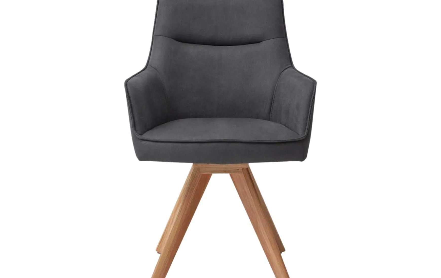Dieser moderne Schalensessel bringt natürliches und warmes Flair in den Raum. Dafür zeichnet das Stativgestell mit den vier massiven geölten Wildeichefüßen verantwortlich. Perfekt darauf abgestimmt ist der klassisch-anthrazitfarbene Mikrofaserbezug. Durch die puristische Farbgebung und das exzellente Material verleiht er dem Esszimmersessel eine elegante Ausstrahlung mit dem gewissen Etwas. Ein weiteres optisches Highlight bildet der markante Quereinzug im Rücken. Funktional begeistert neben der herausragenden Verarbeitungsqualität und Robustheit vor allem der hohe Sitzkomfort des Schalenstuhls. Er ist mit bequemen Armlehnen ausgestattet, deren Höhe ca. 65 cm beträgt. Darüber hinaus sorgt die Haptik der Mikrofaser zusammen mit der angenehmen Polsterung für die gewünschte Gemütlichkeit beim Essen und Zusammensitzen mit Familie und Freunden. Zudem bietet der um 180 Grad drehbare Armlehnstuhl eine praktische Rückholfunktion. Die Maße des attraktiven Schalensessels belaufen sich auf ca. 61 x 89 x 64 cm (BxHxT); der Sitz ist ca. 48 cm hoch, ca. 47 cm breit und ca. 43 cm tief. Alternativ steht der rundum überzeugende Polsterstuhl mit einer anderen Gestellvariante und/oder ohne Rückholfunktion zur Wahl.
