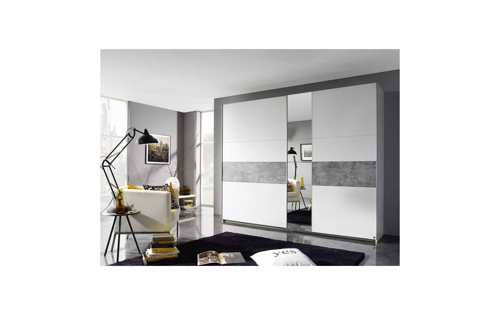 Der moderne 2-türige Schwebetürenschrank in Weiß/Stone Grey mit Teilspiegelfront überzeugt durch ein elegantes Design und großzügigen Stauraum. Mit seinen Maßen von ca. 261 × 59 × 210 cm (Breite / Tiefe / Höhe) bietet der Schrank viel Platz für Kleidung und Accessoires und fügt sich harmonisch in moderne Schlafzimmer ein. Die Kombination aus alpinweißem Korpus, Stone-Grey-Fronten und integriertem Spiegel sorgt für eine helle, zeitlose Optik und lässt den Raum größer wirken. Im Inneren ist der Schrank mit 3 Kleiderstangen und 3 Einlegeböden ausgestattet, während eine Türendämpfung sowie passende Inneneinteilungen gegen Mehrpreis erhältlich sind. Gefertigt aus robustem Holzwerkstoff mit pflegeleichter Dekoroberfläche, lässt sich der Schrank einfach mit einem trockenen Staubtuch reinigen. Mit einem Gewicht von ca. 166,44 kg und einem Stauraumvolumen von ca. 349 l bietet dieser Schwebetürenschrank eine gelungene Kombination aus Funktionalität, Design und Qualität.