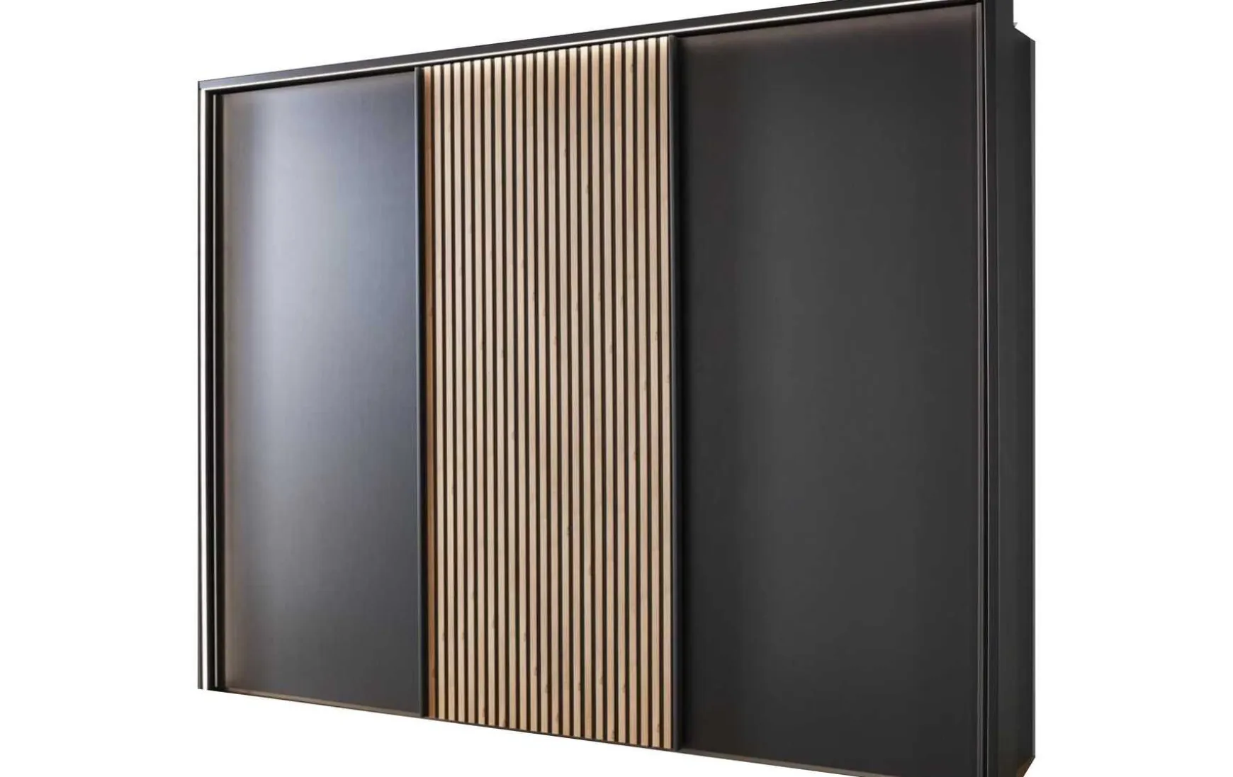 Mit diesem Schwebetürschrank bekommen Sie einen edlen Kleiderschrank mit Korpus und Front in Graphit-Dekor, dabei ist 1 Tür vom Kleiderschrank in Bianco-Eiche-Nachbildung mit interessanten Lamellen enthalten. Die Griffleisten von diesem Schlafzimmerschrank sind richtig passend zum Schrank, und zwar in Graphit-Dekor.