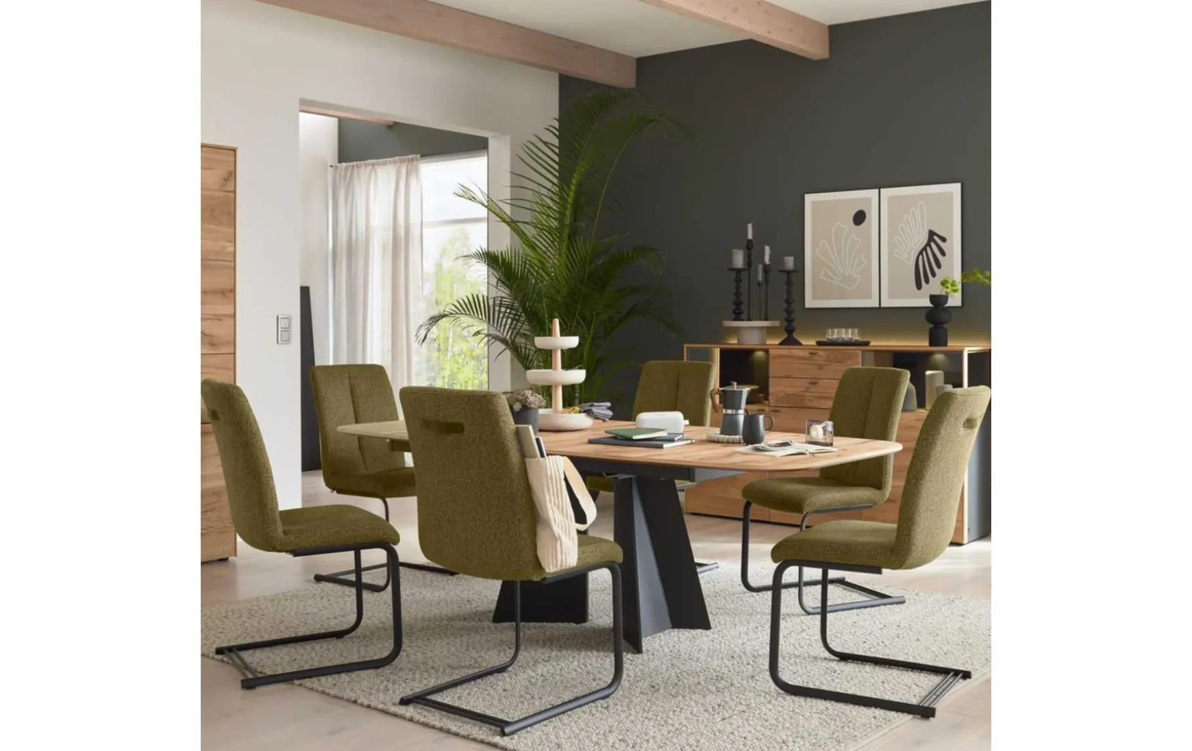 Mit dem olivfarbenen Stoff und dem matt anthrazitfarbenen Metallgestell strahlt dieser Schwingstuhl moderne Eleganz aus. Durch die Kunststoffgleiter unter dem Gestell lässt er sich bodenschonend verschieben. Neben den optischen Merkmalen überzeugen auch die Komforteigenschaften. Der Freischwinger mit einer Sitzhöhe von ca. 50 cm ist bequem gepolstert und punktet mit der angenehmen Haptik des Bezugstoffs. Er misst ca. 48 x 97 x 63 cm.