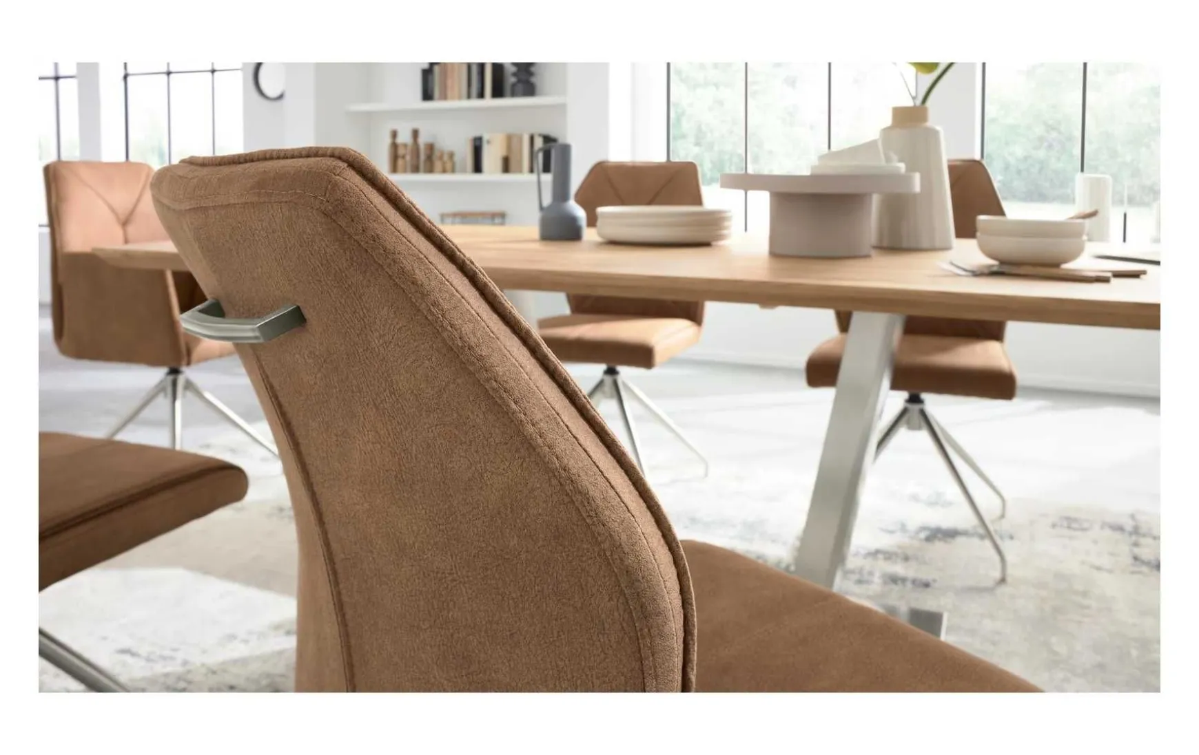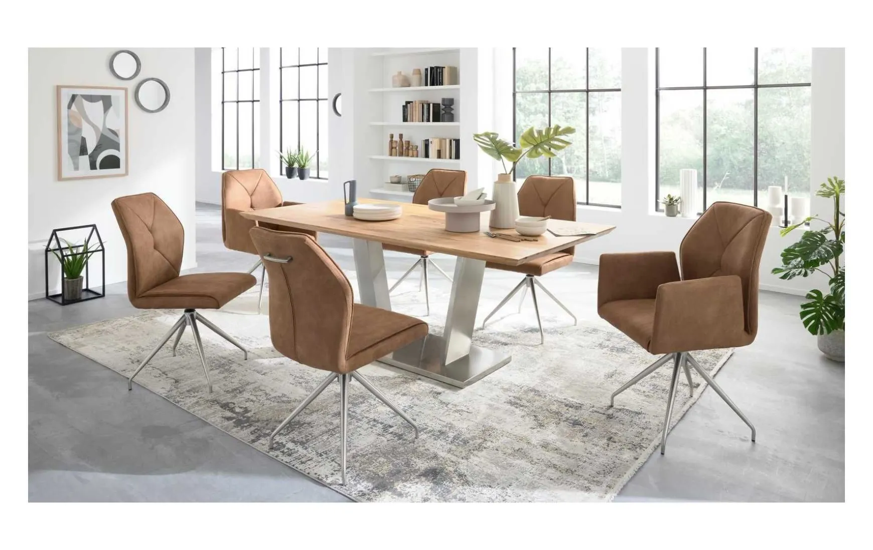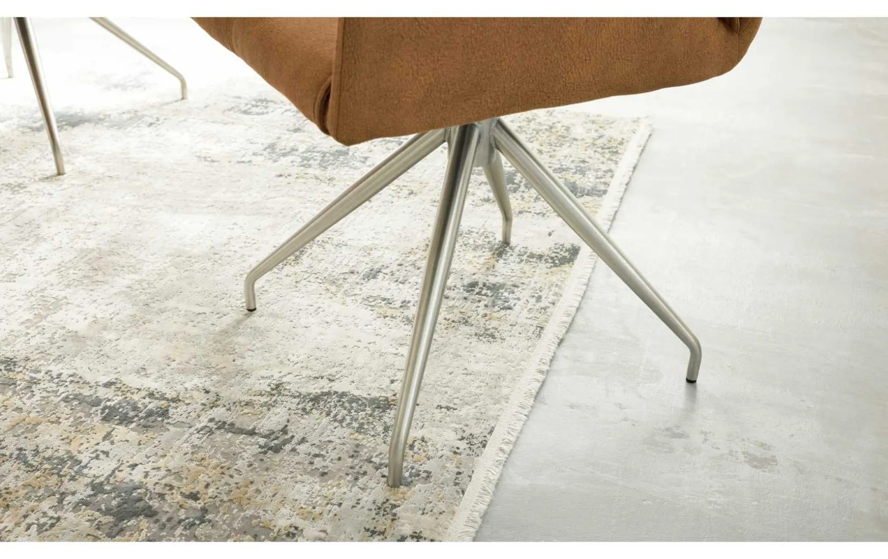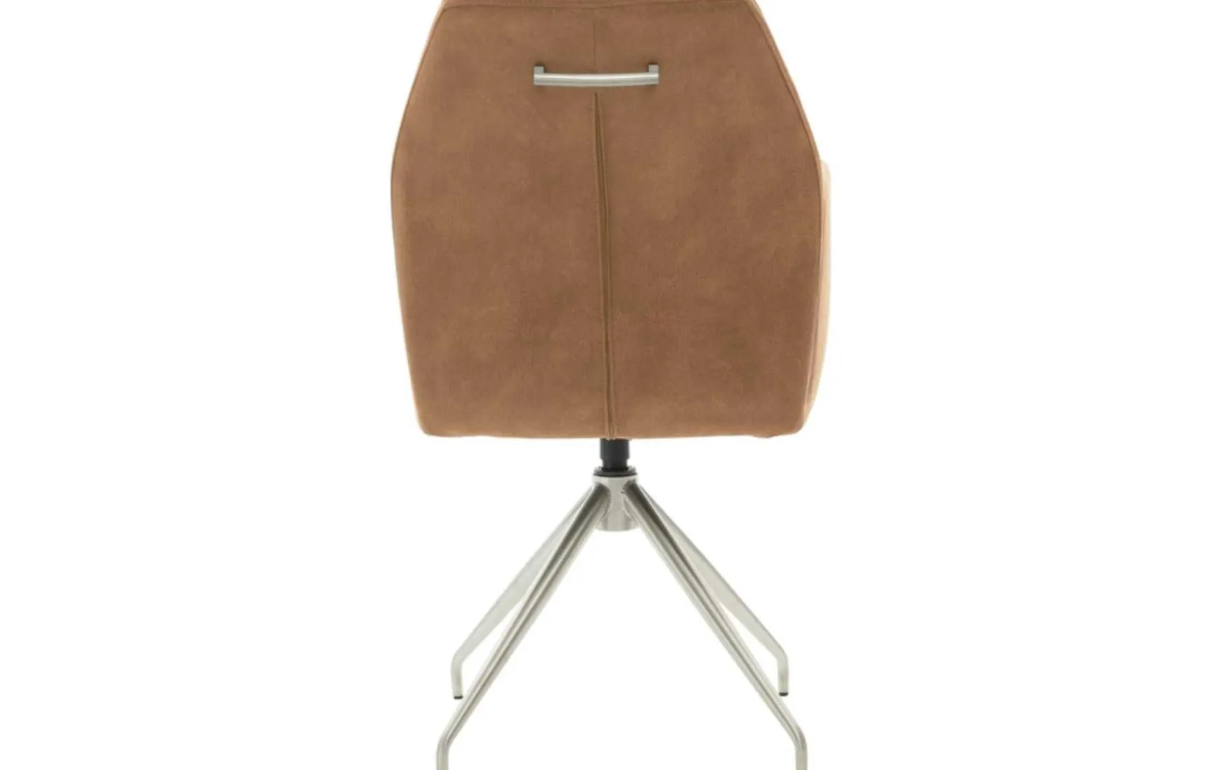 Der Polsterstuhl mit Drehfunktion kombiniert eine mit bernsteinfarbener Mikrofaser im Wildlederlook bezogene Sitzschale mit einem robusten Stativgestell in gebürstetem Edelstahl. Durch die hochwertigen Materialien ist er extra stabil und langlebig. Optisch präsentiert sich der Esszimmerstuhl modern und elegant. Seine Maße belaufen sich auf ca. 46 x 98 x 51 cm (BxHxT). Dank der angenehmen Haptik der Mikrofaser, der viskoelastischen Komfortpolsterung auf einer Nosagunterfederung und der komfortabel wattierten und gesteppten Rückenlehne sitzen Sie auf dem Stuhl außerordentlich bequem. Zudem begeistert die 360-Grad-Drehbarkeit des Sitzes mit automatischer Rückstellfunktion: Nach dem Aufstehen geht der Drehstuhl von selbst in die Ausgangsposition zurück.