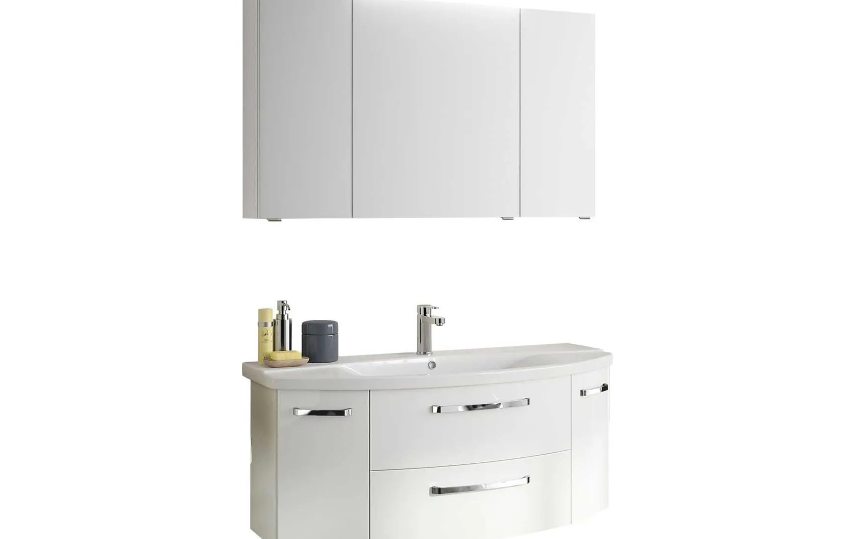 - Bestehend aus: 1x Spiegelschrank mit 3 Drehtüren, einfach verspiegelt, 6 Glaseinlegeböden, Schalter/Steckdose, B/H/T: ca. 120/70/17 cm; 1x LED-Aufsatzleuchte, B: ca. 60 cm; 1x Keramikwaschtisch in weiß mit Armaturbohrung und integriertem Überlauf, B/H/T: ca. 120,5/4,5/48 cm; 1x Einhebelmischer in Chrom Glanz; 1x Waschtischunterschrank mit 2 Drehtüren, 2 Auszüge, B/H/T: ca. 116/49/46 cm; 1x Midischrank mit 1 Drehtür, 2 Auszüge, 2 Glaseinlegeböden, Abdeckplatte, Anschlag beidseitig wechselbar B/H/T: ca. 30/121,2/33 cm; 2x Handtuchhalter in Chrom Glanz, 1-armig, eckig, zur Wandmontage, Mindestplatzbedarf ca. 12 cm B/H/T: ca. 4,5/4,5/32,5 cm