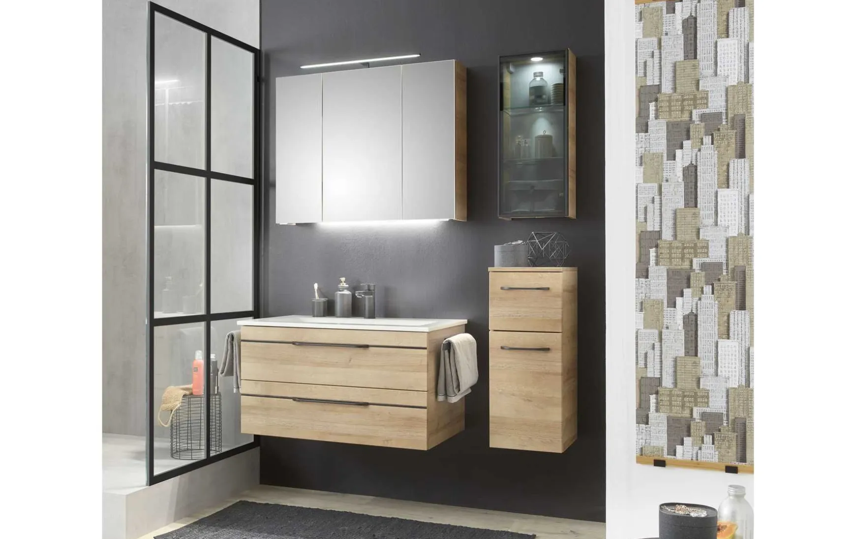 - Bestehend aus: 1x Spiegelschrank mit 3 Drehtüren, einfach verspiegelt, 6 Glaseinlegeböden, Schalter/Steckdose, B/H/T ca. 90/70,3/17 cm; 1x LED-Aufsatzleuchte in Schwarz Matt, B: ca. 60 cm; 1x Mineralmarmor-Waschtisch in weiß mit Armaturbohrung und integriertem Überlauf, B/H/T: ca. 92,5/7,6/51,2 cm; 1x Waschtisch-Unterschrank mit 2 Auszügen und Kosmetikeinsatz im oberen Auszug, B/H/T: ca. 88/48/49 cm; 1x Highboard mit 1 Auszug, 1 Drehtür (rechts angeschlagen), 1 Glaseinlegeboden, 1 Abdeckplatte, B/H/T: ca. 30/73/33 cm; 1x Vitrinen-Wandschrank mit Rauchglastür schwarz (rechts angeschlagen), 2 Glaseinlegeböden, inkl. LED-Spot mit Touchschalter, B/H/T: ca. 30/70,3/17 cm; 2x Handtuchhalter in Schwarz Matt zur Korpusmontage, 1-armig, Mindestplatzbedarf: ca. 12 cm, T: ca. 32,5 cm