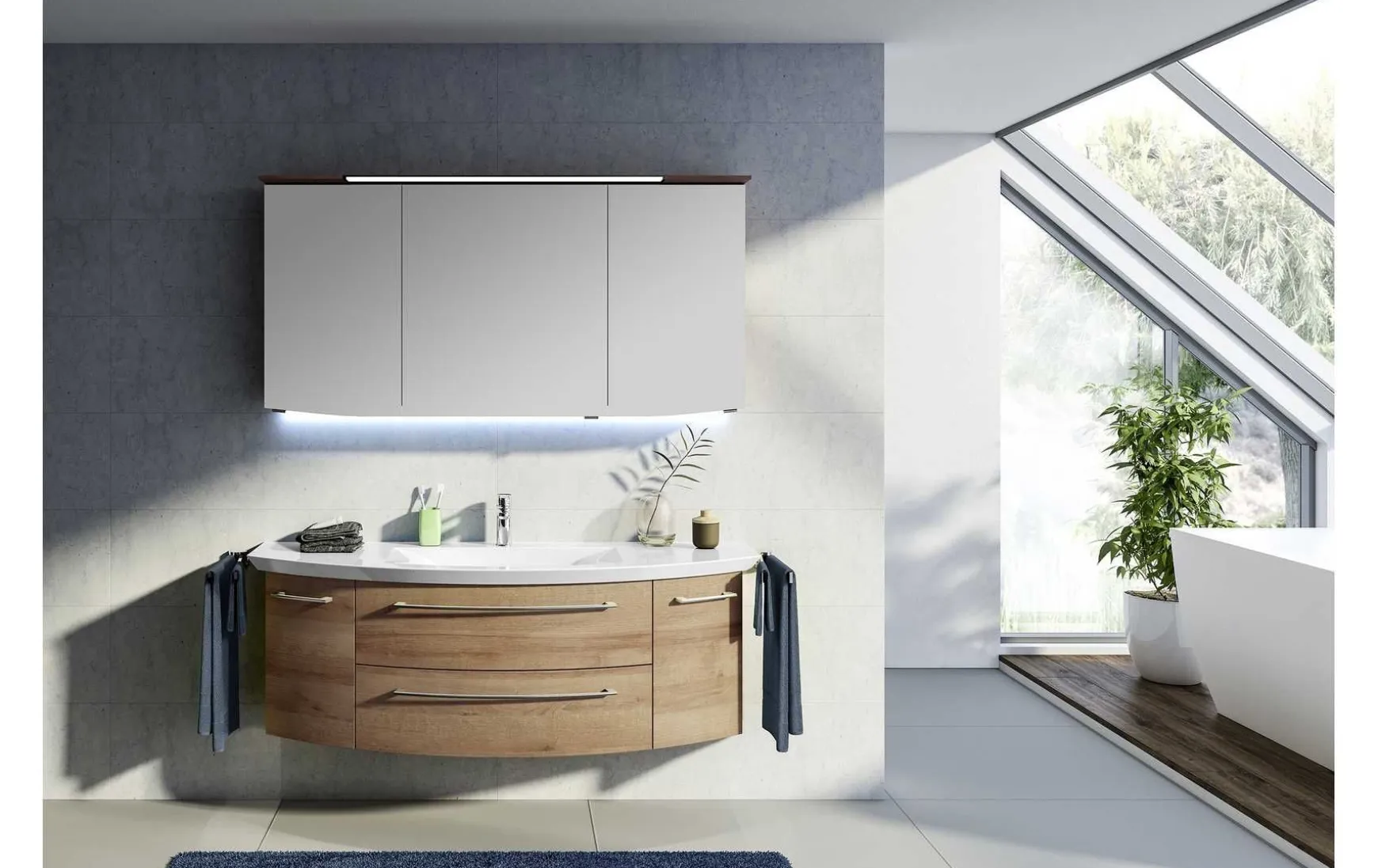 - Im Preis enthalten: 1x Spiegelschrank mit LED-Beleuchtung im Kranz, 1x Mineralmarmor-Waschtisch inkl. LED-Zusatzbeleuchtung für Schattenfuge mit Bewegungssensor, 1x Einhebelmischer, 1x Waschtischunterschrank, 4x Stangengriffe