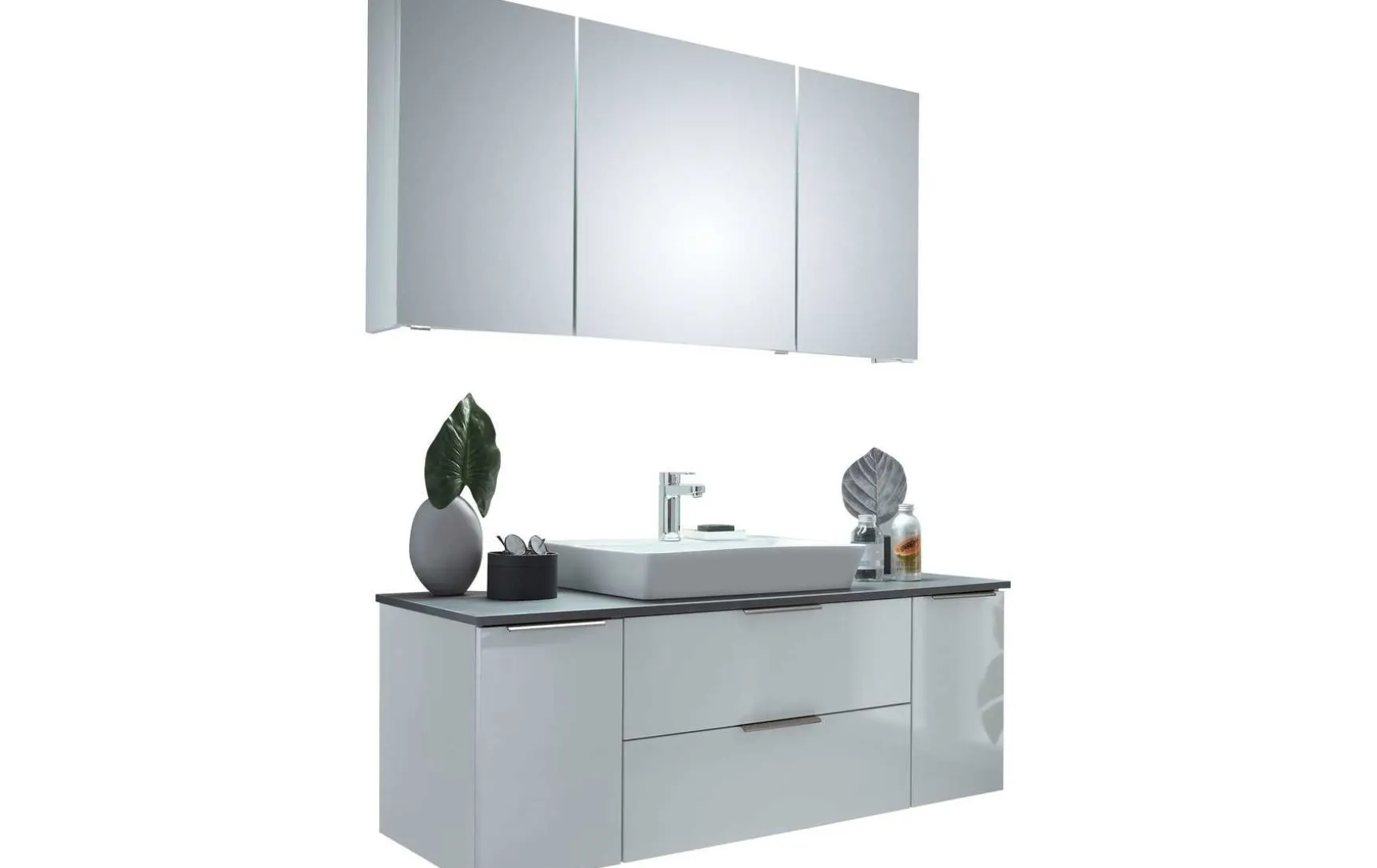 - Bestehend aus: 1x Spiegelschrank mit 3 Spiegeltüren, einfach verspiegelt, 6 Glaseinlegeböde, Schalter/Steckdose, B/H/T: ca. 140/70,3/17 cm; 1x LED-Aufsatzleuchte in Chrom Glanz, B: ca. 90 cm; 1x Keramik-Aufsatzbecken der Marke Ideal Standard in Weiß Glanz mit Armaturbohrung und integriertem Überlauf B/H/T: ca. 60/10/46 cm; 1x Einhebelmischer in Chrom Glanz; 1x Waschtischplatte inkl. Ausschnitt für Aufsatzbecken, B/H/T: ca. 137/1,8/50 cm; 1x Waschtischunterschrank mit Siphonausschnitt, 2 Auszüge, 2 Drehtüren außen, 2 Glaseinlegeböden, B/H/T: ca. 135/48.2/49 cm; 1x Handtuchhalter in Chrom Glanz zur Wandmontage, eckig, 2-armig, Mindestplatzbedarf 12 cm T: ca. 34,5 cm