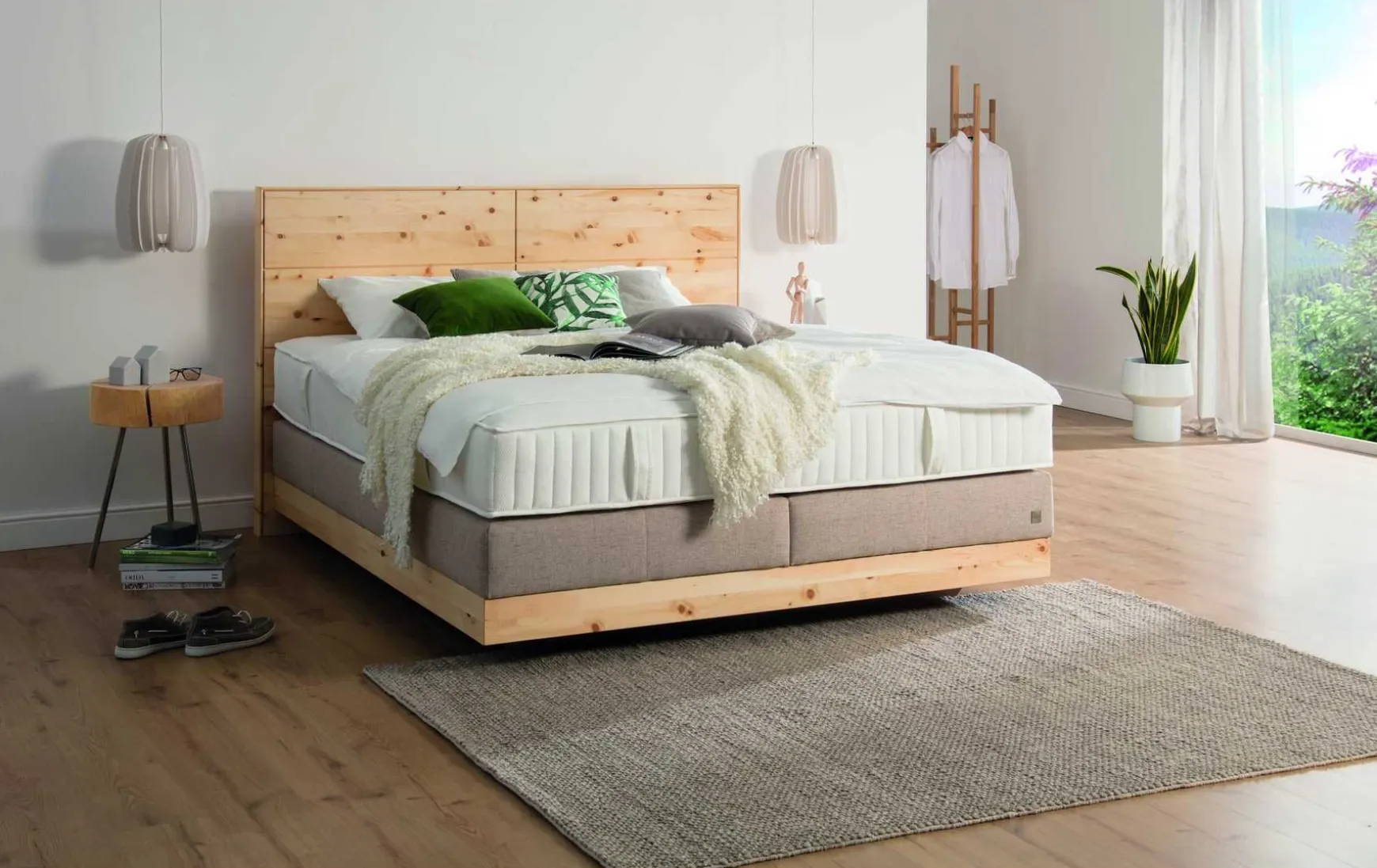 Hochwertig verarbeitetes Schlafsystem aus Österreich. Die Optik wird geprägt durch den Rahmen mit dem hochgezogenen Kopfende aus massiven Sichtholzelementen. Das Naturmaterial nimmt Wärme und Feuchtigkeit auf, sodass das Raumklima verbessert wird. Fein aufeinander abgestimmt sorgen der Boxunterbau mit einem 7-Zonen Tonnentaschenfederkern und die geschichtet aufgebaute Matratze für einen exzellenten Schlafkomfort. Die zum Bett gehörende Tonnentaschenfederkern-Matratze mit 7 Zonen steht in unterschiedlichen Härtegraden zur Verfügung.