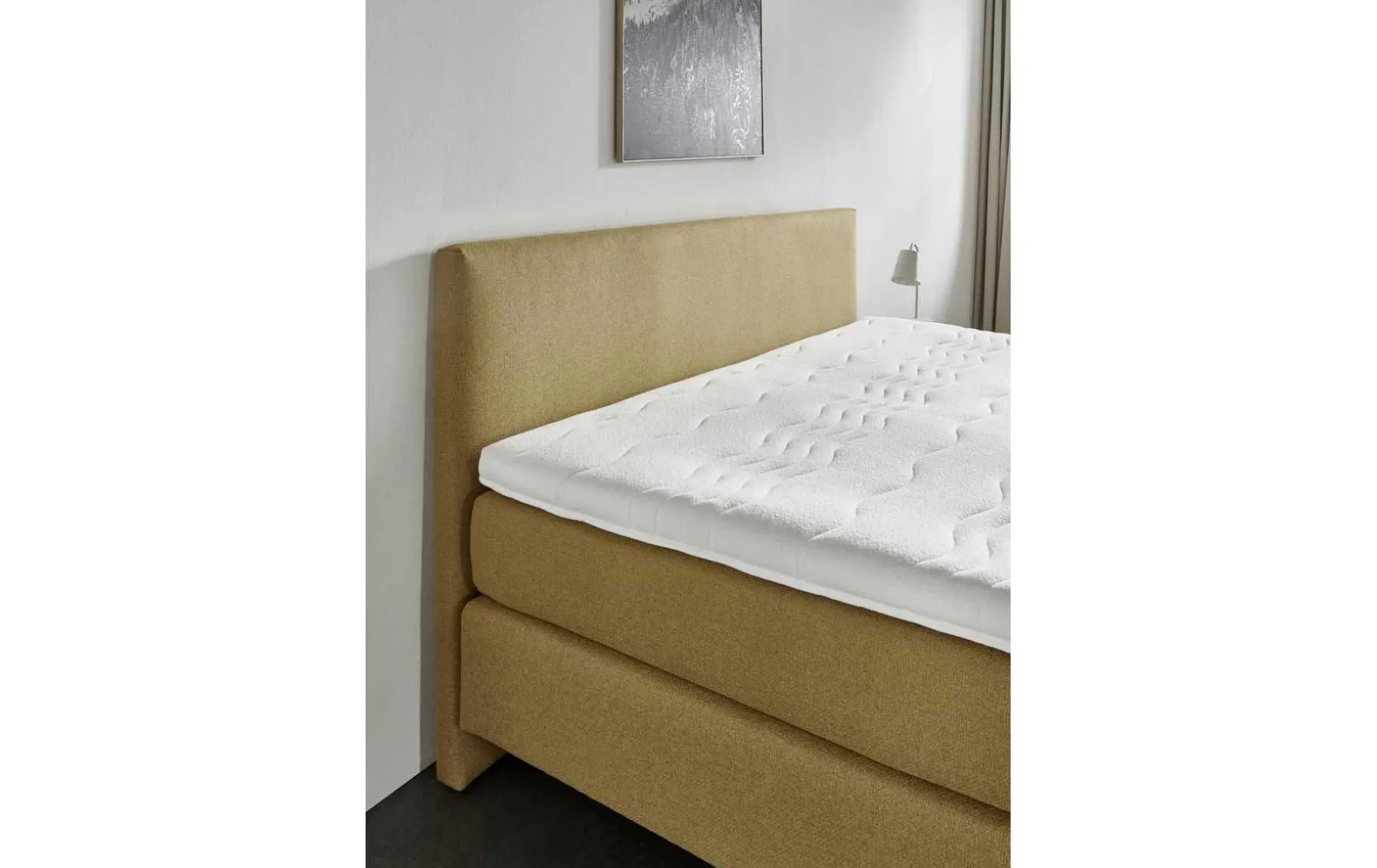 Dieses Boxspringbett bringt mit seinem ausdrucksstarken Stoffbezug im Farbton Curry eine frische und behagliche Note in jedes Schlafzimmer. Die warme Senfgelb-Nuance wirkt modern und einladend zugleich – perfekt, um Ihrem Raum mehr Persönlichkeit und Wohnlichkeit zu verleihen. Die klaren Linien und der minimalistische Look des Doppelbetts unterstreichen den modernen Charakter des Designs. Das glatte, weich gepolsterte Kopfteil mit einer Höhe von 105 cm wirkt elegant und schlicht und lädt dazu ein, sich entspannt zurückzulehnen, ideal für gemütliche Leseabende oder das Frühstück im Bett