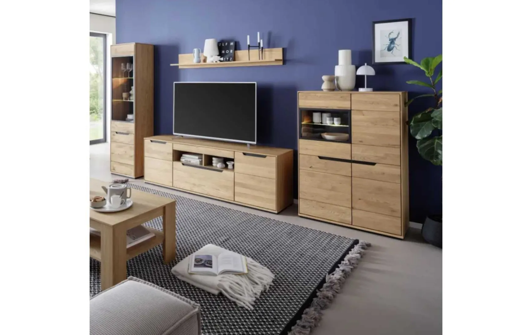 Verleihen Sie Ihrem Wohnraum mit dem Kombi-Highboard eine besondere Note aus natürlicher Schönheit und Funktionalität. Mit einer Größe von ca. 92,5 x 129,5 x 40,5 cm bietet dieses Möbelstück großzügigen Stauraum und sorgt für Ordnung in Ihrem Zuhause – ganz gleich, ob im Wohnzimmer, Essbereich oder Flur. Das Korpus in Wildeiche Nachbildung harmoniert perfekt mit der massiven Wildeiche Front, die dem Highboard eine warme und einladende Ausstrahlung verleiht. Die Kombination aus drei Holztüren und einer Holz-/Glastür sorgt für eine elegante Mischung aus geschlossenem Stauraum und durchsichtigen Bereichen, die ideal für die Präsentation von Dekoration oder Glaswaren sind.